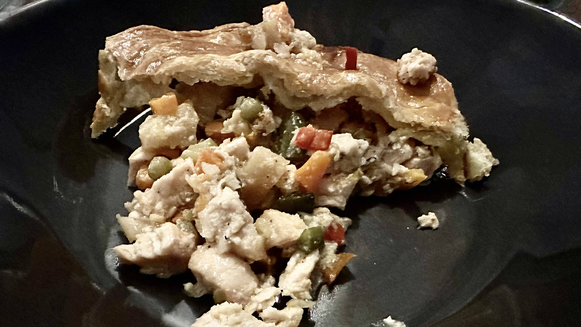 We tried both the chicken pot pie and the tomato basil soup for our dinner that night. The chicken pot pie was delicious. The top crust was flaky (wished there was also a bottom crust) and the filling included a whole series of vegetables – carrots, potatoes, peas, peppers – along with a lot of chicken. The seasoning was great. We had the tomato basil soup first and added a little half and half when reheating it, as it was a little acidic for us – as tomato soups often are.