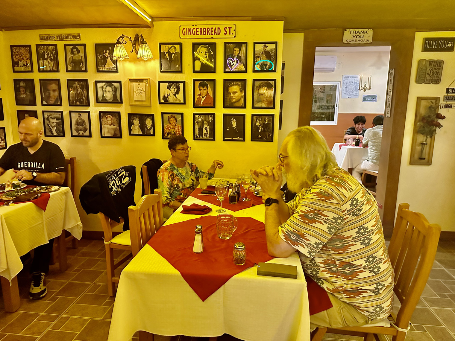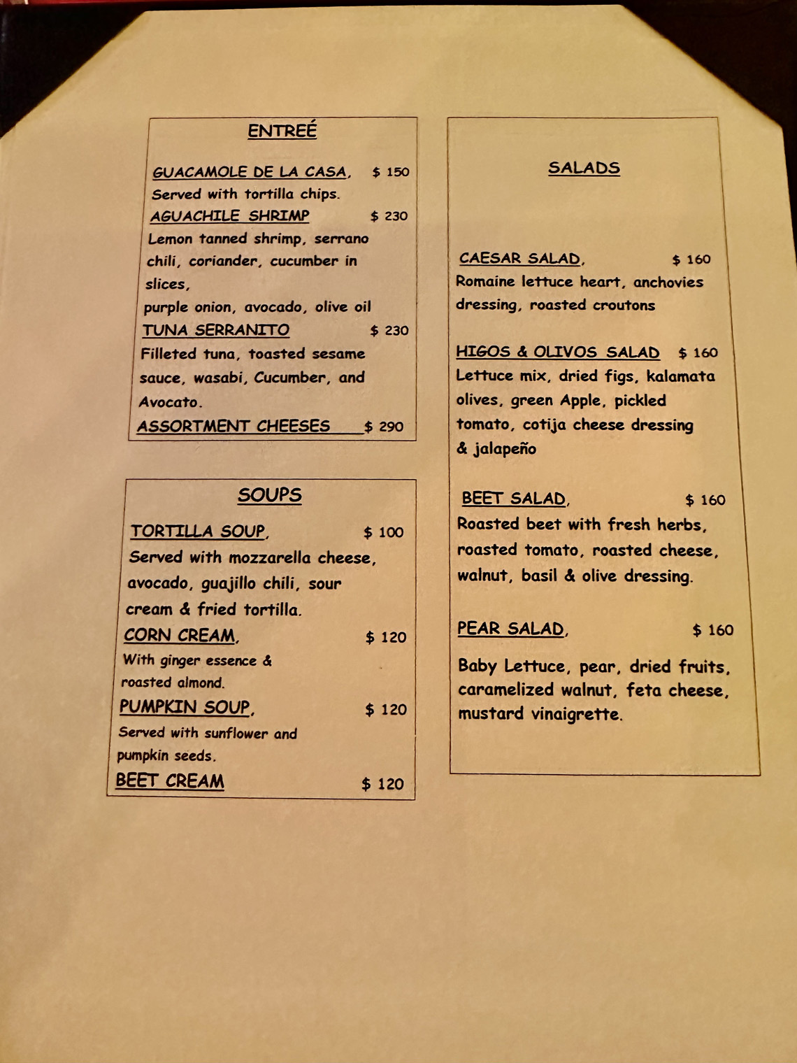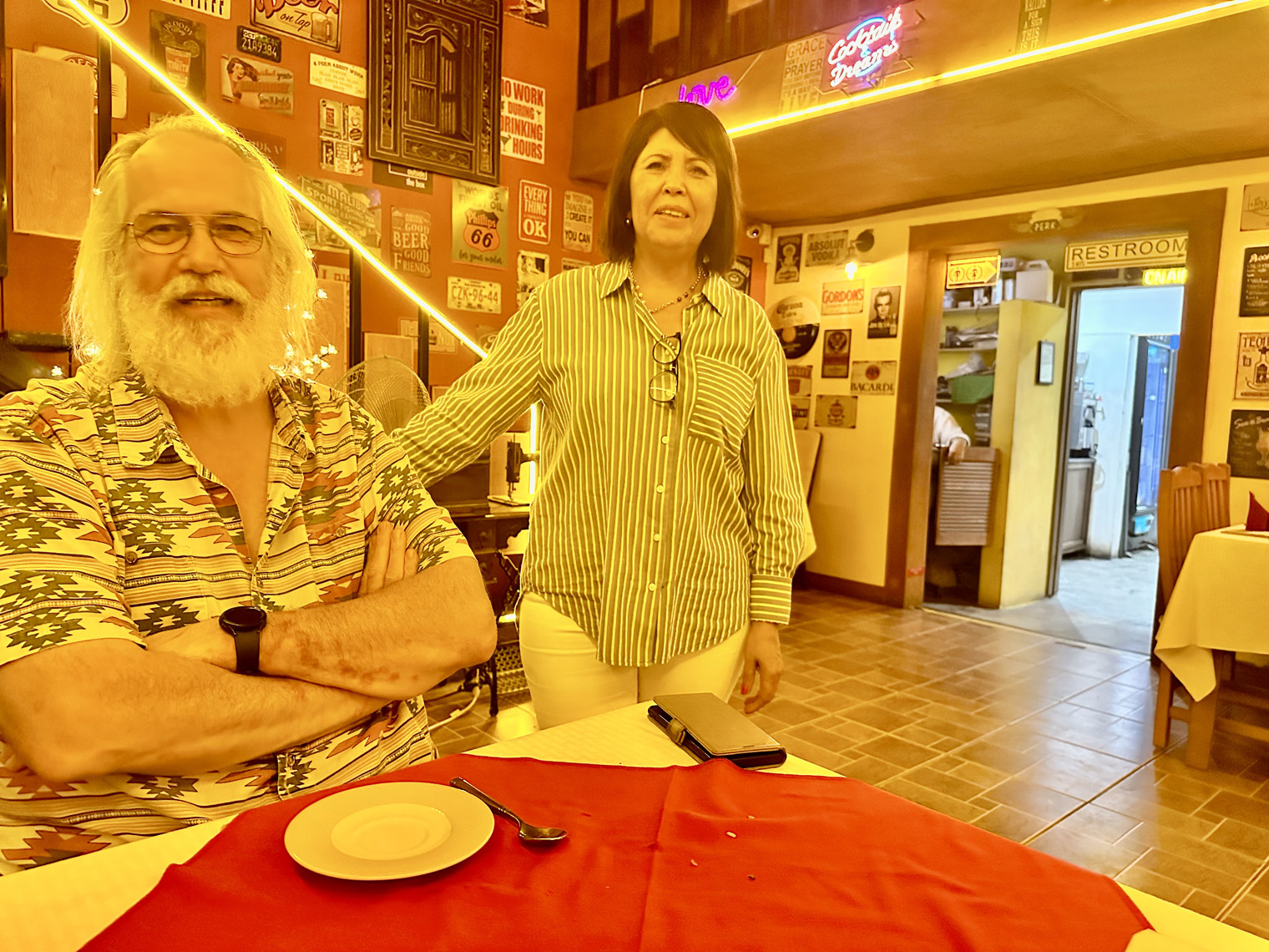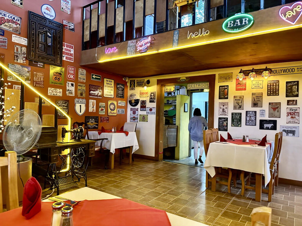 Located right at the arroyo before Artisanos, just east of Cabo San Lucas on the frontage road, Higos Y Olivos offers both inside and outside dining for breakfast, lunch, and dinner. We met our friends, Bill and Tanya and Tanya’s mother, Dianne there for dinner. Our host, Fatima was as charming as ever as we were seated in one of the two rooms inside the old house that has been converted into a restaurant.
