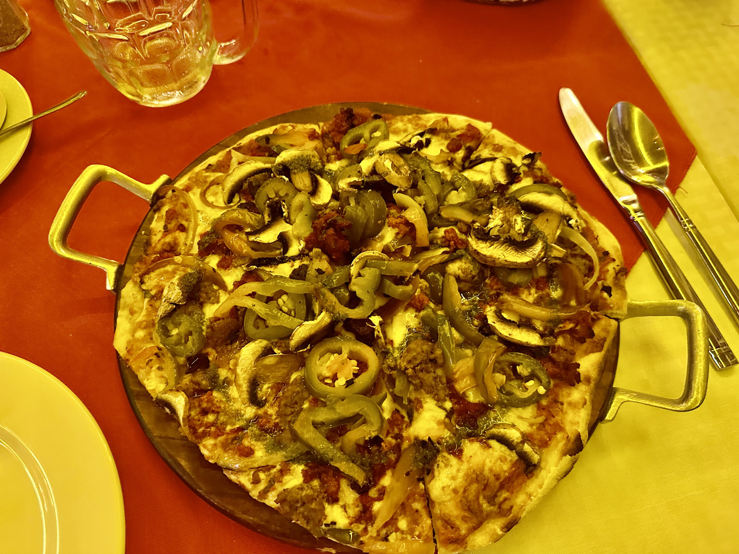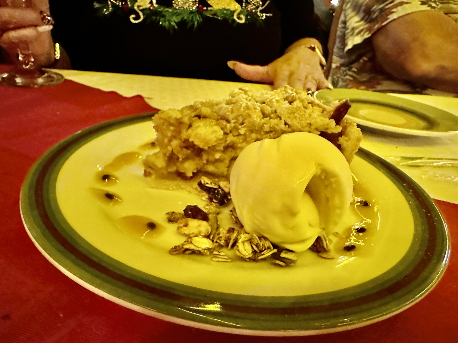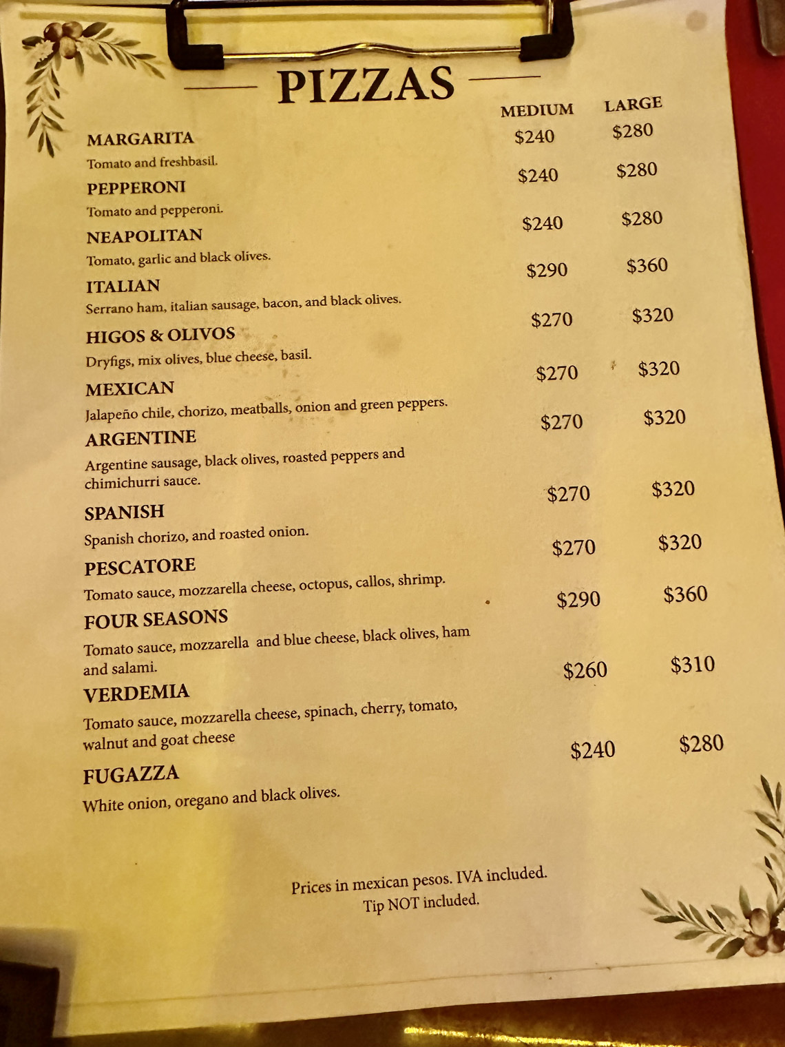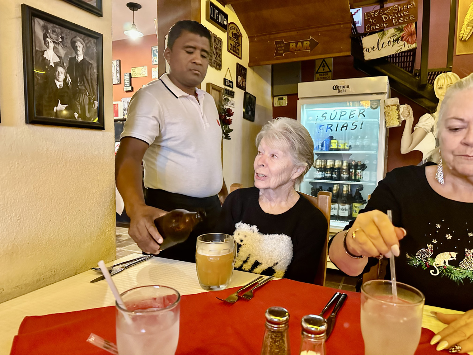 We started by ordering our drinks – beer for Bill and Dianne; limonada for Beth and Tanya and a Chardonnay for me. The menu offers a good choice of appetizers, soups, salads, meats and fish – steak, chicken, shrimp, ribs and catch of the day – and pizza. I decided to try the Cream Corn soup, Beth and Tanya ordered the Pear Salad as appetizers. For our main dishes, Bill went straight to the pizza with jalapenos, mushrooms, peppers, and onions. I choose the parmesan chicken and the others selected the Catch of the Day. We finished off our meal with apple pie with ice cream.