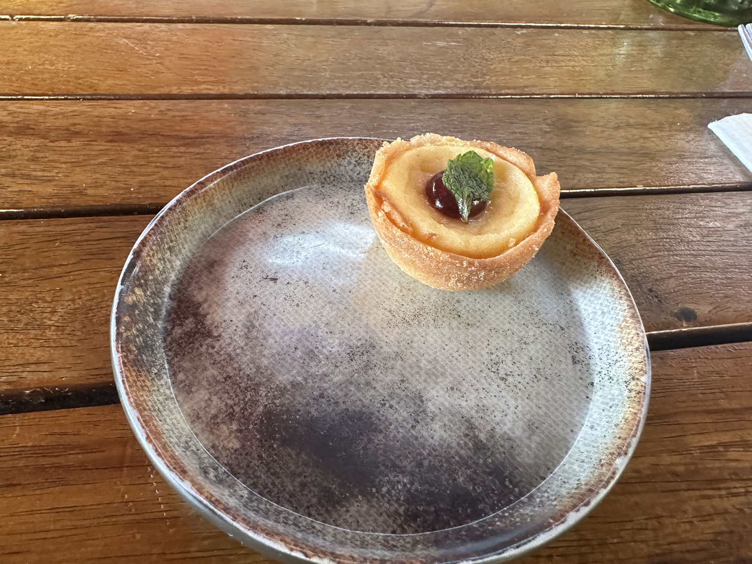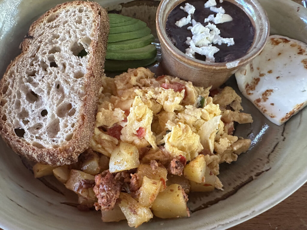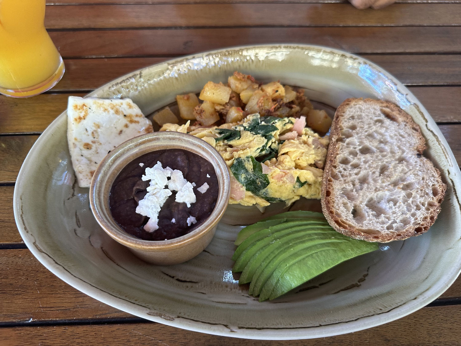 Hector ordered a fresh squeezed orange juice and I select Diet Coke. We were brought a complimentary amuse of a small cheesecake tart – very nice. I ordered my regular Huevos a la Mexicana, which was served with sliced avocado, pan fried potatoes, refried beans, and a slice of fresh bread. The presentation, flavor and portion size were great. Hector chose scrambled eggs with spinach and onions, which were served with the same sides. The breakfasts were great.