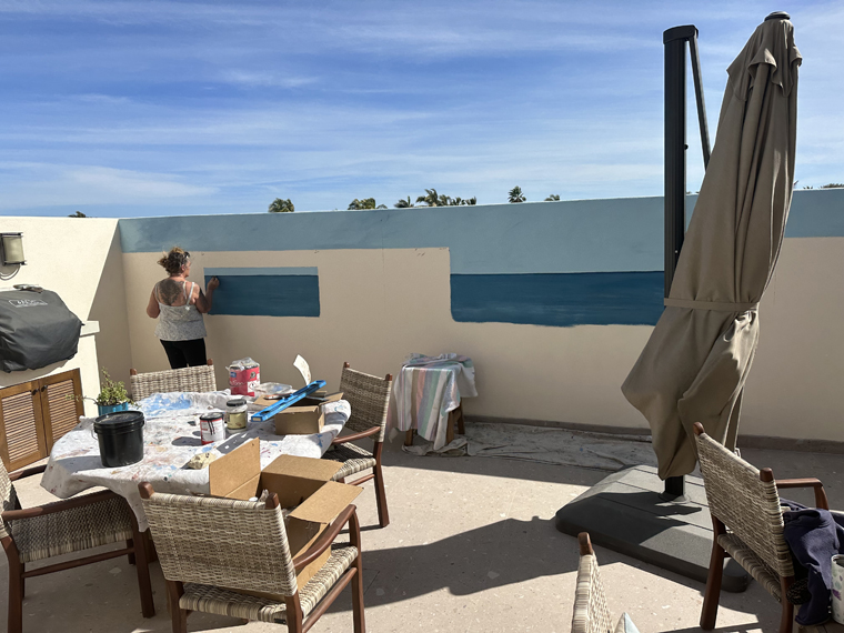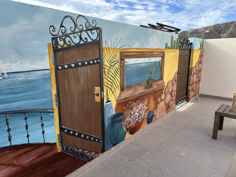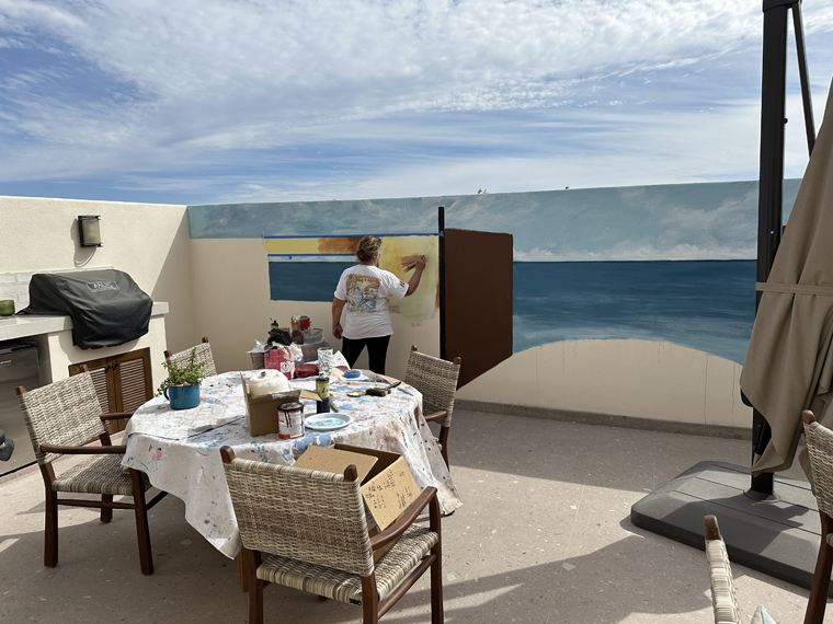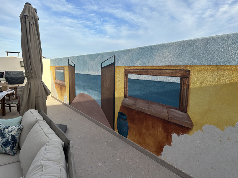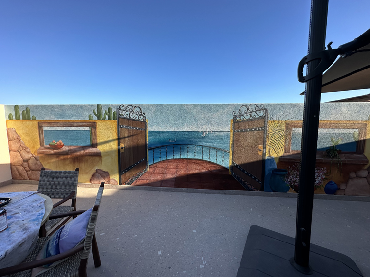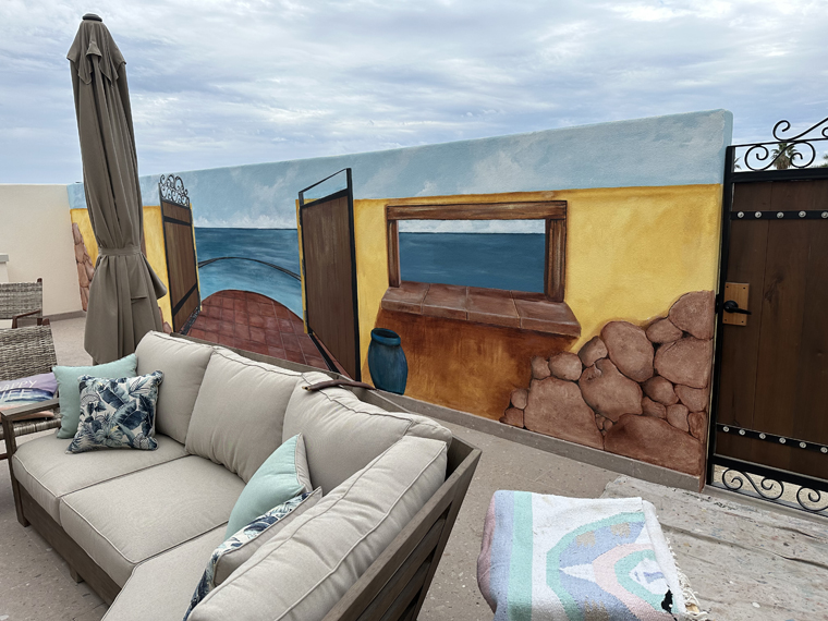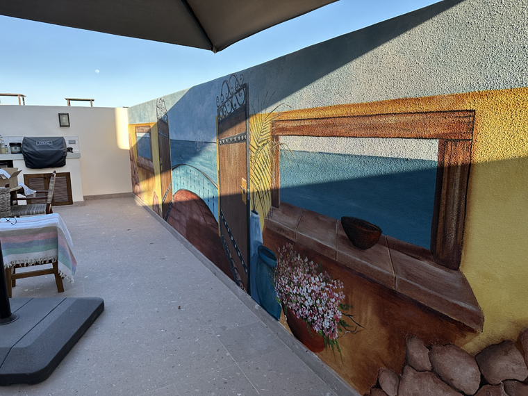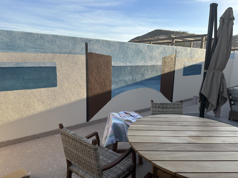 Since that time, when Beth’s father passed away, I asked her to do a painting of the two of them together.  When we moved into the new townhouse in Pueblo Campastre with a long wall in the outdoor patio, it was a natural to ask Holly to do a mural along the wall.  We met and had an initial discussion and then she sent us two brief concepts, making it clear that it would evolve as the work was in progress.  It was fascinating watching Holly work each day as she would paint something, stand back and then adjust the color, the shadows or the image itself.  She worked each afternoon for about ten days to perfect our mural, taking input from Beth about her decisions of details to add to the mural.  The final result is amazing.  Our goal was to bring the outdoor in and to re-create a little of our experience of living on the beach in Zacatitos. The creation of a terrace allowed this to work brilliantly.  The photos below show the final mural as well as the day-by-day progress on it as details are added.  We hope you like it.