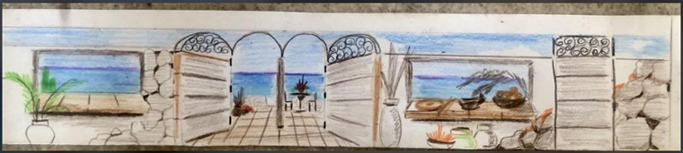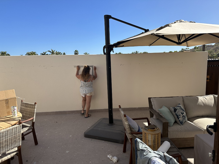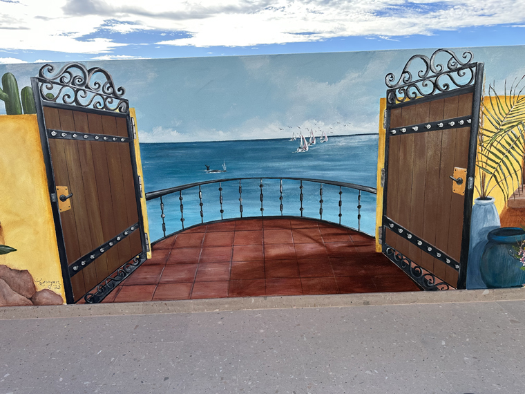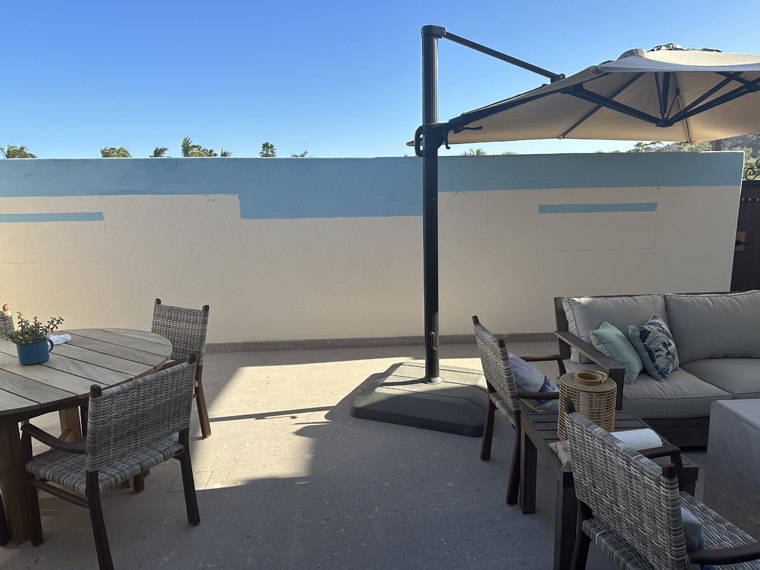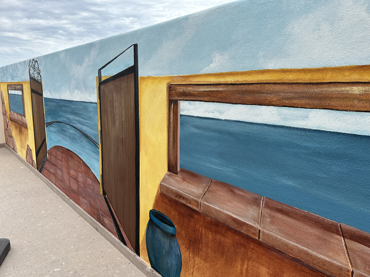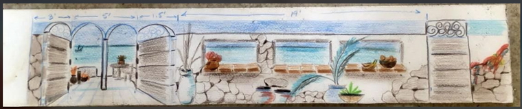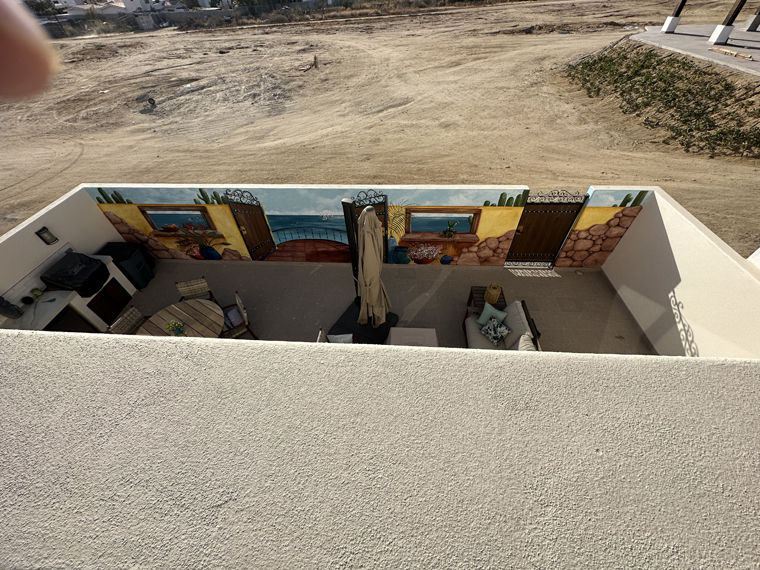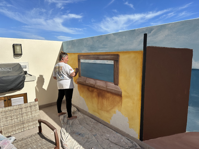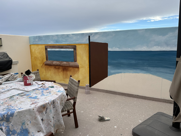 Since that time, when Beth’s father passed away, I asked her to do a painting of the two of them together.  When we moved into the new townhouse in Pueblo Campastre with a long wall in the outdoor patio, it was a natural to ask Holly to do a mural along the wall.  We met and had an initial discussion and then she sent us two brief concepts, making it clear that it would evolve as the work was in progress.  It was fascinating watching Holly work each day as she would paint something, stand back and then adjust the color, the shadows or the image itself.  She worked each afternoon for about ten days to perfect our mural, taking input from Beth about her decisions of details to add to the mural.  The final result is amazing.  Our goal was to bring the outdoor in and to re-create a little of our experience of living on the beach in Zacatitos. The creation of a terrace allowed this to work brilliantly.  The photos below show the final mural as well as the day-by-day progress on it as details are added.  We hope you like it.