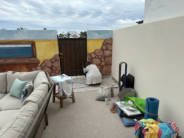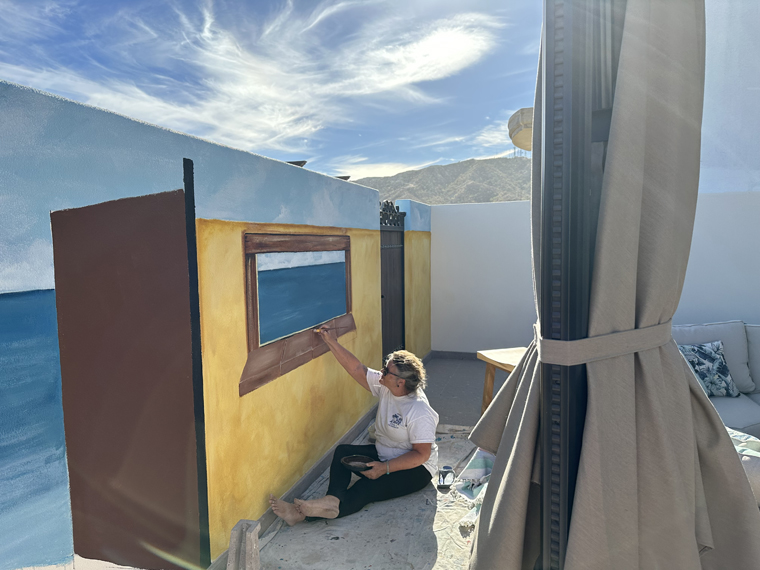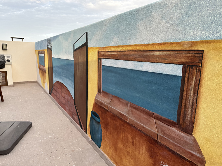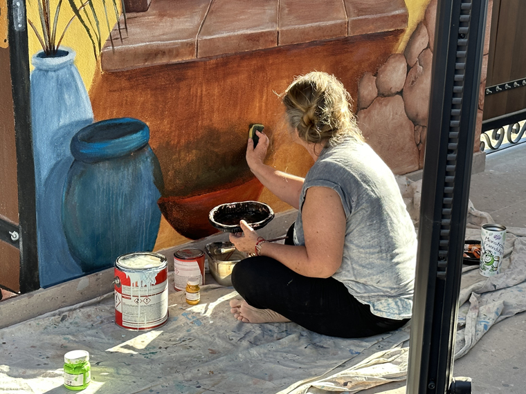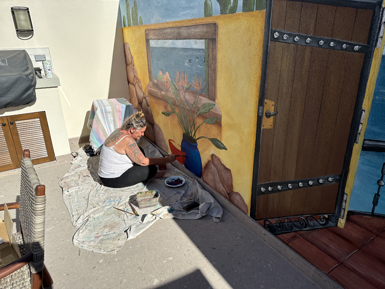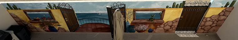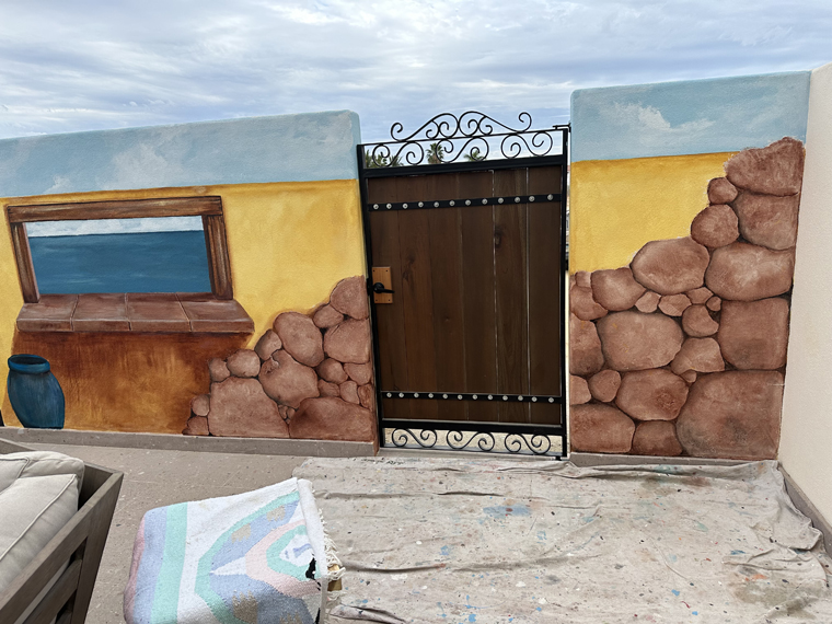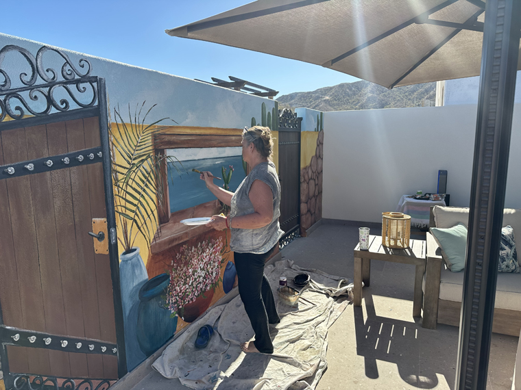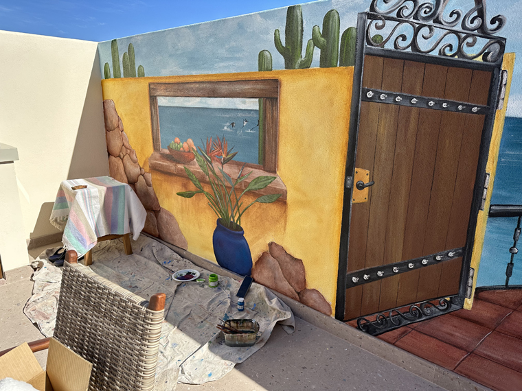 What is even more interesting is that much of her commissioned work involves large scale interior or exterior murals for homes and businesses in Los Cabos.  Because of the commissions, Holly’s art does not focus on a single theme.  Rather it includes a wide range of subjects from pet memorials to ocean and landscape scenes to in-depth explorations of historical and contemporary people of Mexico.  Expanding on her earlier work in faux painting, many of her commissions involve painting on the interior and exterior walls of homes to create an atmosphere and feeling for the home owners and their guests.  Some of these works are huge and cover whole walls that are nine or ten feet tall.