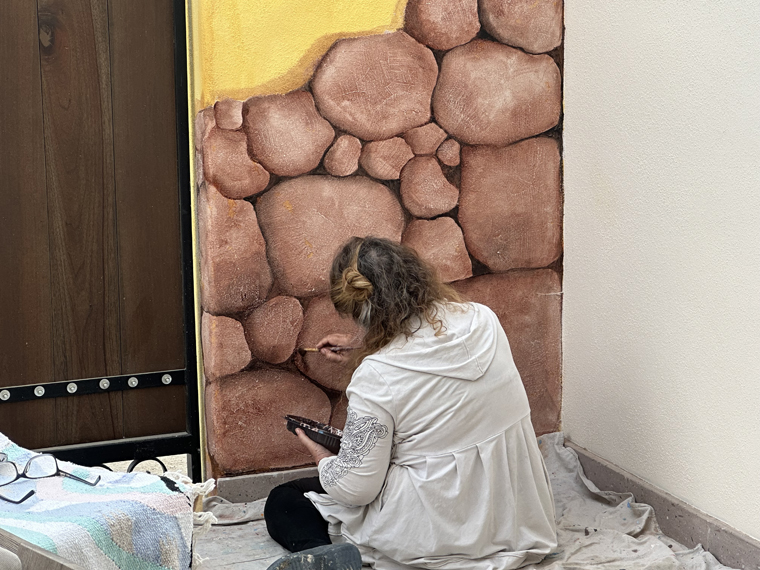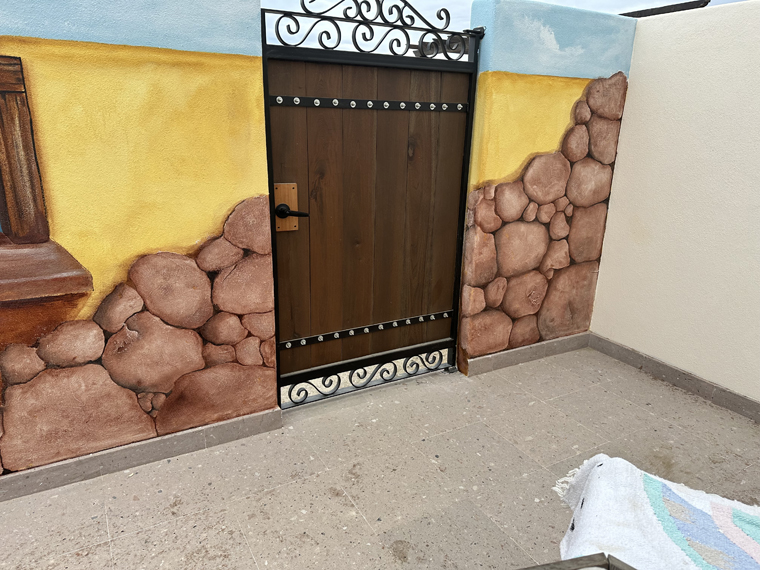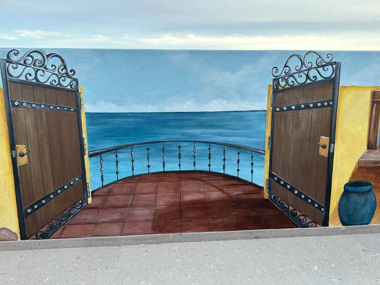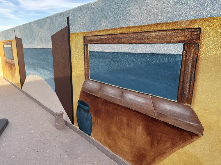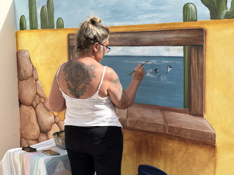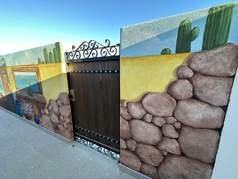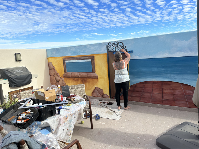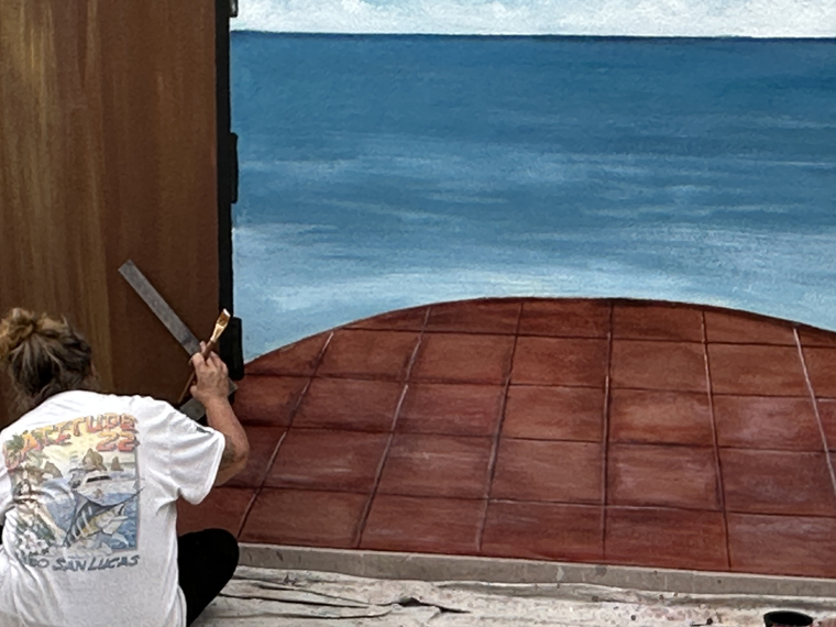 What is even more interesting is that much of her commissioned work involves large scale interior or exterior murals for homes and businesses in Los Cabos.  Because of the commissions, Holly’s art does not focus on a single theme.  Rather it includes a wide range of subjects from pet memorials to ocean and landscape scenes to in-depth explorations of historical and contemporary people of Mexico.  Expanding on her earlier work in faux painting, many of her commissions involve painting on the interior and exterior walls of homes to create an atmosphere and feeling for the home owners and their guests.  Some of these works are huge and cover whole walls that are nine or ten feet tall.