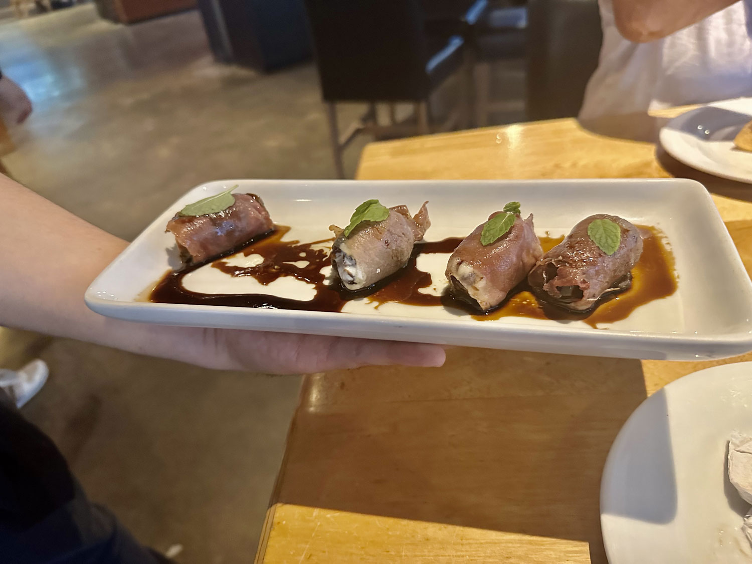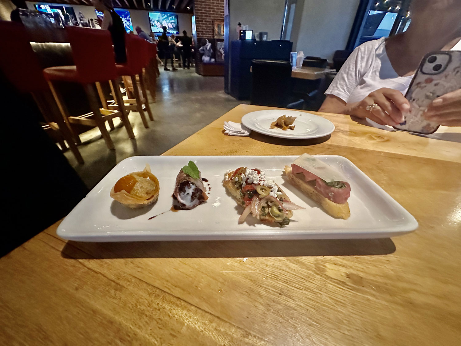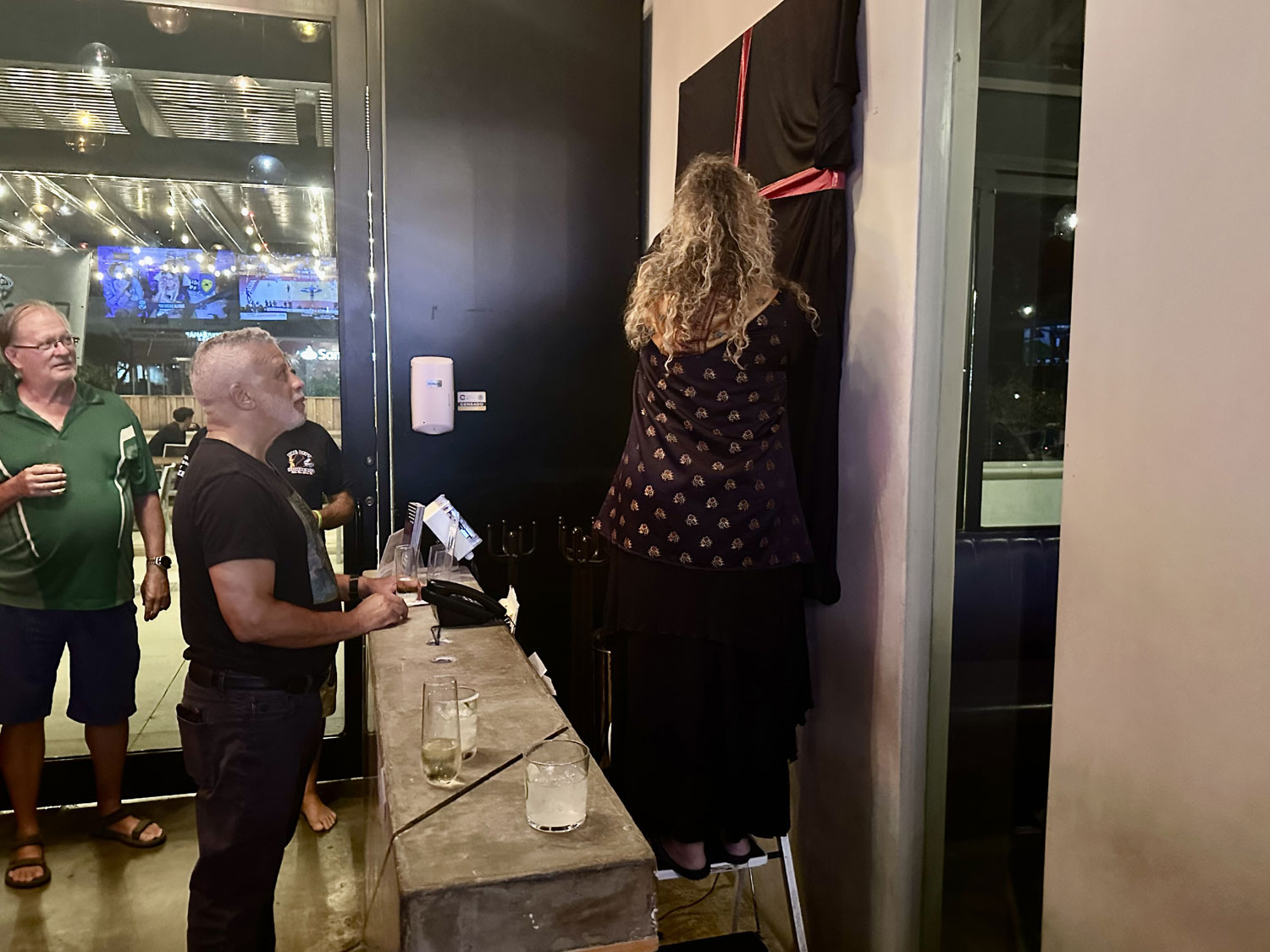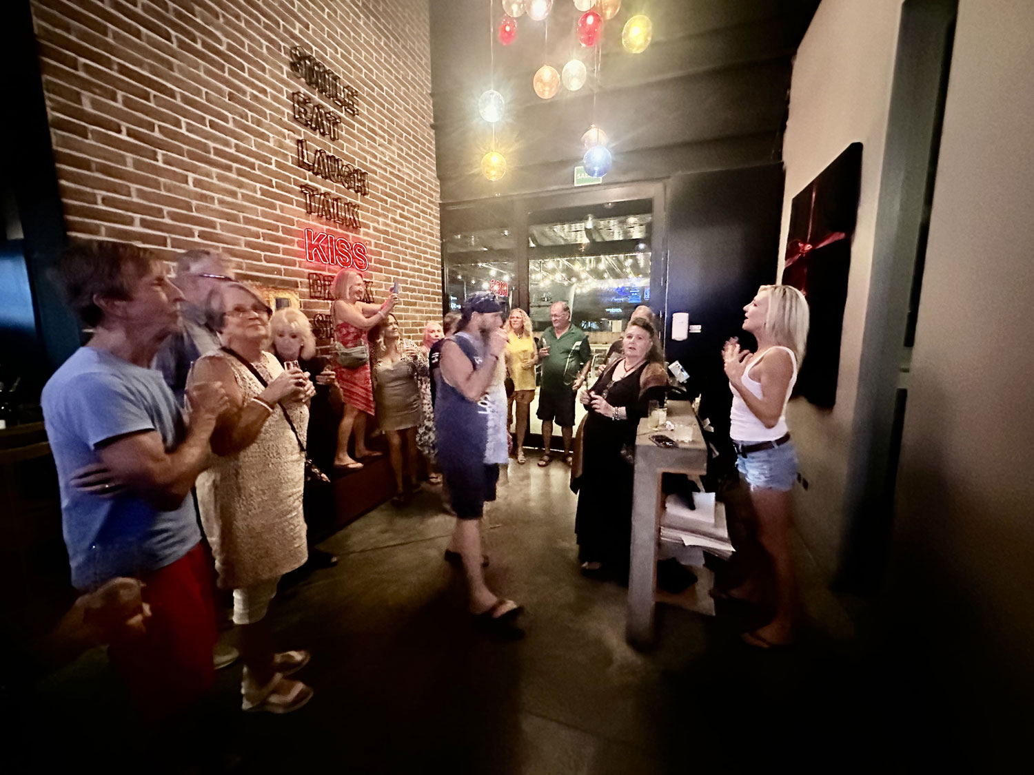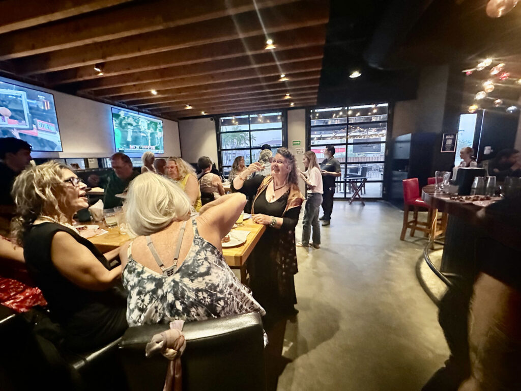 District provided bubbly to toast Holly and her artwork and several complimentary appetizers, which the staff offered to guests of the restaurant that time. When the time came, Holly and Dana called all of the guests to the entryway. Dana introduced Holly and the decision to have this special painting. After the ribbon was cut, and the wrapping removed from the painting, Dana and Holly posed with their hands to the sides of their faces in the same fashion as shown in the painting. The guests toasted Holly with their Proseco and cheered. It was a great event.