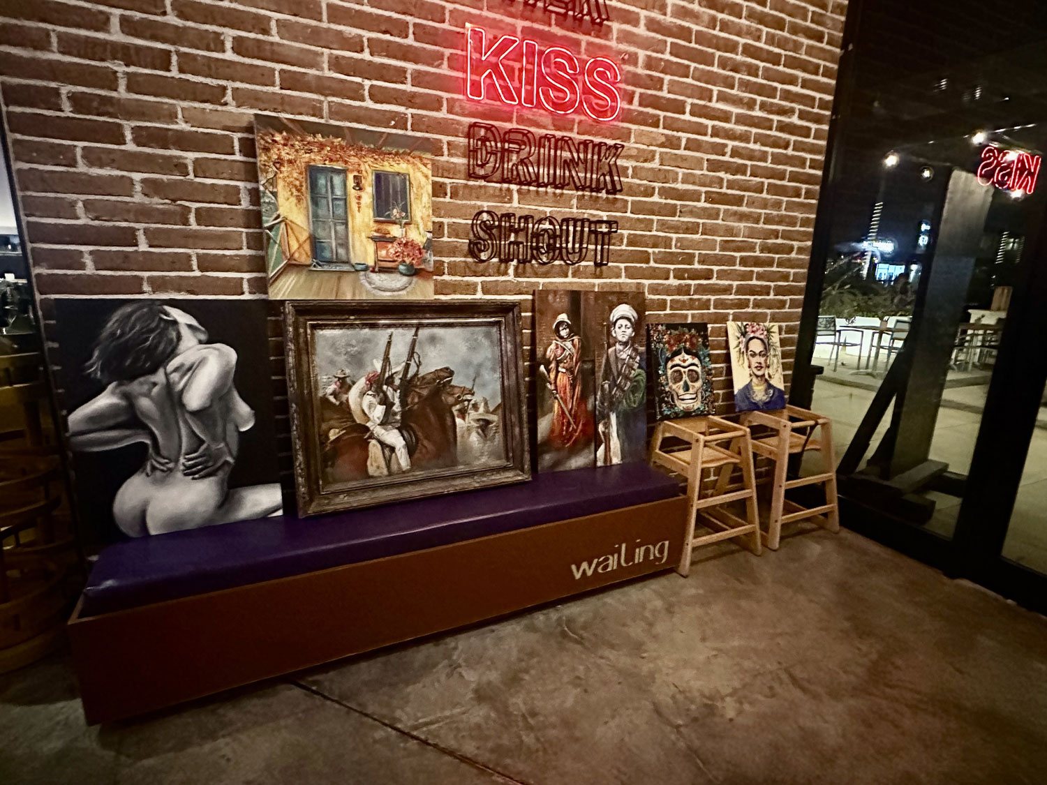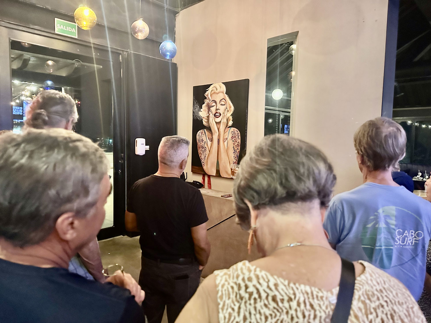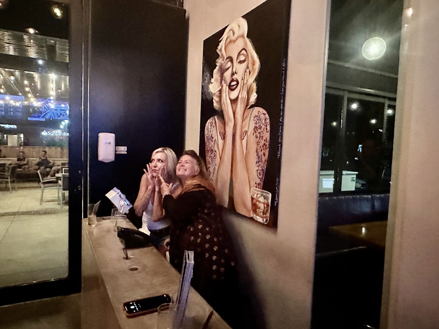 Dana McLoughlin, one of the owners of District has supported the art events held by Holly at the restaurant. She asked her to do a special painting for behind the host desk at the entry to the restaurant. Apparently, she wanted a quite tantalizing portrait of Marilyn Monroe (which Holly toned down). Recently, there was an unveiling of the portrait for guests of both District and Holly at the restaurant, where more of her original art was also displayed in the entryway.