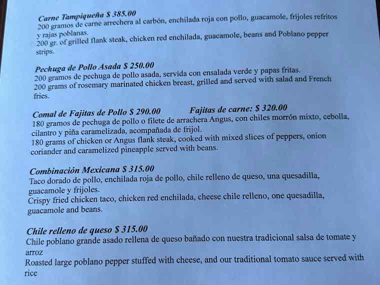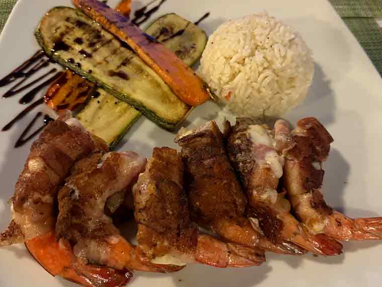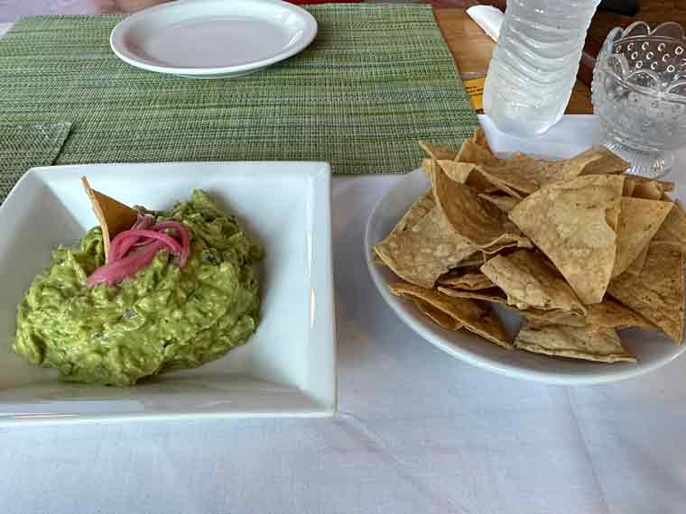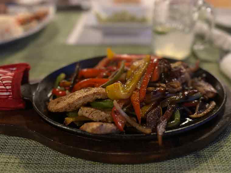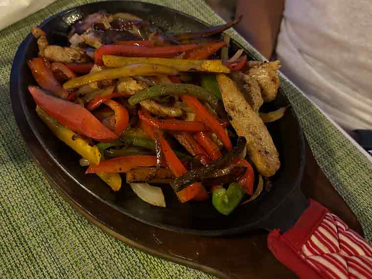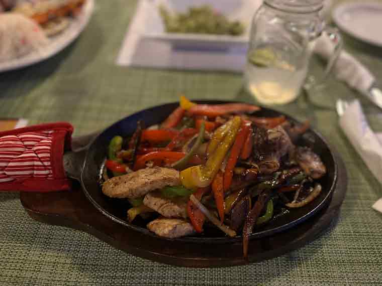 After arriving, after taking our bags to the room, we met down at the restaurant/bar to have a drink and some dinner. The menu has a good selection of starters, soups, pastas, seafood, meats and Mexican dishes. We ordered some guacamole and chips to start. We could tell the restaurant was pet friendly as a friendly pup came to visit us at our table. For main courses, we ordered chicken fajitas with flour tortillas and refried beans and grilled shrimp with rice and vegetables. The fajitas platter was more than large enough for Beth and I to share for dinner.