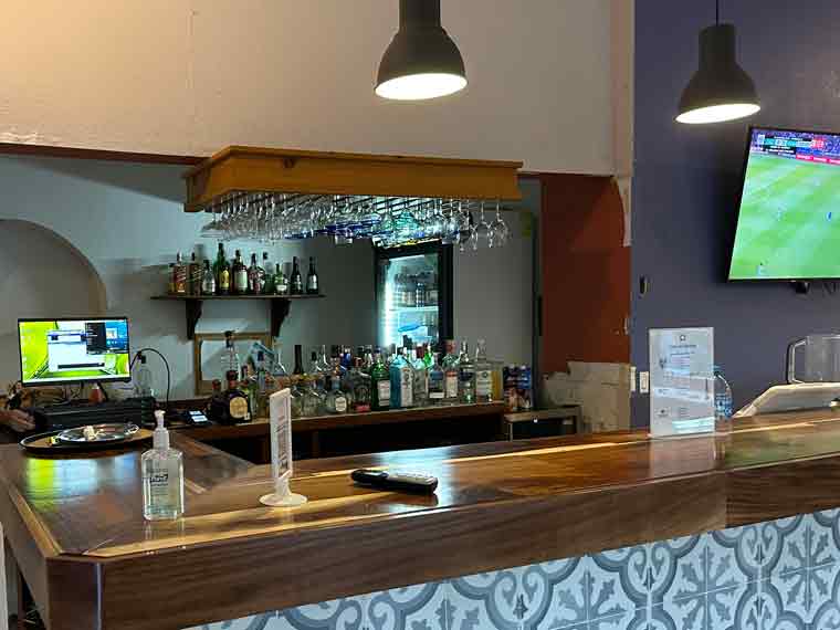 The hotel has a large parking area, and the main entrance leads to the large swimming pool in front of the two-story building with all the rooms. To the right is the hotel’s restaurant with indoor and outdoor seating. The rooms are large with king size beds, a desk, air conditioned with Internet from Starlink.