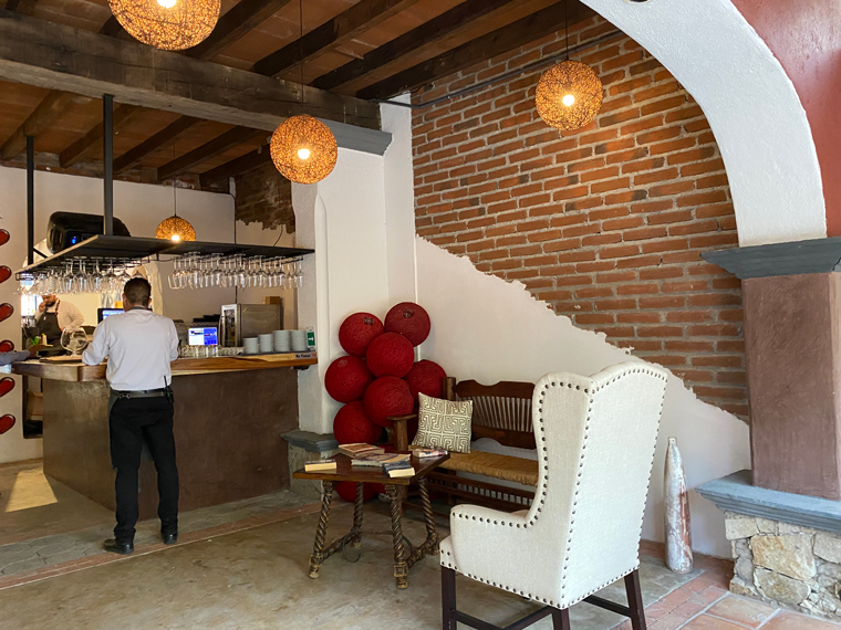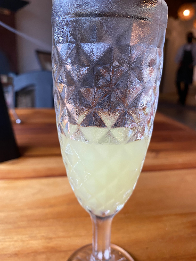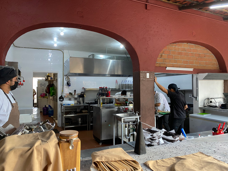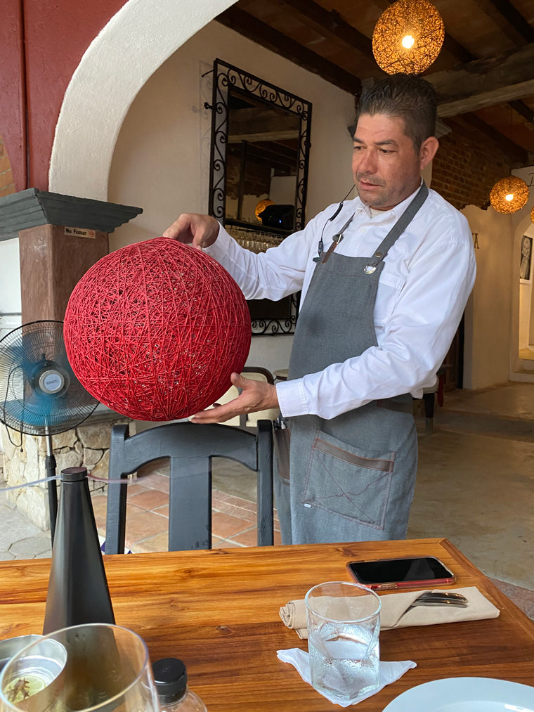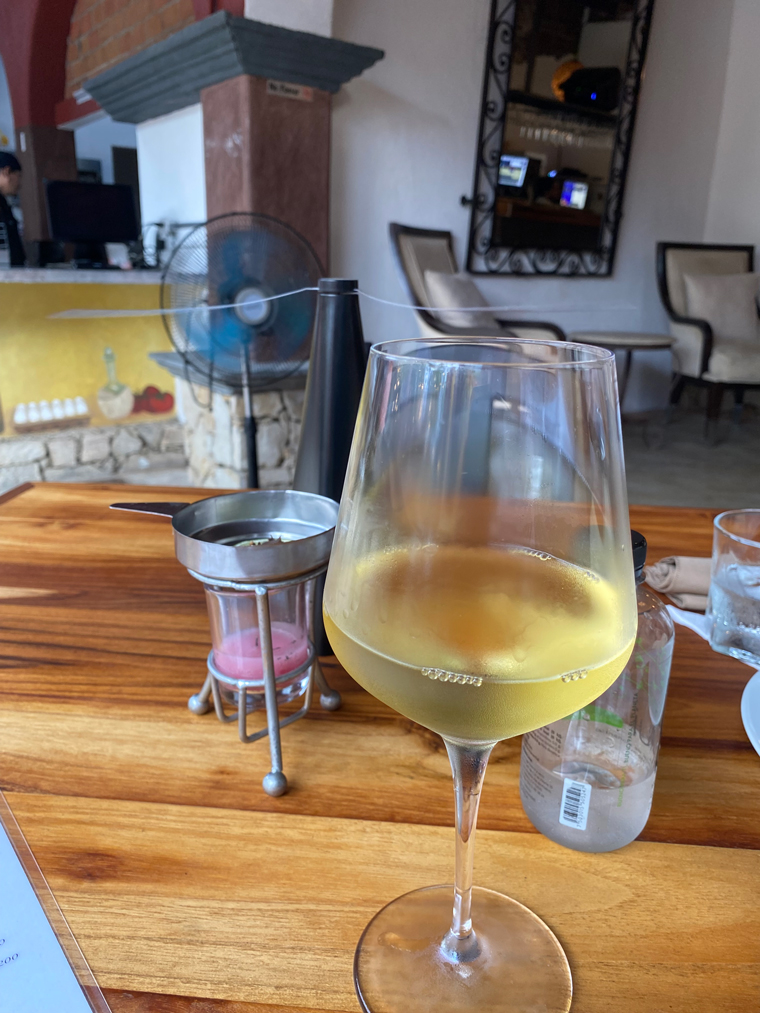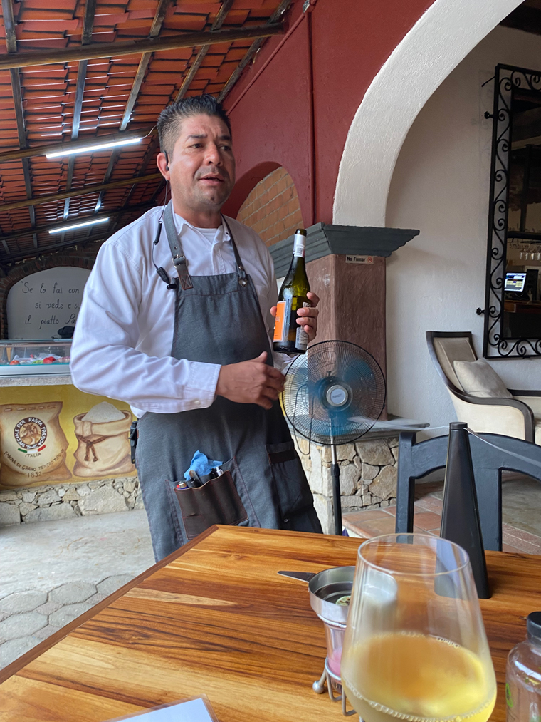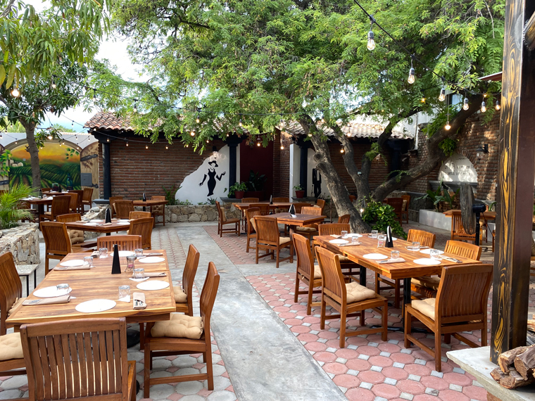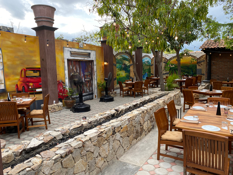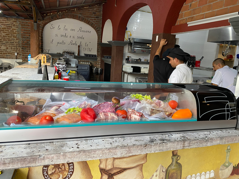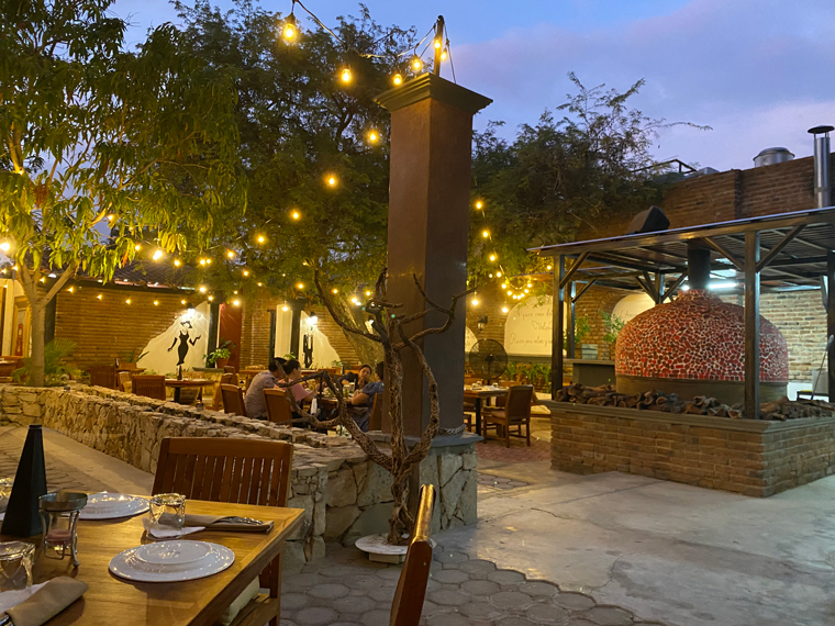 Il Forno took over half of the space previously occupied by Mi Casa on Alvaro Obregon between Morelos and Guerrero. The first sign that they were serious was the sign outside the door offering valet parking. Anyone who has visited the Art District in San Jose del Cabo knows that it is virtually impossible to find someplace to park. Entering the building, we saw how seriously Chef Luigi had taken the design and renovation of the space. To the left of the entrance is a well-stocked bar and to the right is a private wine cellar dining room. Looking all the way to the back, there is an expansive outdoor dining area that is surrounded by interesting mural artwork on the walls. Several large trees adorn the back of the outdoor dining area and string lights and other dome lights make the restaurant seem festive. Just after the bar is another serving area and a small lounge with a low seating where people could comfortably enjoy an appetizer and a cocktail. As you enter the outdoor dining area the kitchen is to the right and in front of it is a large wood-burning pizza oven. The kitchen is large with multiple rooms and several stations. The fresh meats and vegetables are displayed in a glass cooler on the edge of the kitchen. On the left side is a long stone wall, there is a built-in fire pit to provide even more atmosphere as the sun goes down. The design of the restaurant was so striking that I just had to take a walk around and look at all of the design elements. Our server explained to us that they had taken down some of the globe lamp shades because of the upcoming storm.