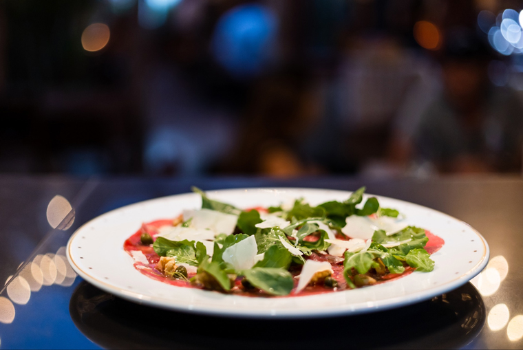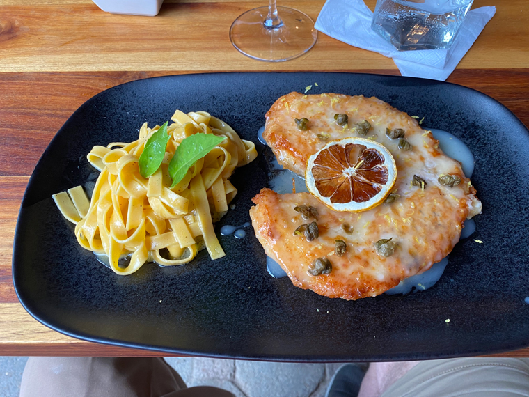 We want to try several different dishes. We decided to share a Caesar Salad (with the fresh parmesan on the side at Beth’s request). I also order the Beef Carpaccio as a starter. The Caesar Salad had a fresh dressing, small croutons and there were large slices of fresh parmesan cheese. The platter of carpaccio was large with arugula, cherry tomatoes, walnuts and sliced parmesan and olive oil. Both were delicious as was the basket of fresh breads that was provided with the appetizers. Of course, it was all enjoyed with a glass (or two) of Round Hill Chardonnay.