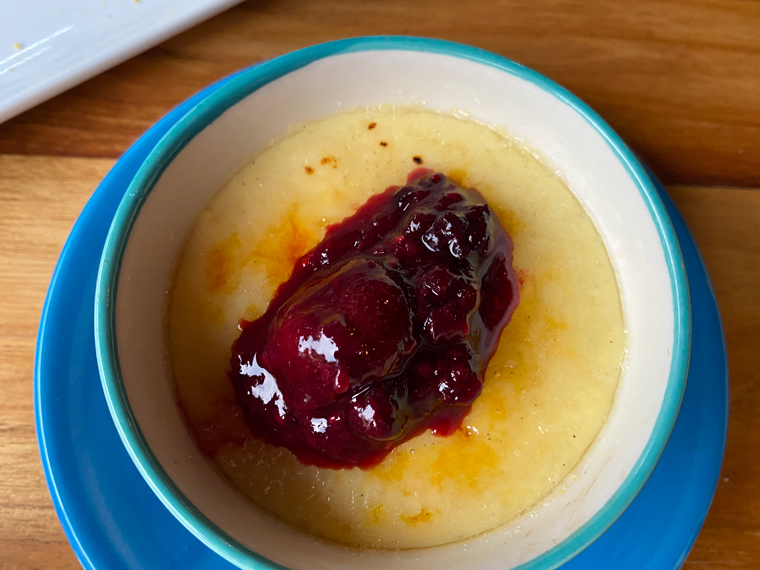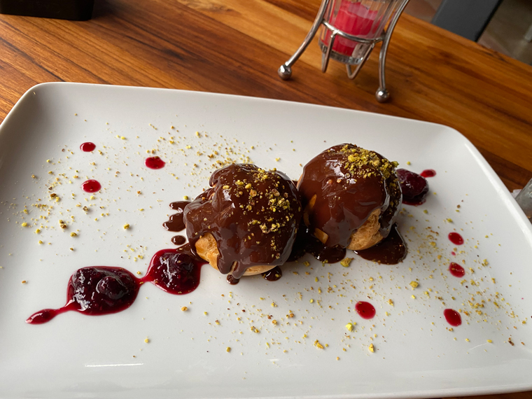 For dessert Beth ordered the Profiteroles and I chose the Creme Brulée. The pastry on the profiteroles was excellent. They were stuffed with a cream custard (rather than vanilla ice cream) and smothered in chocolate sauce with some cherry sauce as well. Similarly, the creme brulée had a cherry sauce on top of the crisp caramelized top of the custard. Both were also excellent. I enjoyed a glass of Limoncello to accompany the desserts.