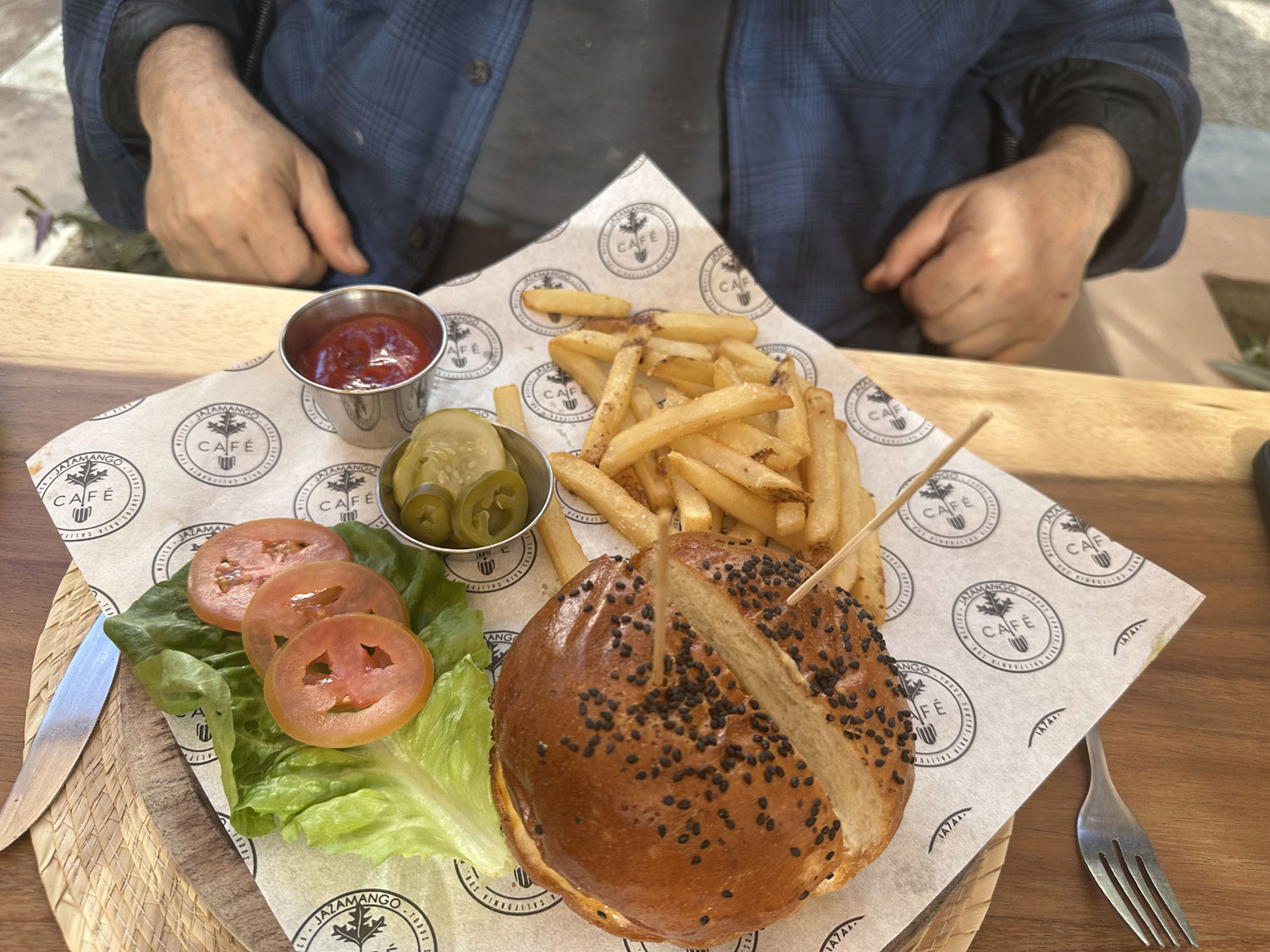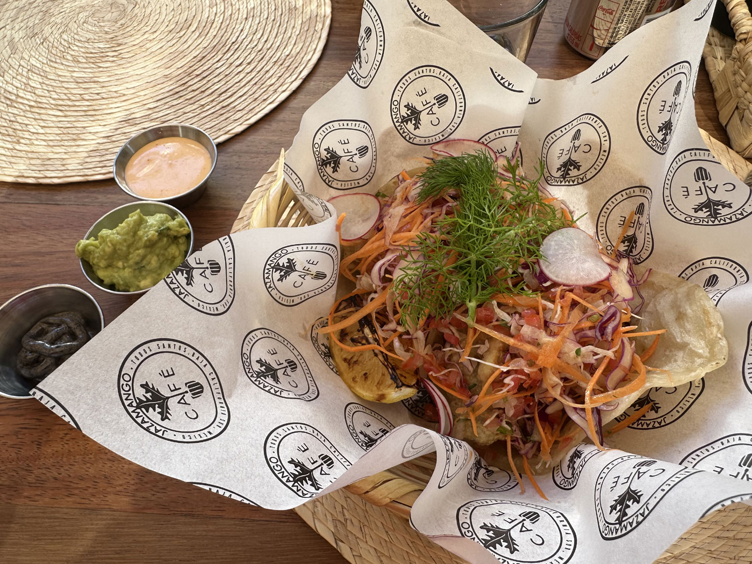 Located on the main street of Todos Santos (Benito Juarez) through Erza Katz Gallery is Jazzmango Cafe. Created by Chef Javier Plascencia of Jazzmango Farm to Table, the cafe received a full renovation last year. There is seating in a patio by the kitchen as well as in several tiers in the garden. I went recently for lunch with Ezra Katz (offered from 1:30 to 4:30 pm). The menu offers an interesting combination of Mexican – Baja Tacos, Pork Pibil, Guacamole, Fried plantain – and American items – Beef and Chicken burgers, Grilled Cheese, Turkey Panini – as well as some vegetarian and vegan items – Spinach and Kale Salad, Tofu Spring Roll, Avocado Toast.