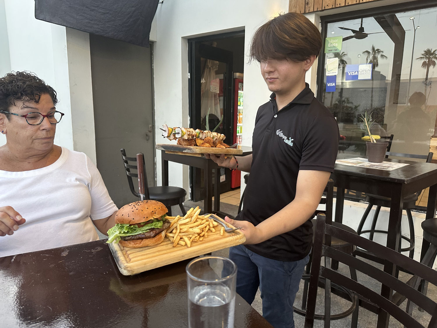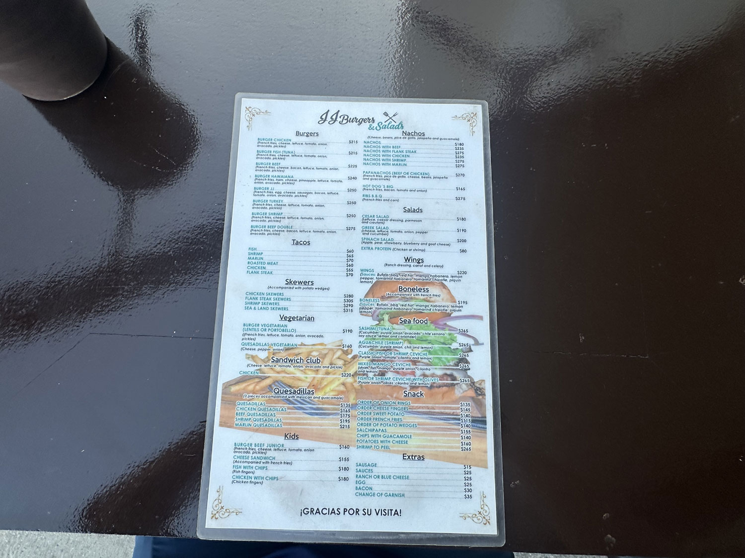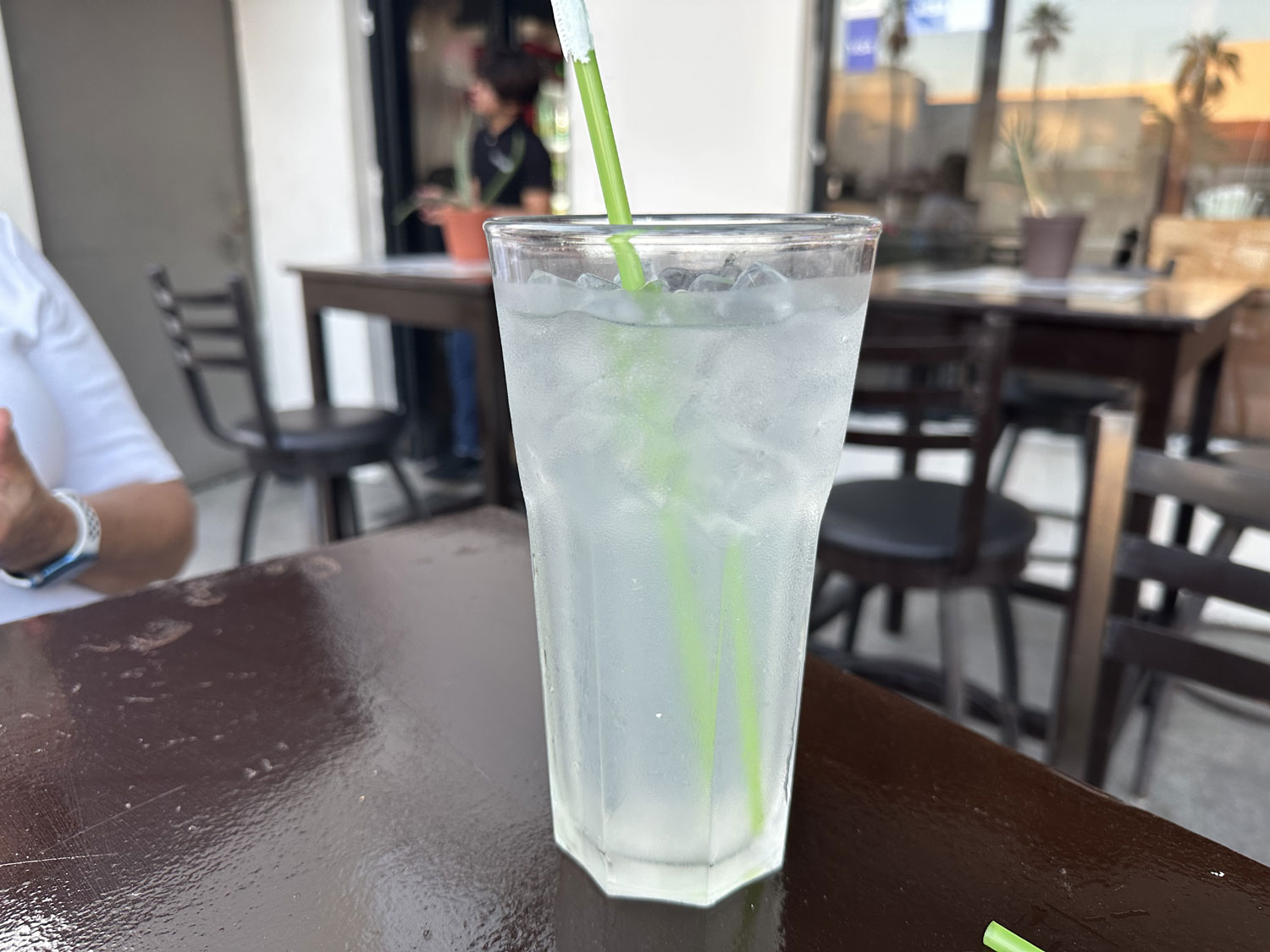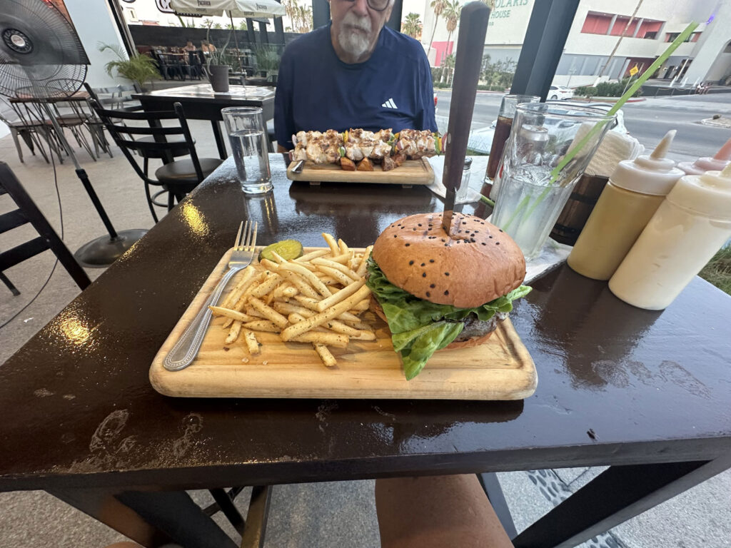 Located in the small plaza with Thrifty Ice Cream, The Bar and Corleone Pizza is a family-owned restaurant, JJ Burgers & Salads. Seating is outside on the terrace on high-top tables. The menu offers Burgers, Tacos, Quesadillas, Skewers, a Club Sandwich, Nachos, Salads, Seafood, Wings and Snacks. The son of the owner was our server and when he arrived, he adjusted the large standing fan to make sure that we would be cool during our meal. He asked us what we would like to drink. I asked for a Diet Coke and an ice water and Beth chose a LimonadaMinerale. A few minutes later, I watched in making the lemonade from scratch, including actually squeezing the lemons for the drink.