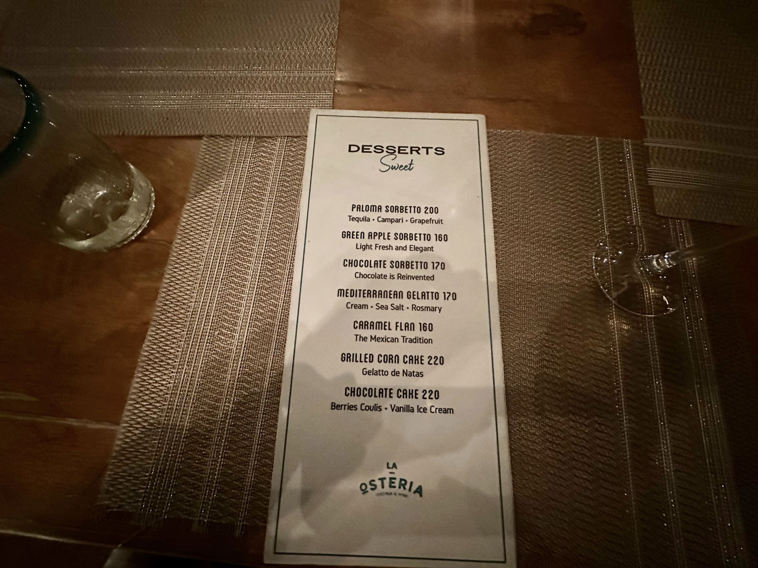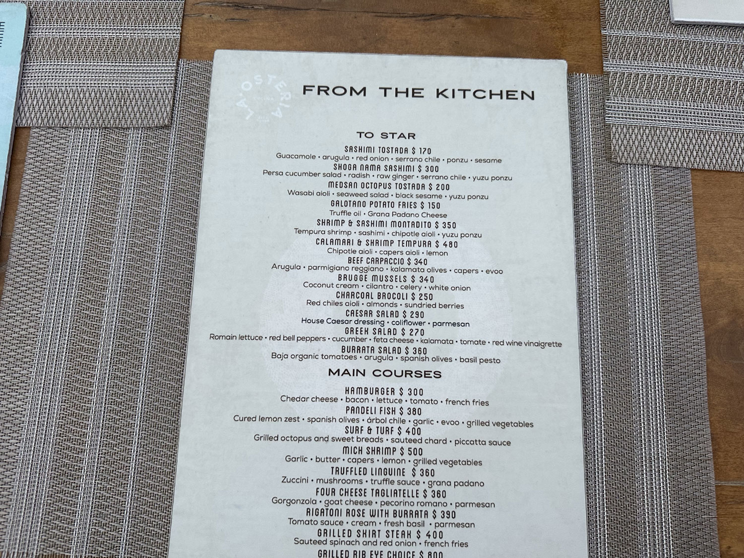 Located on the street behind La Comer, beside its sister restaurant, Lateral is La Osteria. This Italian oriented restaurant has both indoor and outdoor seating, with a wood-fired oven outdoors for pizza and bakery items. The menu offers salads and appetizers to start including several fresh seafood items. The main courses range from hamburgers to steak, surf and turf, fish, and a few pasta dishes. The other side of the menu provides a list of the items available from the wood-fired oven including baked brie, a portobello mushroom and 13 different pizzas. There is a lot from which to choose.