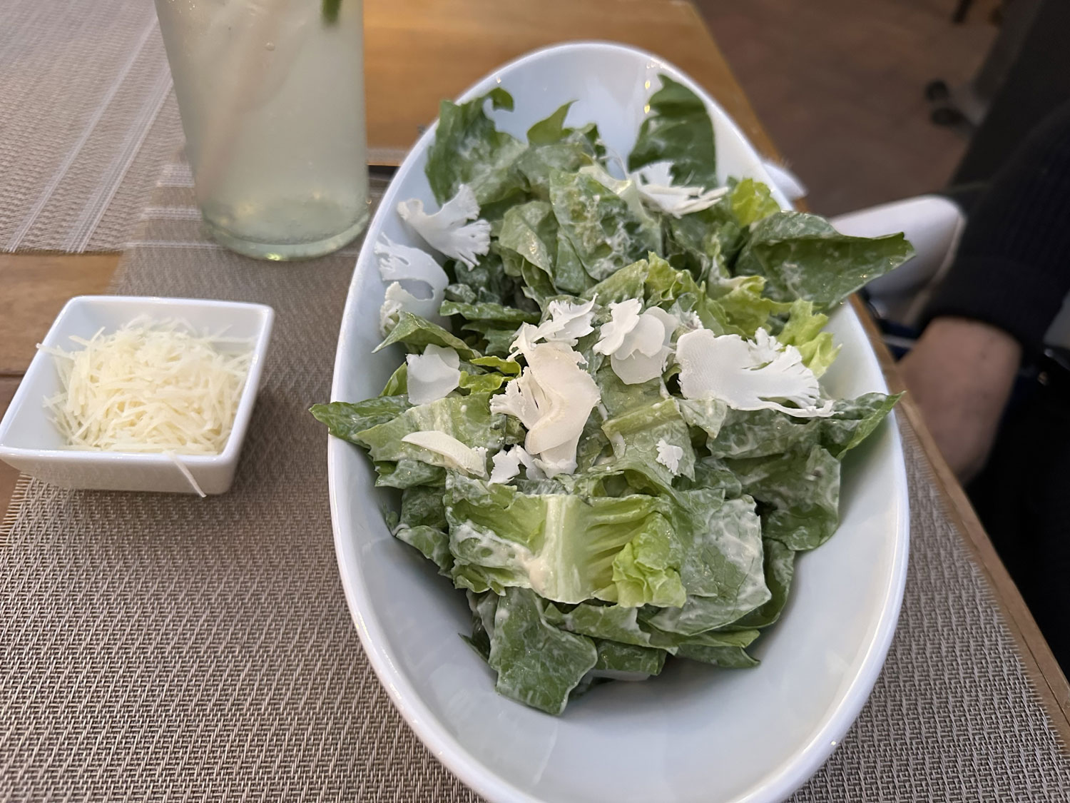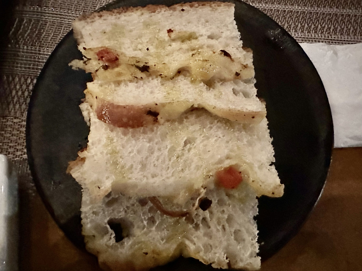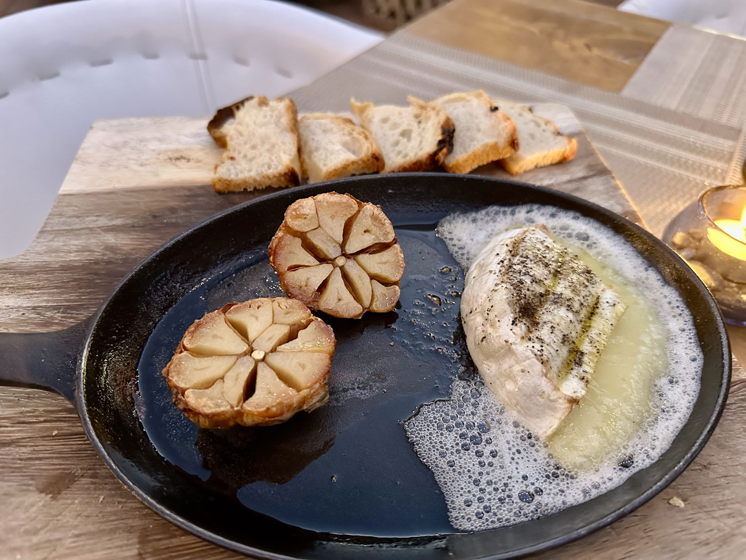 We selected a table in the outside dining area as La Osteria also has live music several nights a week and we want to listen to the band. We ordered our drinks – Chardonnay for me and LimonadaMinerale for Beth. For appetizers, I choose the Baked Brie from the wood-fired oven and Beth asked for Caesar Salad with the fresh parmesan on the side. The baked brie came with a full garlic clove that had been cut in half and cooked in the oven and toasted fresh bread. It was amazing, and a great portion for two or more people. The dressing on the Caesar Salad was very good, and it was served with shaved cauliflower on the top. Again, the portion was big enough to share.