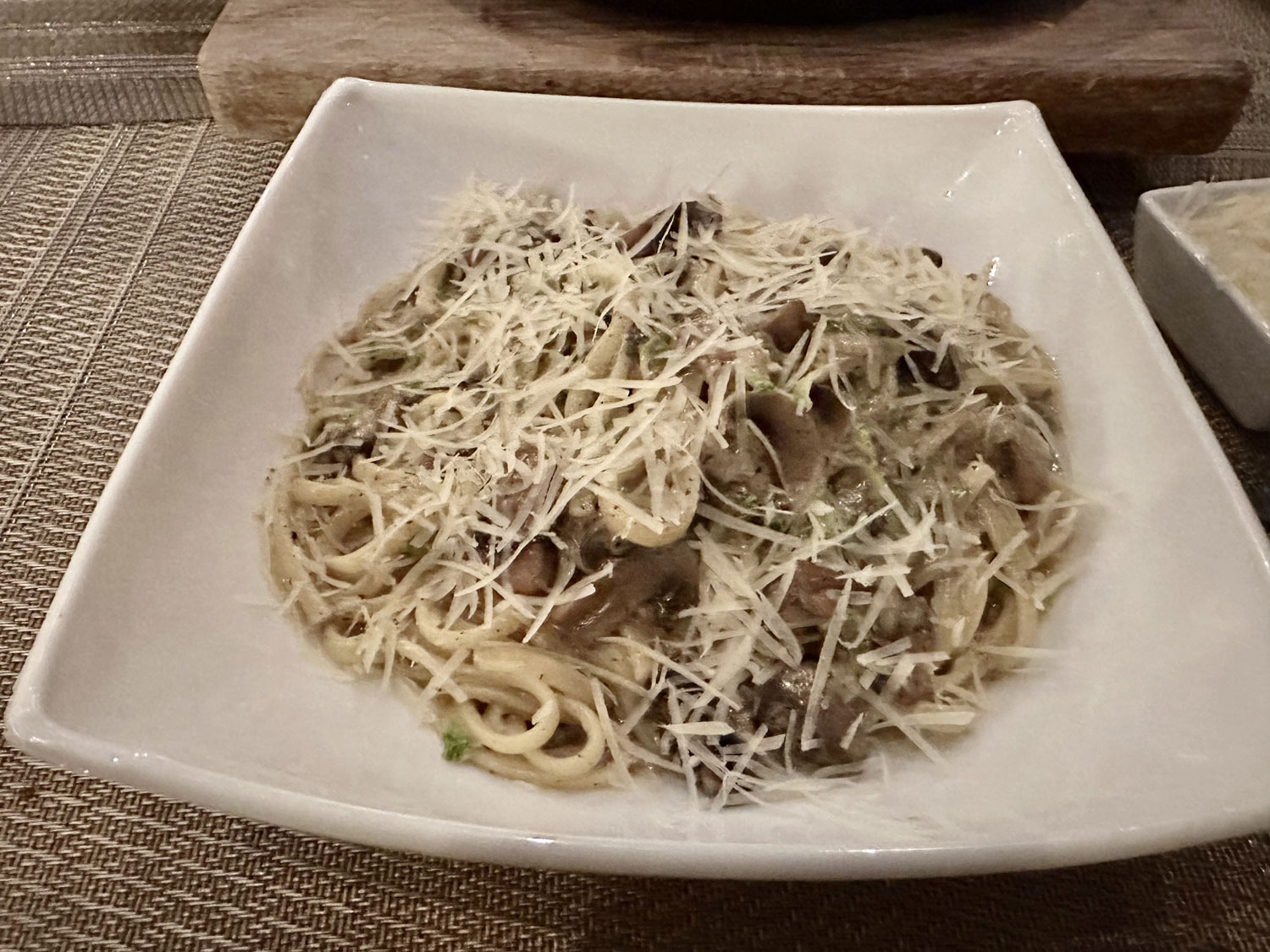 For main courses, I ordered the Truffled Linguine, which had zucchini and mushrooms in a truffle sauce. Beth ordered the Rigatoni Rose with Burrata Cheese. There was a very large piece of burrata on top of the rigatoni with a light rose sauce. We were not disappointed – the flavors were great – and a plate of fresh bread was provided to accompany the pasta.