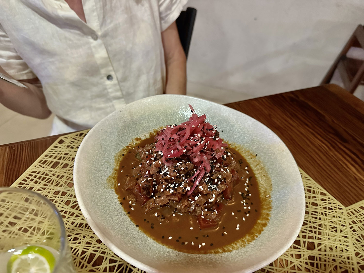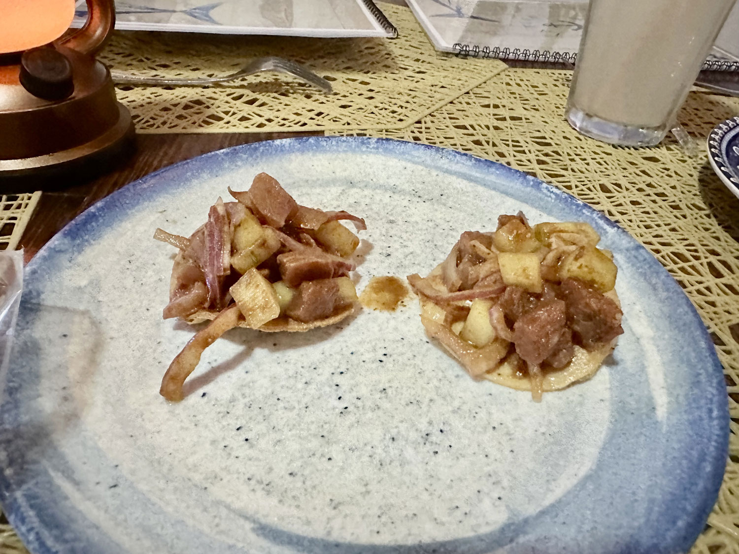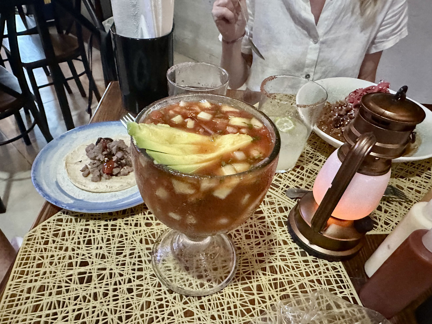 Eric and Lisa didn’t know about the restaurant and so they were surprised to see the large new palapa. The couple are protein forward eaters and so seafood or meat is a great choice for them. Our server handed out the menus, which offer starters, soups and salads, ceviches, aguachiles, seafood cocktails, sashimi, tacos, tostadas, and even pastas and risottos with seafood as well as a few steaks. It took a while for all of us to make up our minds and what to choose for dinner.
