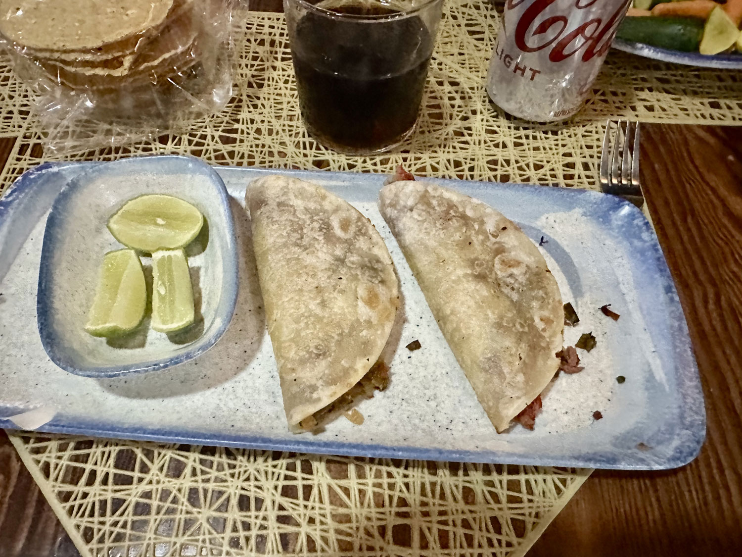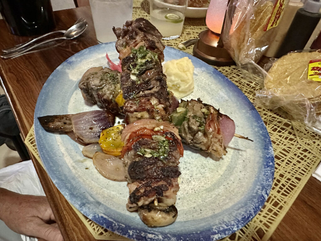 Lisa viewed the grilled watermelon and tuna sashimi as her entrée as well after the shrimp cocktail. Eric asked our server is he could have just a single skirt steak taco (the order is 3) to try it and then have the skirt steak brochettes as his main course. The server agreed and brought a single taco with a plate of condiments – Pico de Gallo, two salsa and coleslaw. He was impressed. Beth ordered the Shrimp Fiesta with Classic Shrimp served with rice and grilled vegetables as her main course and I choice the marlin quesadillas. Beth was very happy with the shrimp dish with eight breaded shrimp, rice and vegetables. I had warned Eric but when his steak brochettes arrived, he was in shock. The plate had two very large skewers of steak with peppers, bacon and onions and was served with mashed potatoes. One whole skewer ended up in a box to take home. I had tried marlin tacos at another restaurant in San Jose del Cabo that is no longer open and enjoyed them and so I was very happy to see them on the menu here. They were delicious.