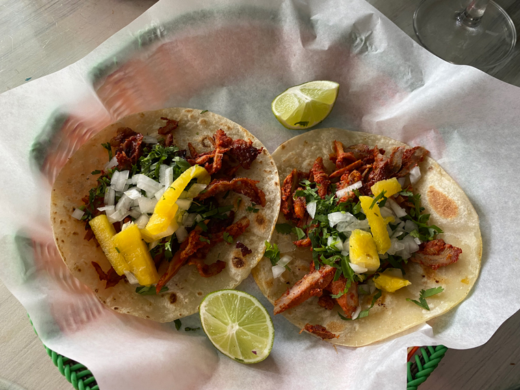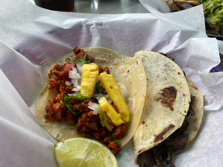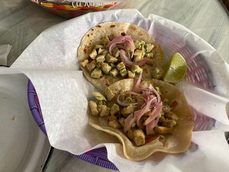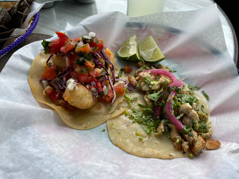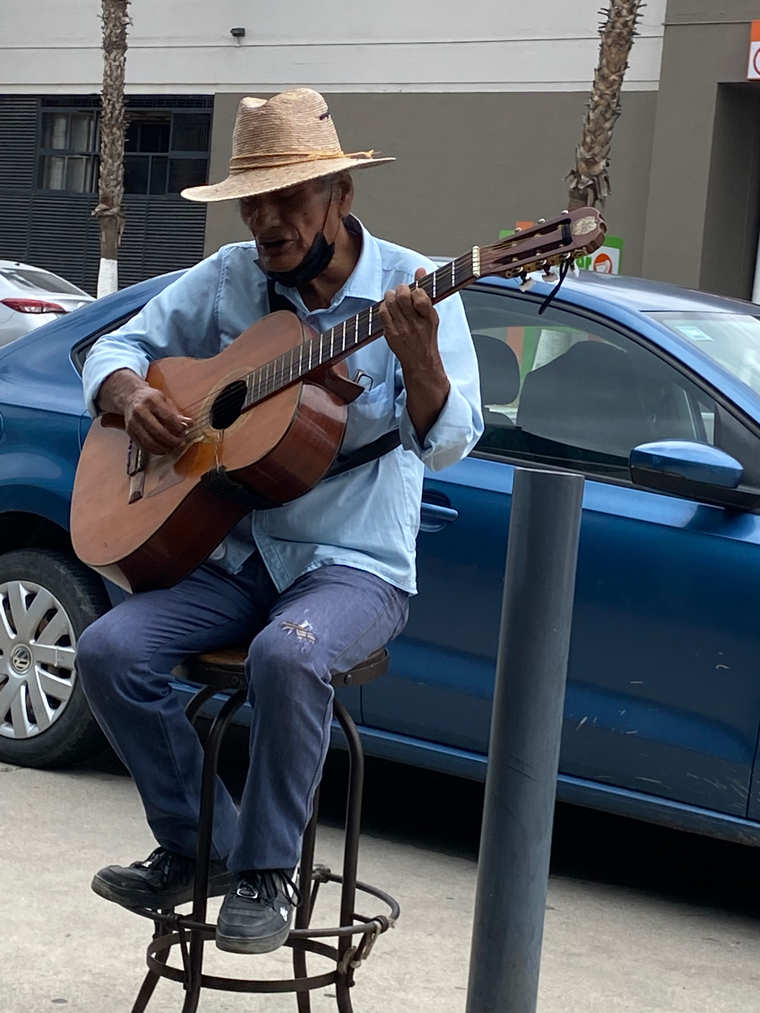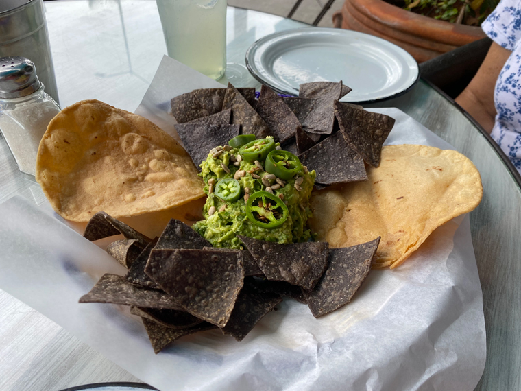 On both visits we decided to start with their guacamole, which comes with both black tortilla chips and two large tostadas. There is also a selection of additional salsas that can be added or used to add flavor to your choice of Mexican food. We mixed some pico de gallo into the guacamole. It was delicious and plentiful. For lunch Beth ordered on Baja Shrimp Taco and another Chicken Cilantro Pesto Taco. She was so happy with the flavor of the Chicken Taco that she ordered two when we went back for dinner – both on flour tortillas. For lunch, I ordered one Pastor Taco and a Mushroom Quesadilla. Both were very good. I had two Pastor Tacos at our dinner later in the week. While we were enjoying our lunch, a very good guitarist sat on the stool on the street and played and sang a number of great tunes.