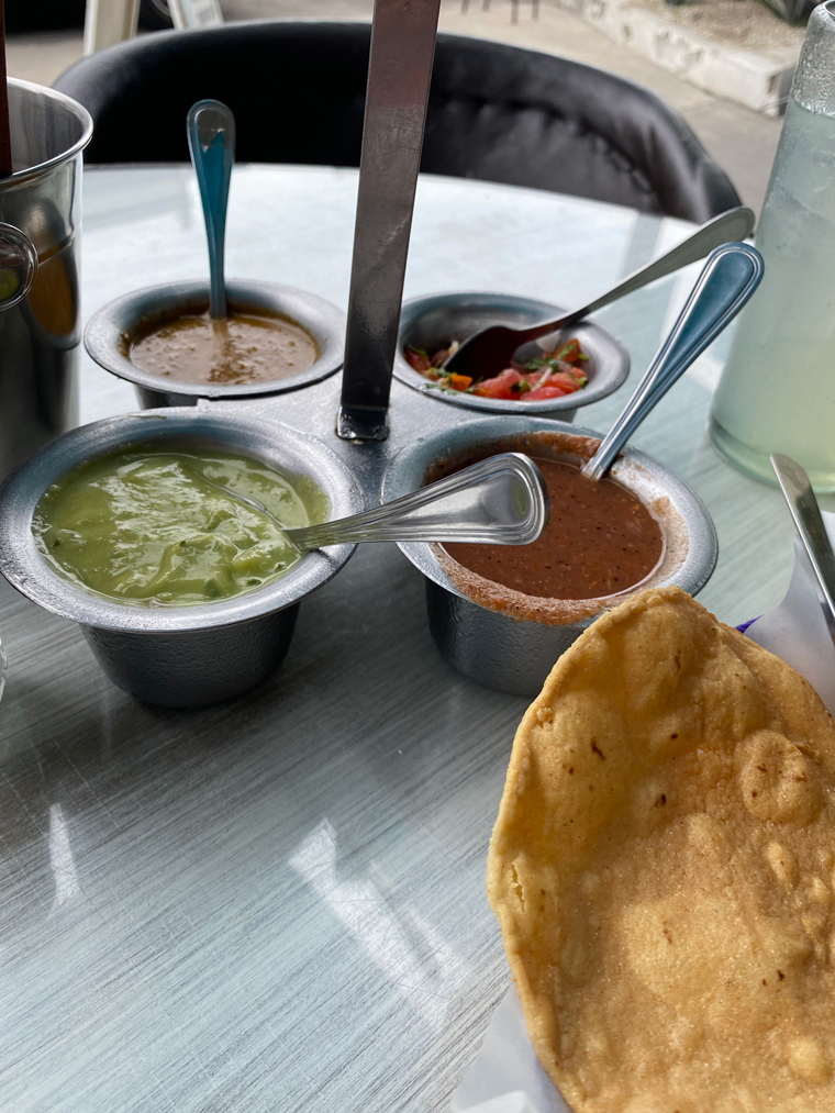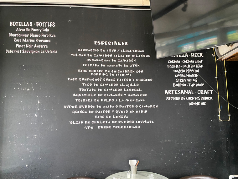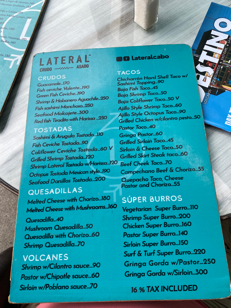 Located behind La Comer in San Jose del Cabo is a small taco place called Lateral Crudo y Asado. With both outdoor and air-conditioned indoor seating, it is a great place to stop for a quick lunch or dinner, which is what we did this week – once for lunch and once for dinner. The selection of Mexican foods on the menu includes tacos, quesadillas, tostadas, volcanos, super burritos and crudos. The selection of veggie, beef, shrimp, fish, pastor and chicken fillings is excellent.