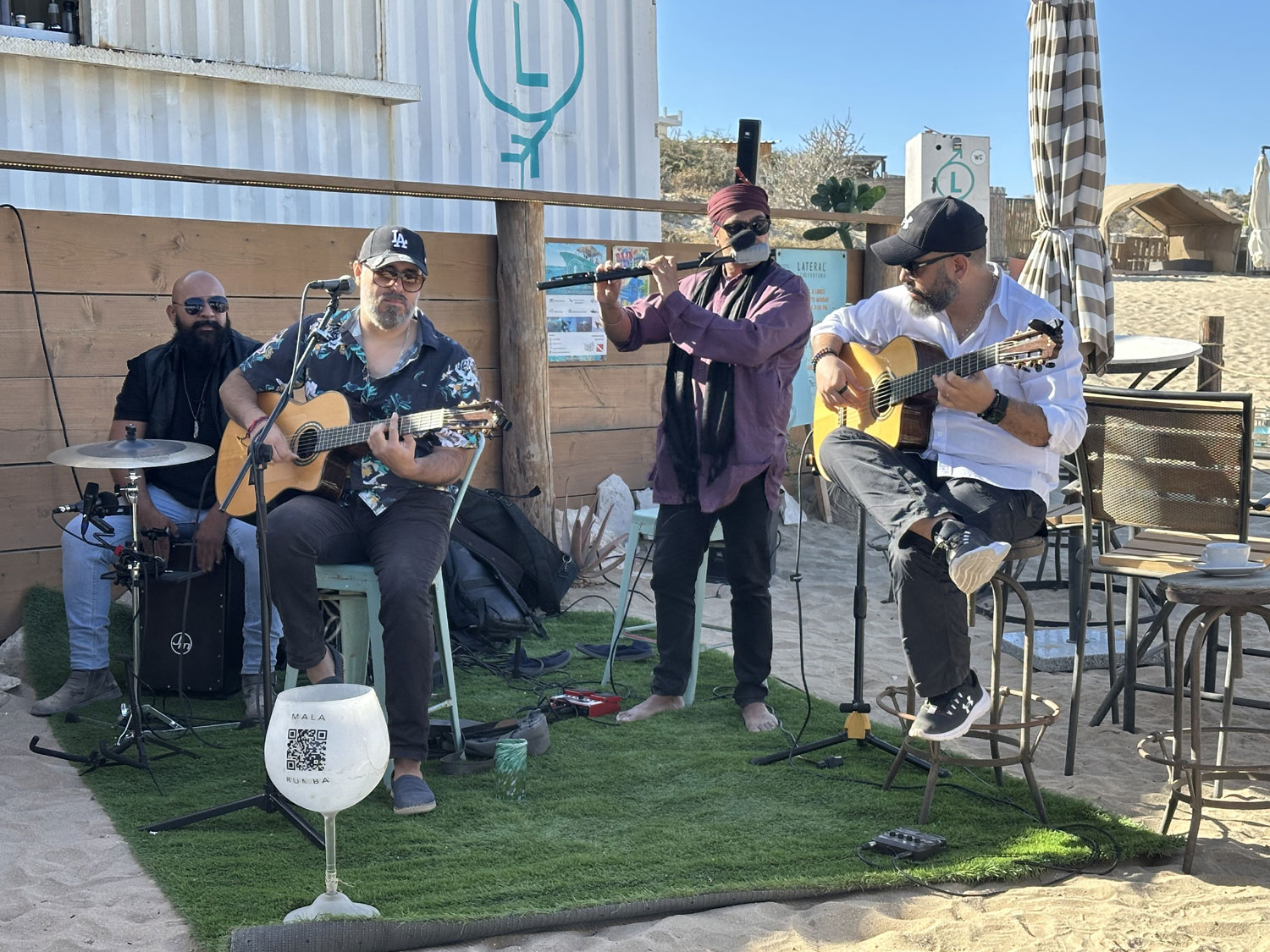 On this Saturday afternoon, Mala Rumba, a quartet that performs on Monday nights at La Osteria (Lateral’s sister restaurant) behind La Comer. The combination of guitar, flute, and percussion makes the choice of both Mexican and pop hits very enjoyable.