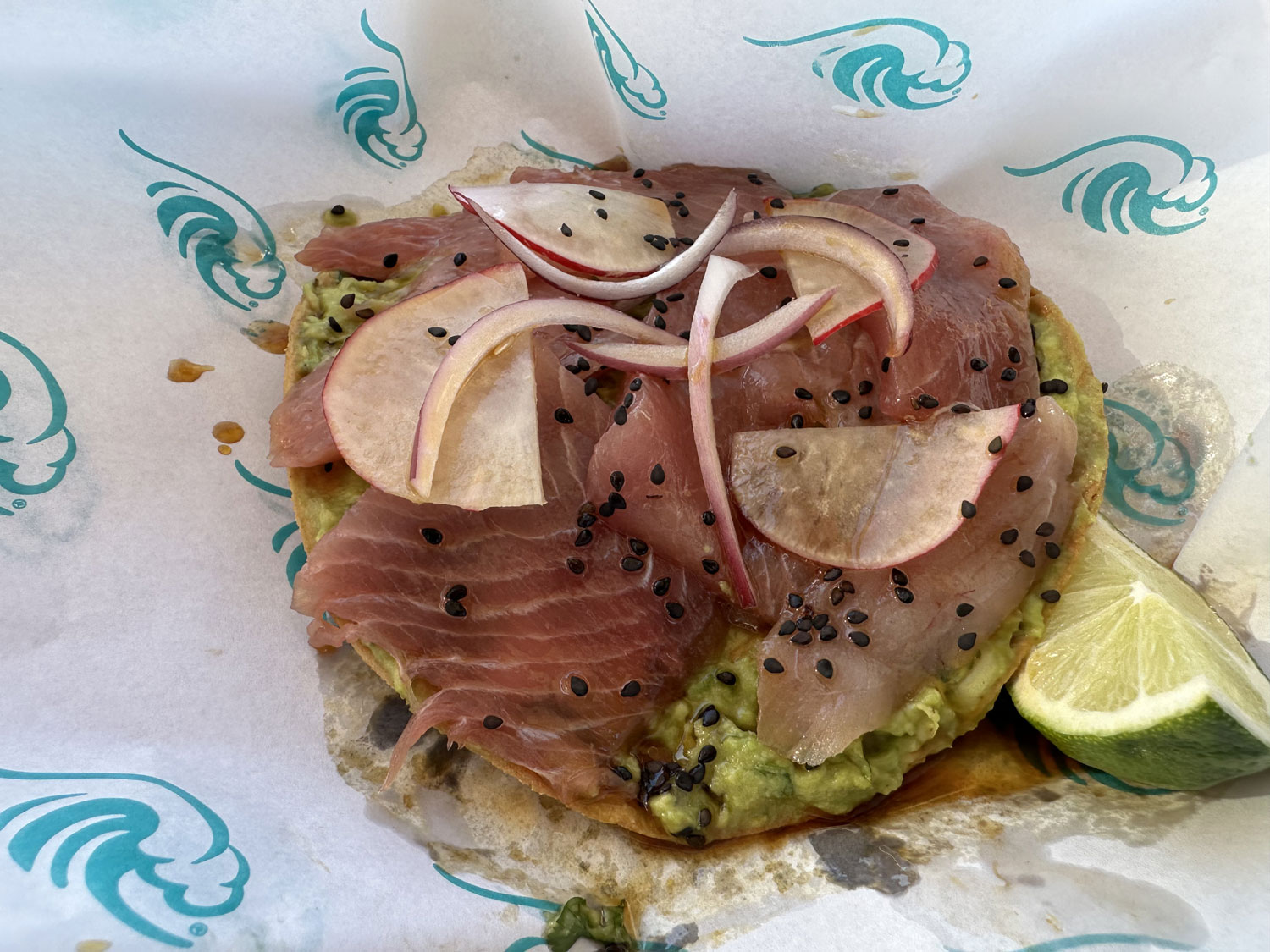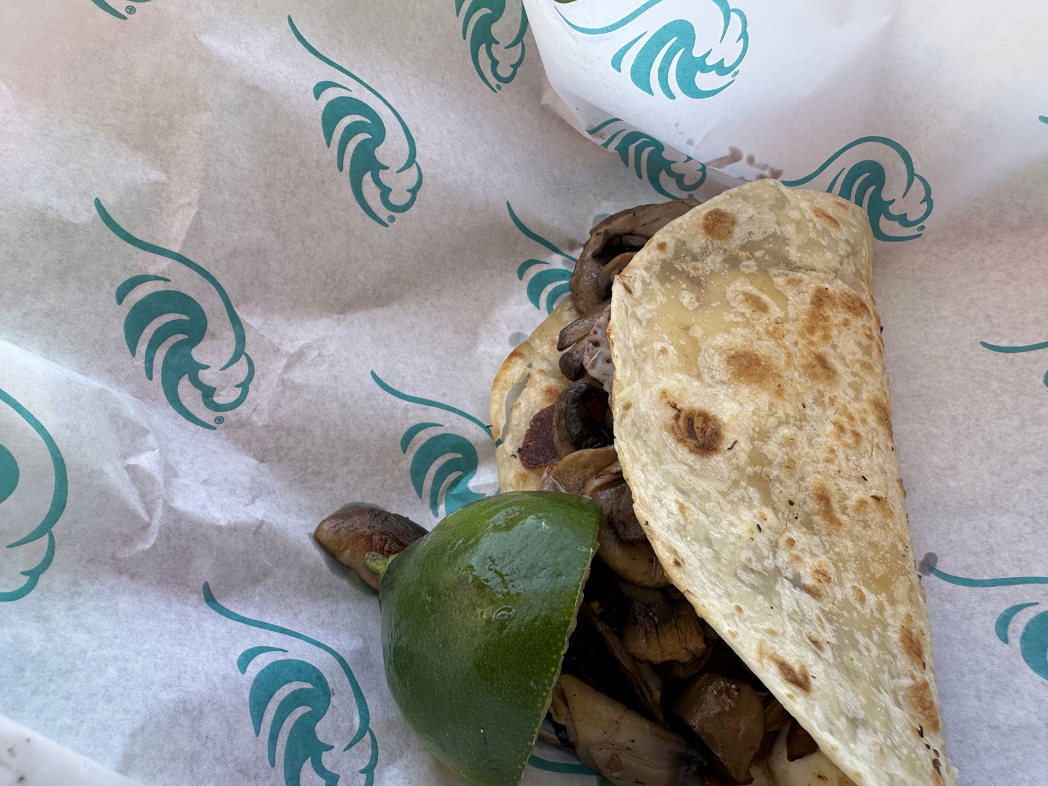 I decided to have my favorites – sashimi tostada (sin arugula) and a mushroom quesadilla. The tostada has a base of guacamole with some jalapeno slices interspersed and radishes and onions on top. The flour tortilla of the quesadilla is filled with cheese and lots of mushrooms. Lateral provides other salsas and Pico de Gallo to enhance the great flavor of each even more.