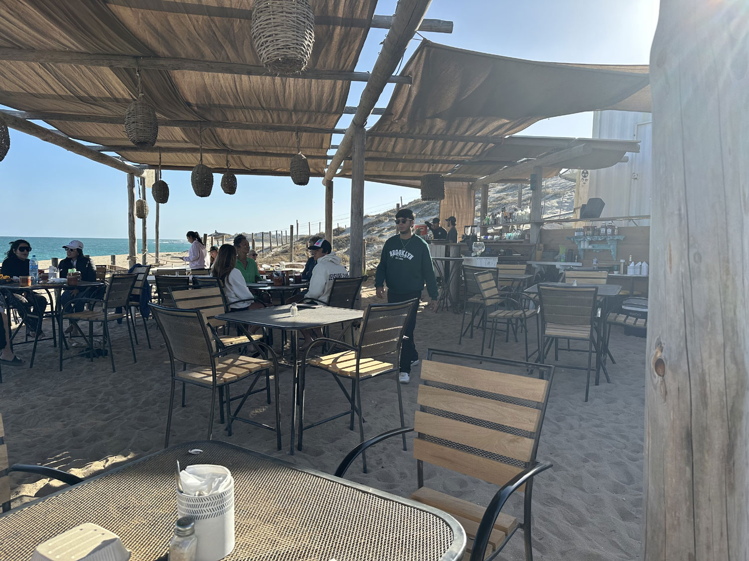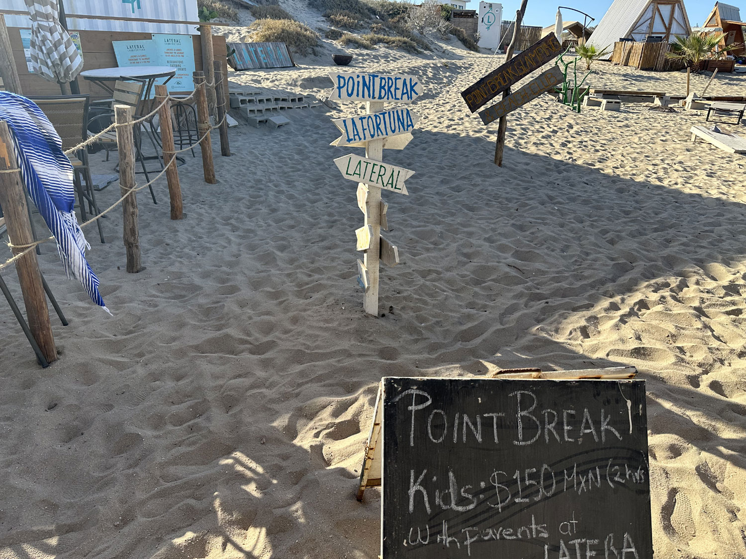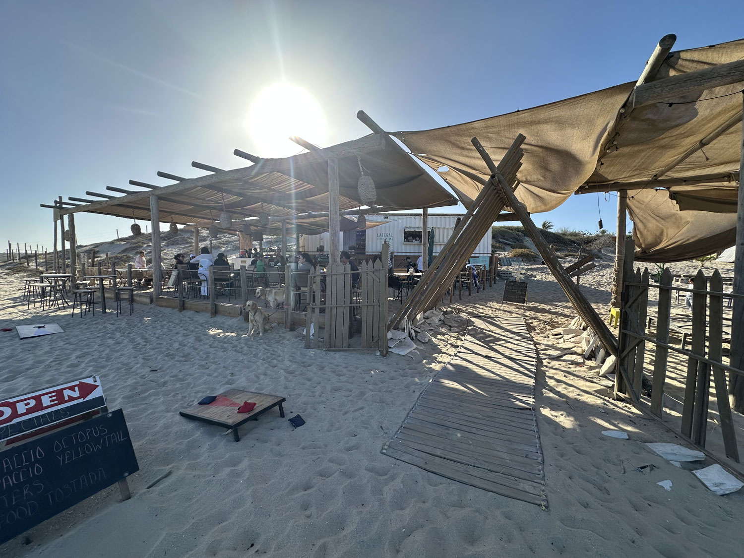 Last year Lateral Crudo y Asado opened a location on the beach in La Fortuna beside Point Break Glamping. A large container acts as the kitchen for the restaurant with solar panels on top to provide power for this off-the-grid location. The outdoor restaurant in the sand is partially covered by fabric to protect from both sun and rain. The menu at the restaurant mirrors the one at Lateral behind La Comer in San Jose del Cabo – tacos, quesadillas, fresh seafood, and guacamole, along with a full bar.