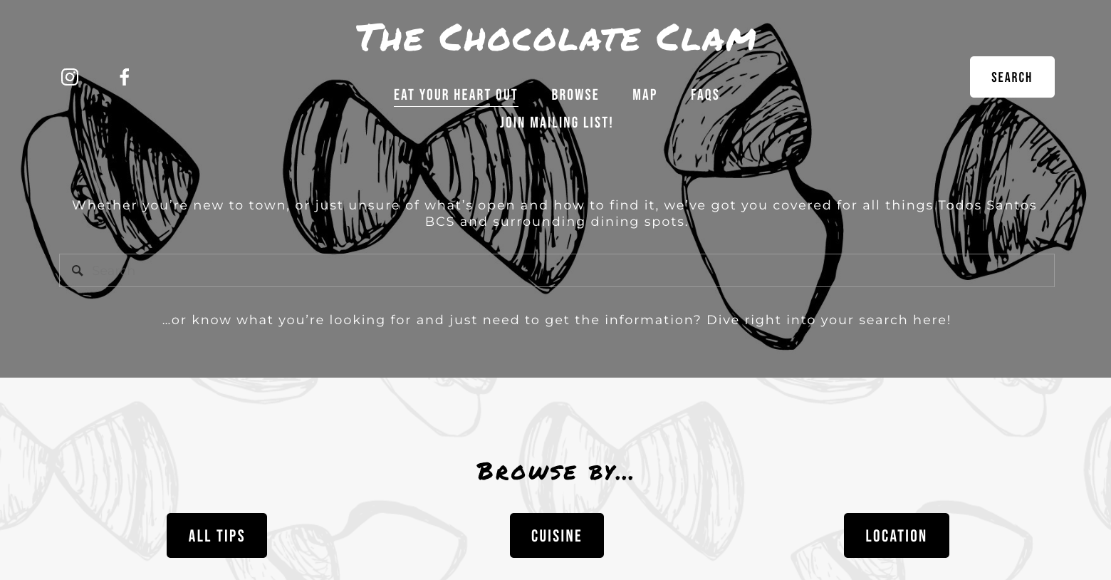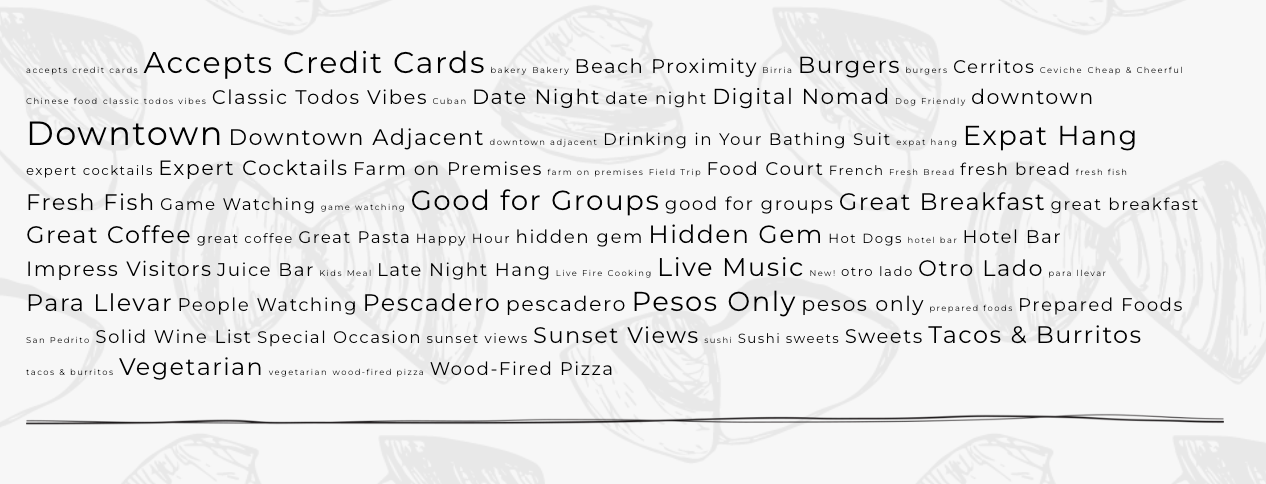 While Enjoy Los Cabos Life is a good source for a few great restaurants in these locations, given that we cover all five regions of Los Cabos, it is by no means extensive or exhaustive.  But I just found a pretty exhaustive source of information on places in Cerritos, Pescadero and Todos Santos (thanks Sam) – The Chocolate Clam.  The Chocolate Clam is a special website that let’s you search by Location, Cuisine or coolest of all – Tips.  The Tips page is like a digital cloud with a wide selection of keywords.  Just click on the one (or ones) that match your urge at the time and all of the restaurants that match it will come up.  The organizers have done a great job of providing information on restaurants, bars, coffee shops and more.  Check it out!