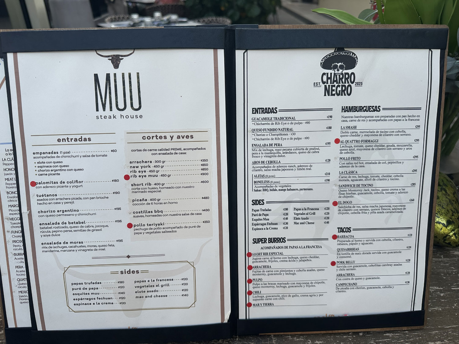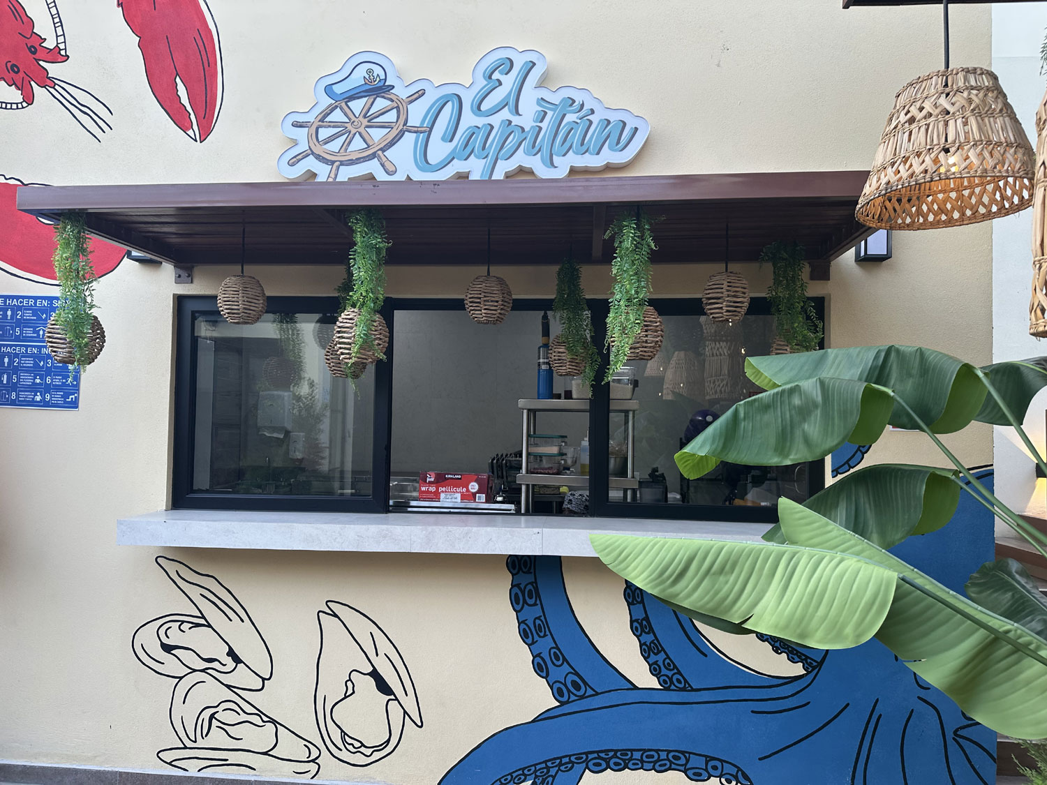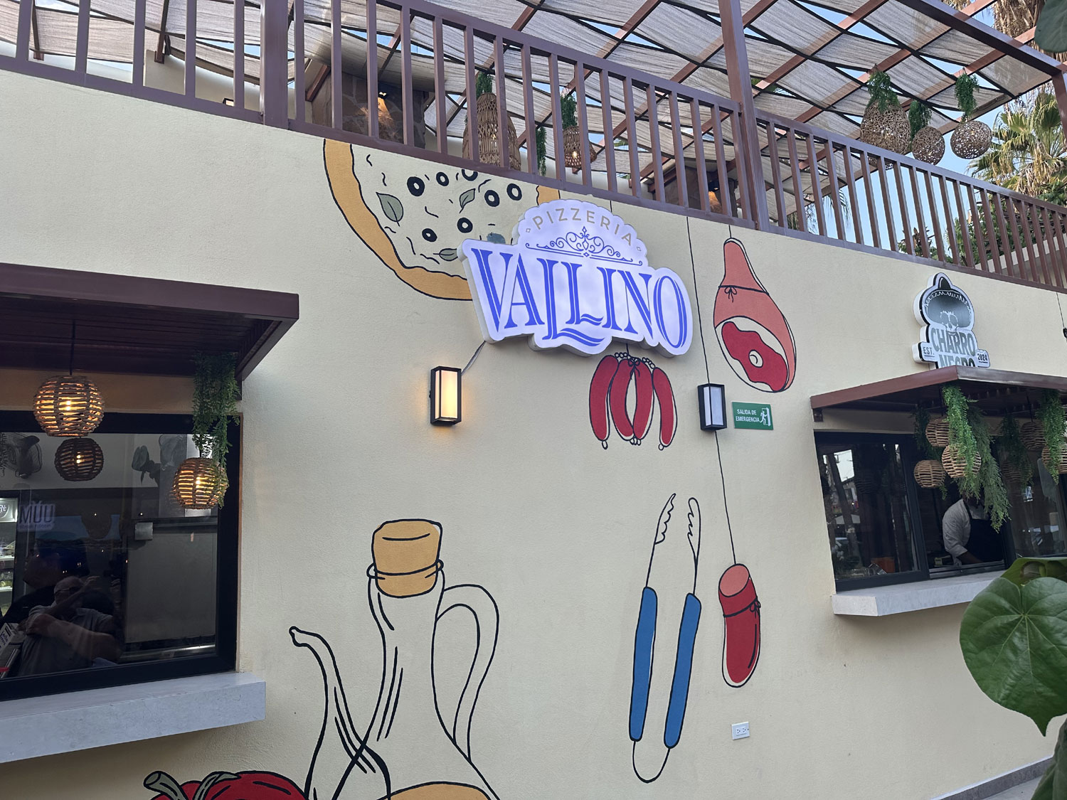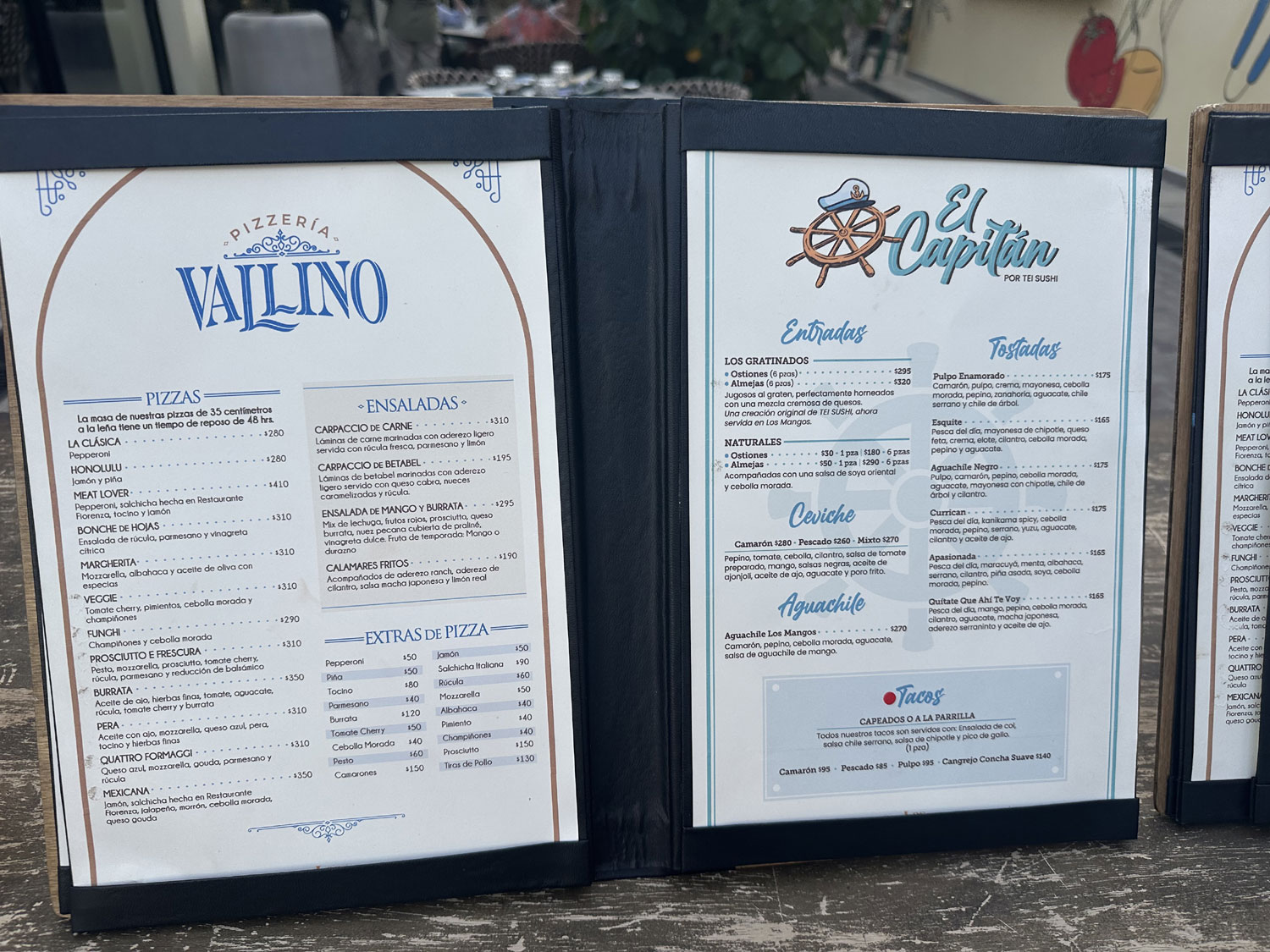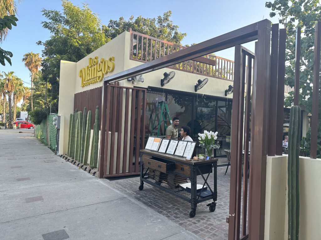 The small food park beside Teo’s Bar and Grill on Blvd Antonio Mijares has been completely re-imagined. With a complete build out of the space, diners can now choose from the combined menu of four different restaurants and dine either inside (air-conditioned), outside, or on the roof top. This new version opened on June 28th, 2025. Choose pizza and salad from Pizzeria Vallino; empanadas, steak and ribs from Muu Steak House; appetizers, hamburgers, tacos and more from Charo Negro and; Mexican food including ceviche, aguachile, and tostadas from El Capitan. All four menus are combined into a single menu with lots of drinks and cocktails from the central bar in the outside area from which to choose.