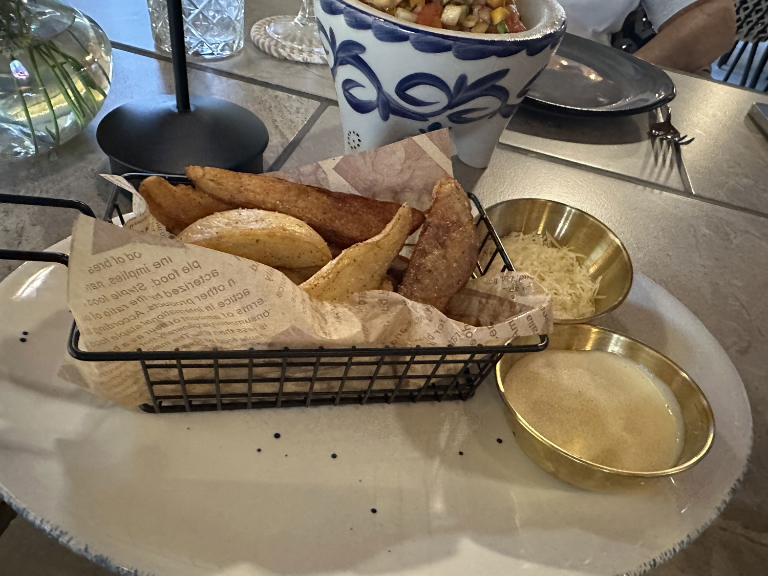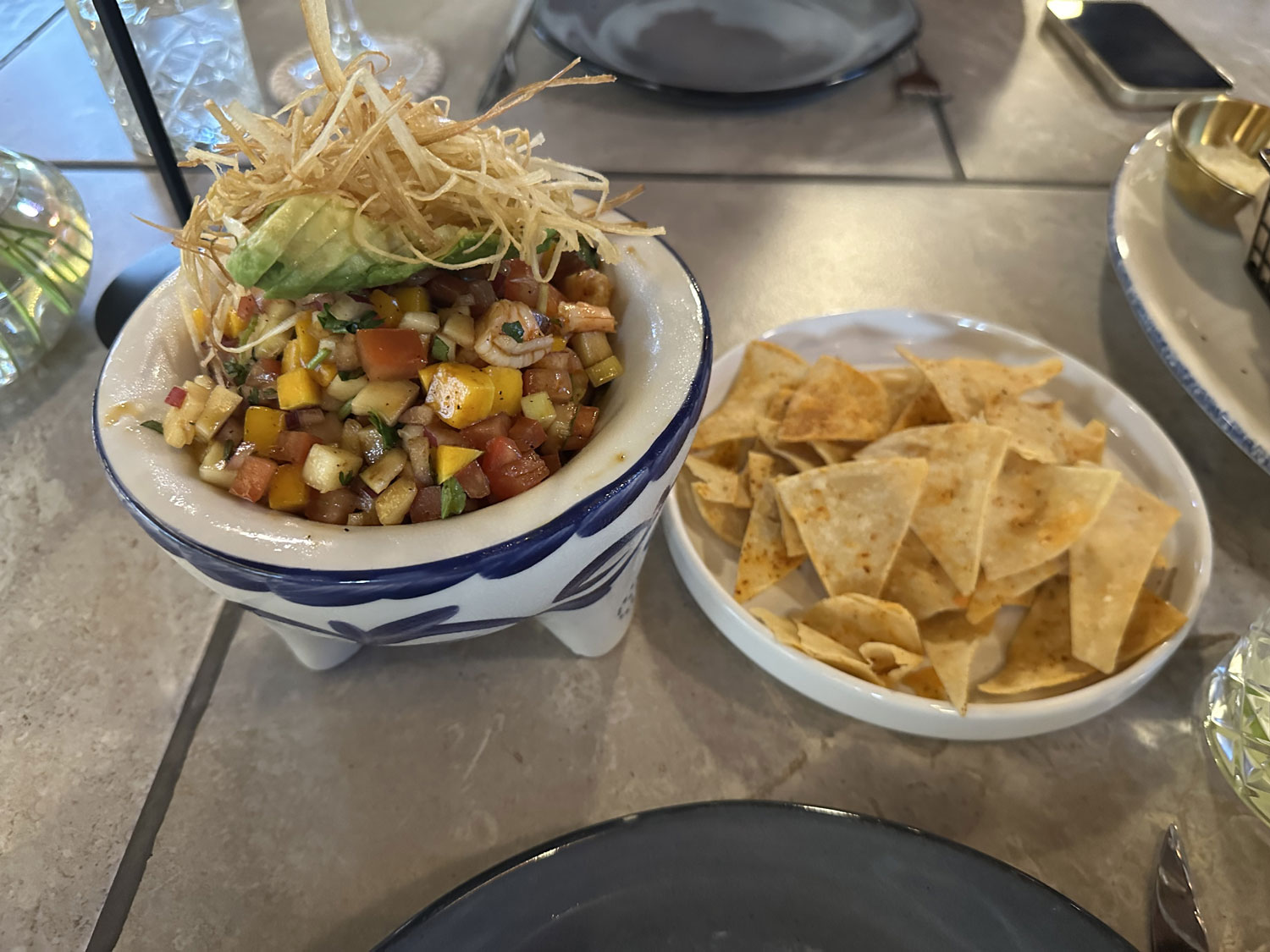 Walking up to Los Mangos Food Park, you are greeted by a host with all four menus and display and a description of what is available both in terms of food and seating. We chose to sit inside in the large air-conditioned room that goes the length of the restaurant along the left side. Three big screen televisions on the wall were showing pictures different areas of Mexico. Our server, Jose introduced himself and his partner and asked us what we would like to drink. I asked for house water and a diet coke and Beth choose a limonadaminerale. The female member of our serving team brought over a tray and asked if we would like lemon, lime, or orange from our water, which was poured from a large pitcher.
