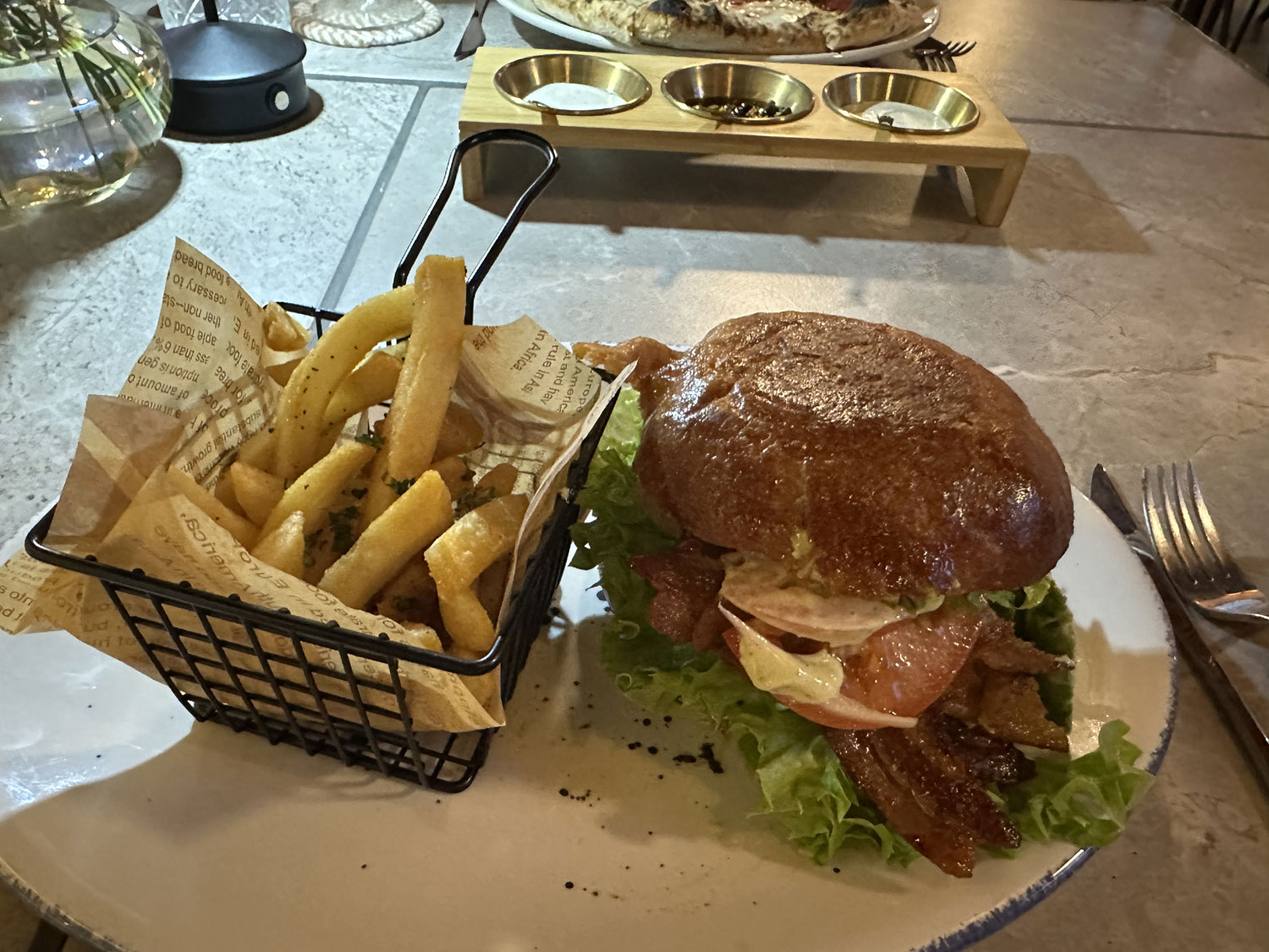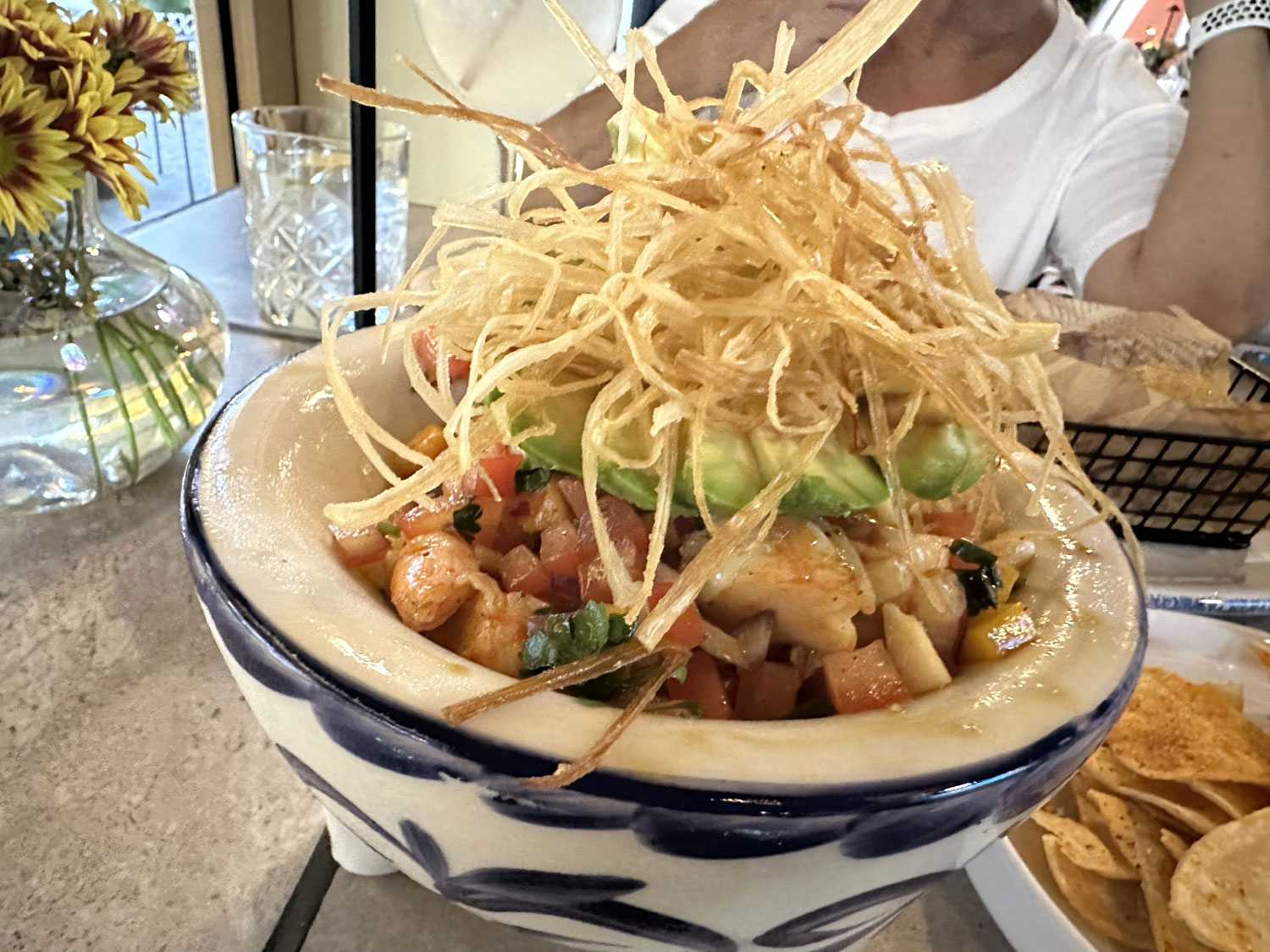 After reviewing the menus, I decided to try the mixed ceviche – shrimp and fish – as an appetizer. Beth wanted the truffle French fries. The ceviche was served in a large Mexican bowl with avocado and crispy onions on top. The shrimp was mixed with diced mango, cucumber, and tomato. It was delicious and enough for two or three people easily. The truffle fries were large wedges with a crispy exterior. For our main course, Beth chose a Margherita pizza and I had a Classic Hamburger. The Hamburger was huge with two patties, cheese, lettuce, tomato, avocado, and bacon. It was served with a basket of crispy French fries. The Margherita Pizza had a big crust and five large circles of cheese over the tomato sauce. It was served with three different sauces, if you wanted to add to the flavor. Both were excellent and we ended up with take home of ceviche, pizza and half my hamburger for another meal.