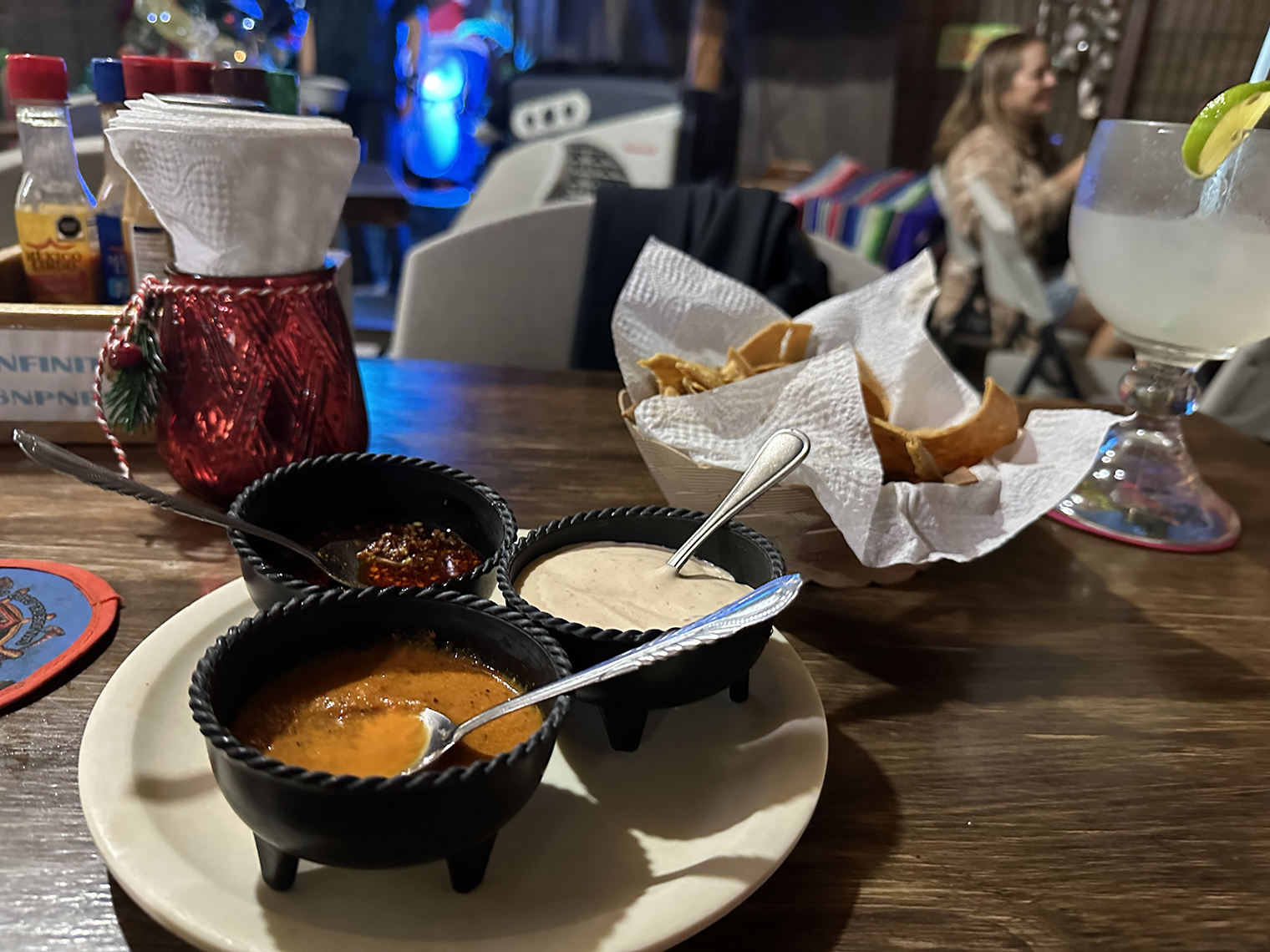 It was the week before Christmas on a Friday night and Abby’s was decorated for the holidays. There was live entertainment with a singer using a loop for the music to accompany his vocals. Our server brought us the menus and a basket of tortilla chips with three different salsas. We asked for guacamole to start as we were looking through the menu. The guacamole was just how we like it with tomatoes and onions mixed in and a pile of jalapenos on top (most of which we moved to the side). A great start to the meal.