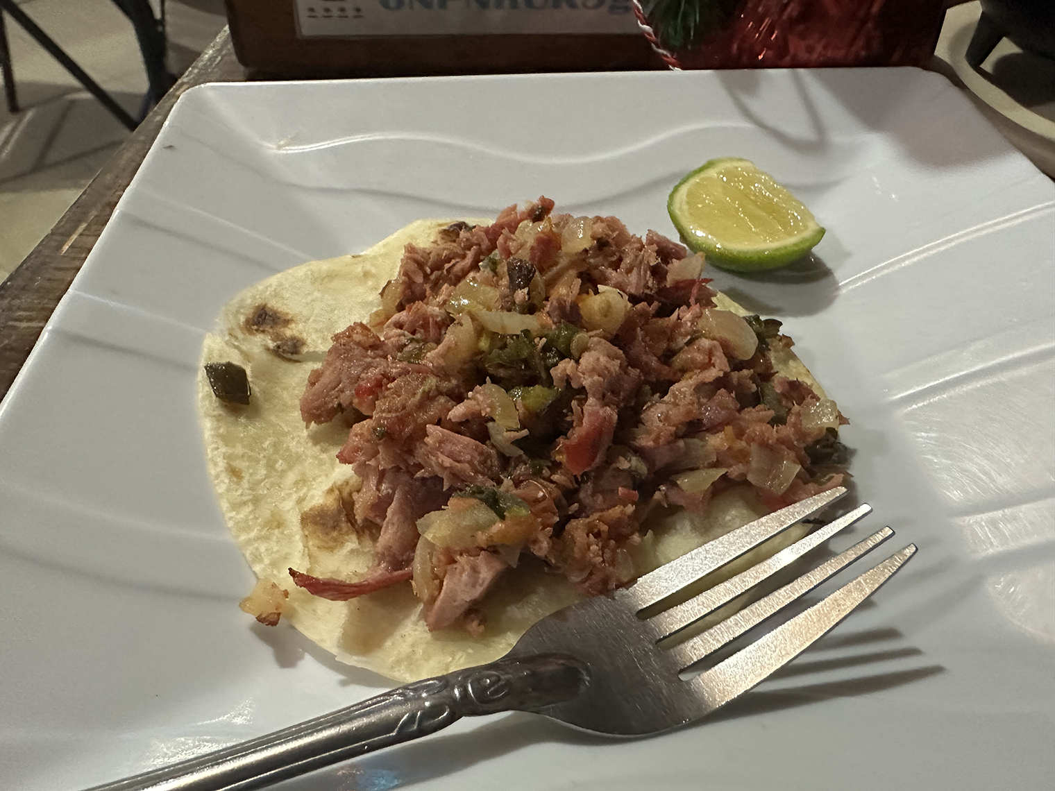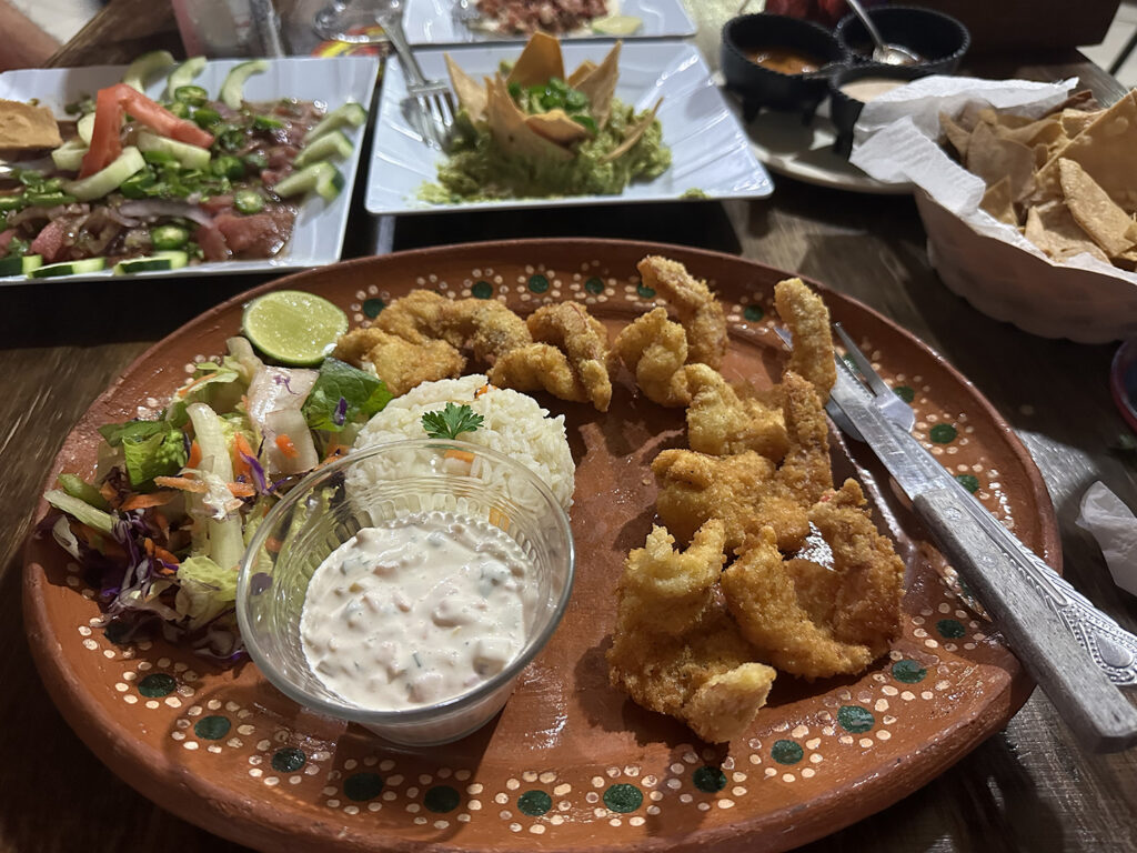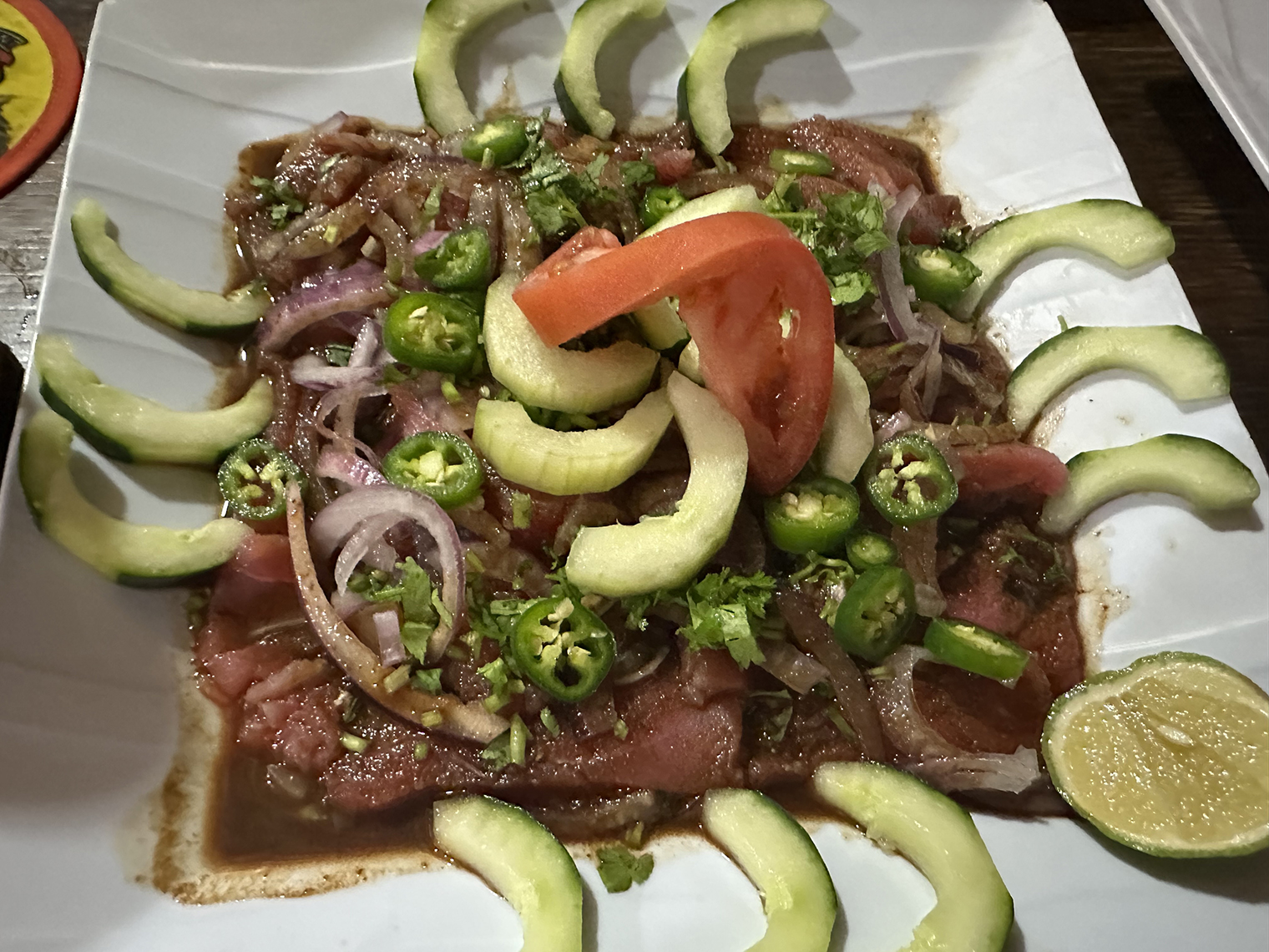 I love tuna so I decided on two different fresh tuna dishes – sashimi and a tuna taco on a flour tortilla. Beth ordered the breaded shrimp dinner. I had forgotten how big the sashimi appetizer was – a huge platter with onions, cucumbers, tomato, jalapeño and a soy sauce. There were at least 16 big pieces of tuna sashimi. The tuna was also quite large with onions and peppers mixed in. The food was great but too much. I ended up taking part of each item home to eat for lunch the next day. The bread shrimp platter came with salad, rice and a small bowl of tartar sauce. Beth liked it a lot.