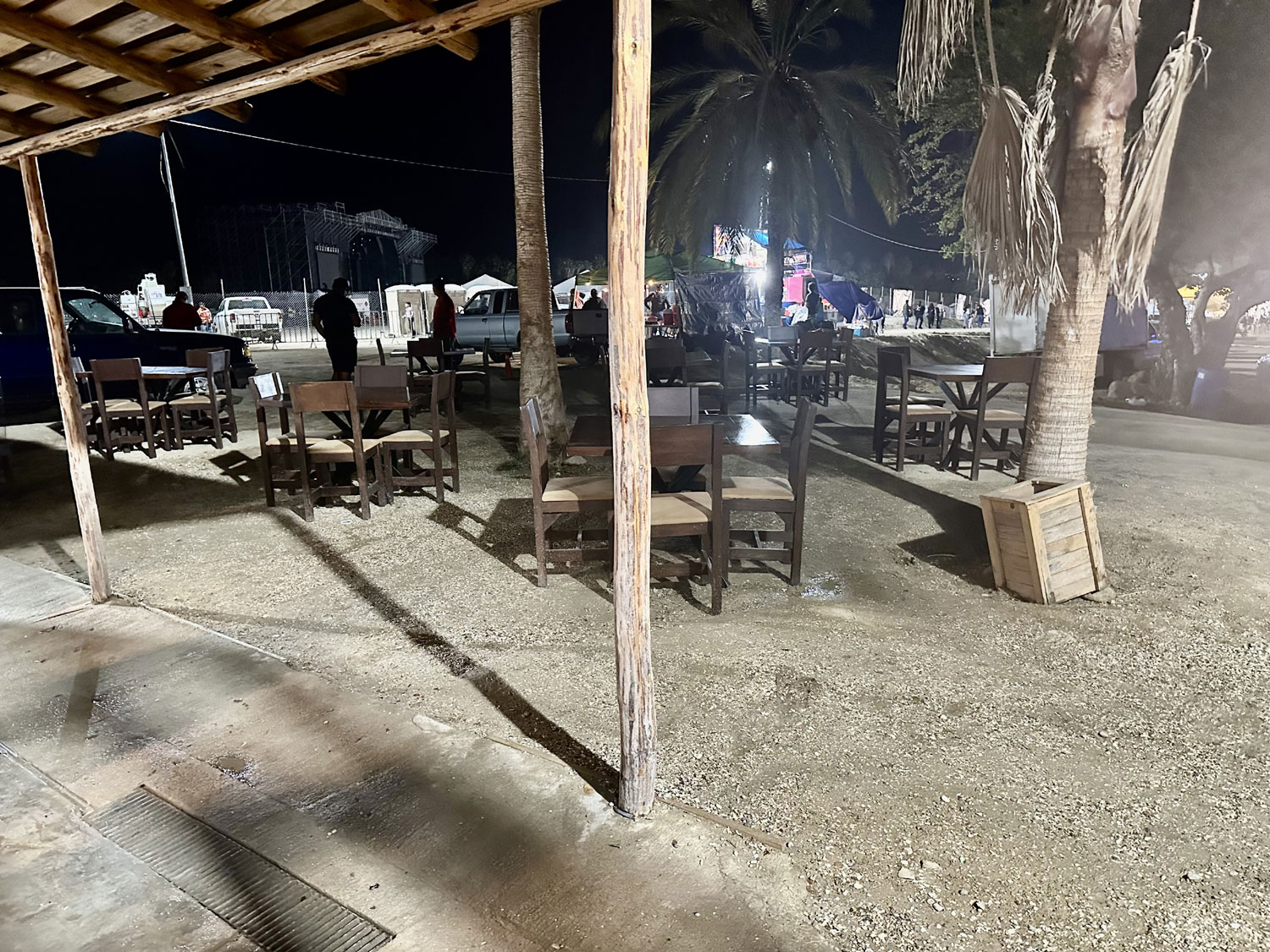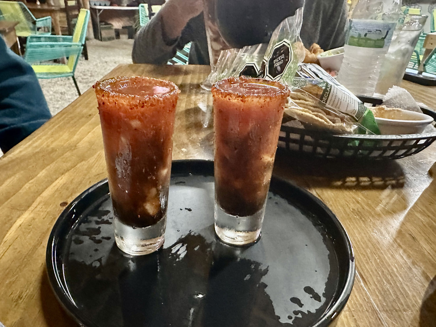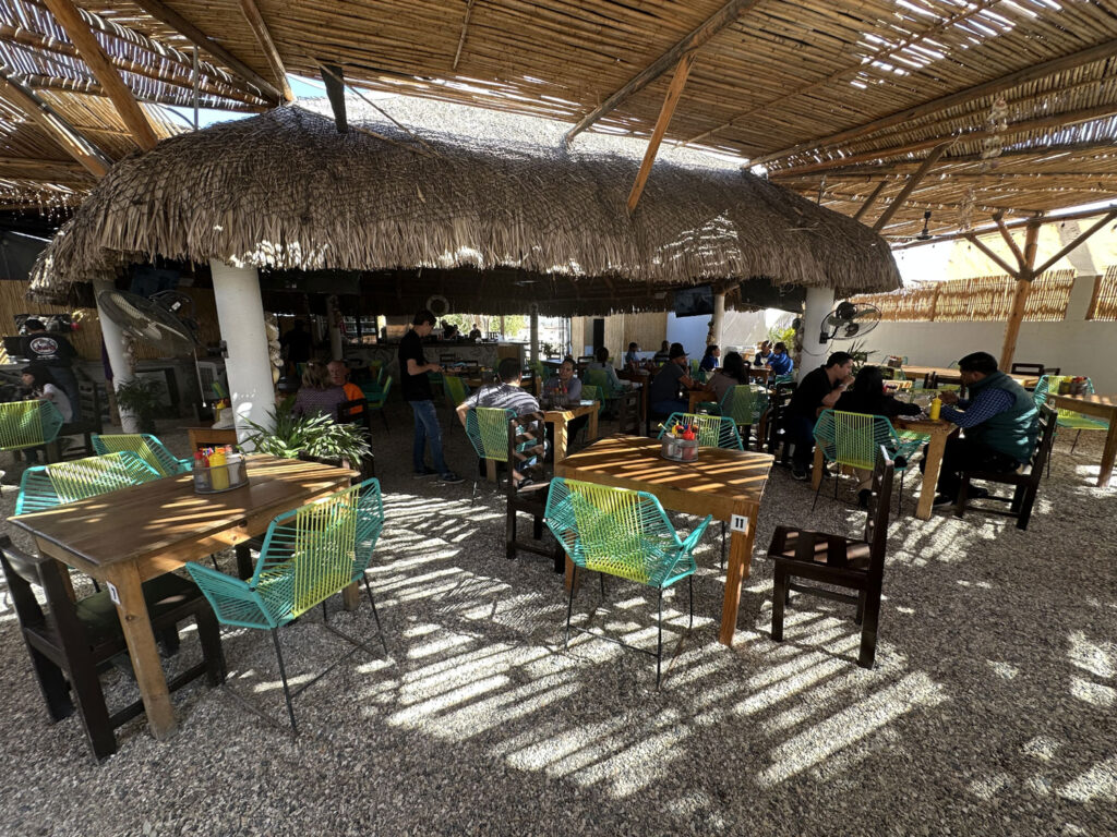 Located off Centenario on the road behind the stadium is a relatively new seafood restaurant – Mariscos El Tiberon de San Carlos. I had tried it for lunch and decided to go back with two friends from the East Cape for dinner. Unfortunately, it was night during the San Jose Festival, which meant getting to it through the police barricades was a challenge. The outdoor restaurant is very pleasant. We could see the ferris wheels out the back of the restaurant. Large flat screen TVs play videos of Mexican music. The menu is extensive with appetizers, cold seafood specialties, seafood cocktails, aguachiles, ceviche, oysters and clams in the shell, tostadas, tacos, grilled octopus, lobster, shrimp, and fish filets. There are even meat and chicken choices for non-seafood lovers, and a kid’s menu.