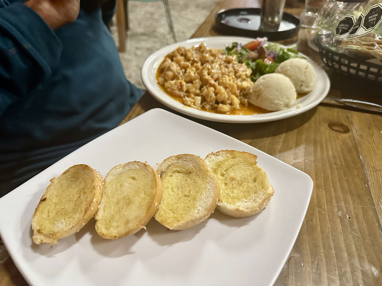 Our server brought us menus and a large basket of tostadas, crackers, and a chipotle sauces as a starter for the table, which also had a basket of every hot sauce you can image. Ethan and Larry asked for the half-order of Campechana, a cocktail in a large glass with shrimp, fish, and other seafood in a cocktail sauce. Each was big enough for two people and excellent. Larry and I both chose the Baja Fish Tacos as our main course, which came with Pico de Gallo, coleslaw, guacamole and another sauce. There were three tacos with three pieces of breaded fish in each. A very large portion and very good. Ethan ordered the Shrimp French Style. This was a large platter of shrimp in four cheeses with mashed potatoes and salad, and served with garlic bread. Again, the portion was huge and could have fed at least two diners.At the end, Larry and Ethan had a shot of a small special cocktail (sorry, don’t know what was in it).