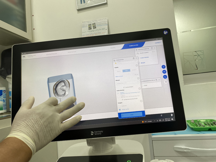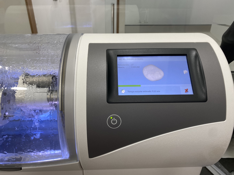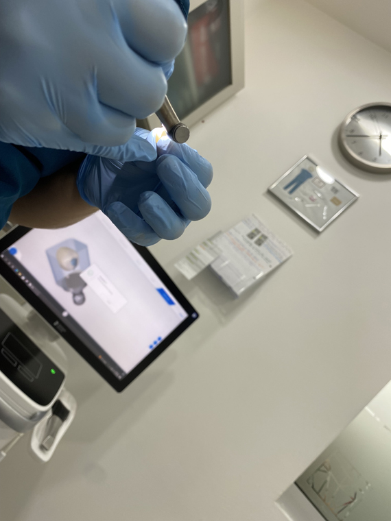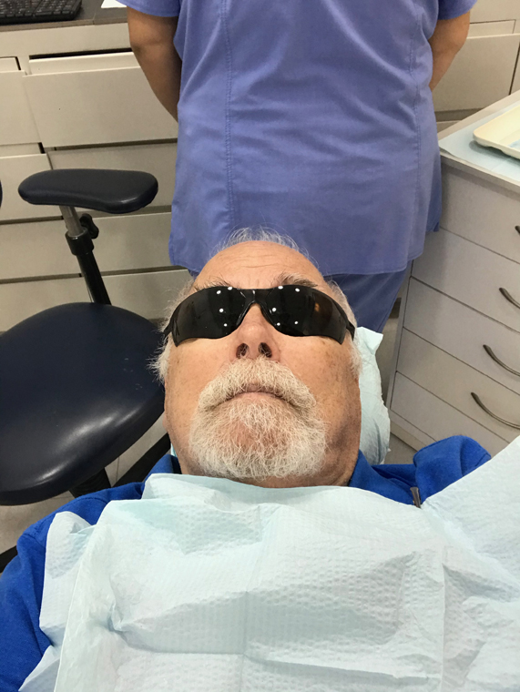 So the process started and 45 minutes later, I was leaving with the new crown in my mouth. How does this happen? First, Dr. Pedro ground down the cracked tooth. Part of this process was done with small magnifying eyepieces on Dr. Pedro. Then digital impressions were taken of the tooth from all directions with a wand that was placed in my mouth. The next step was for Dr. Pedro to manipulate the digital images on a screen behind me in the chair. The completed image of the crown was then sent to the 3-D printer in another room, where a block of porcelain, matched to the color of my teeth, was mounted in the printer. The printer then cut the block to the exact dimensions of the crown that was to be mounted. It was brought out and polished by Dr. Pedro’s assistant. The crown was pressed in my mouth and the fit and height checked. It was then glued onto the tooth and everything was finished – in 45 minutes!