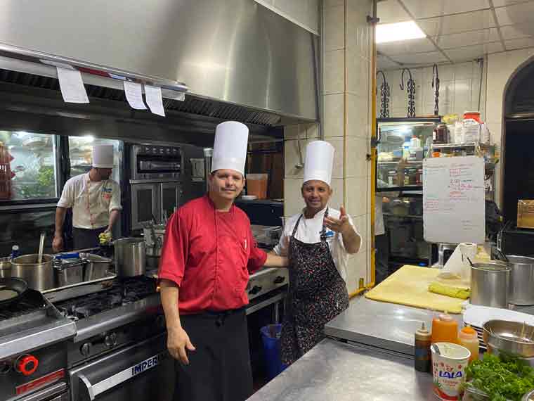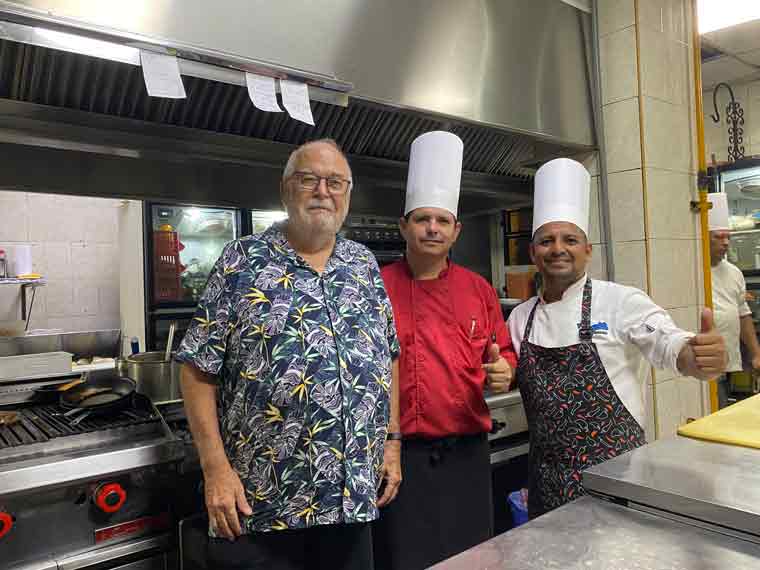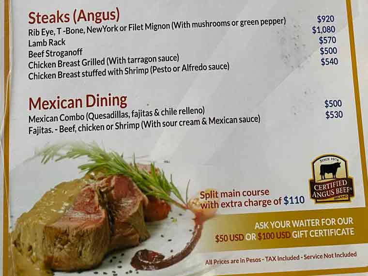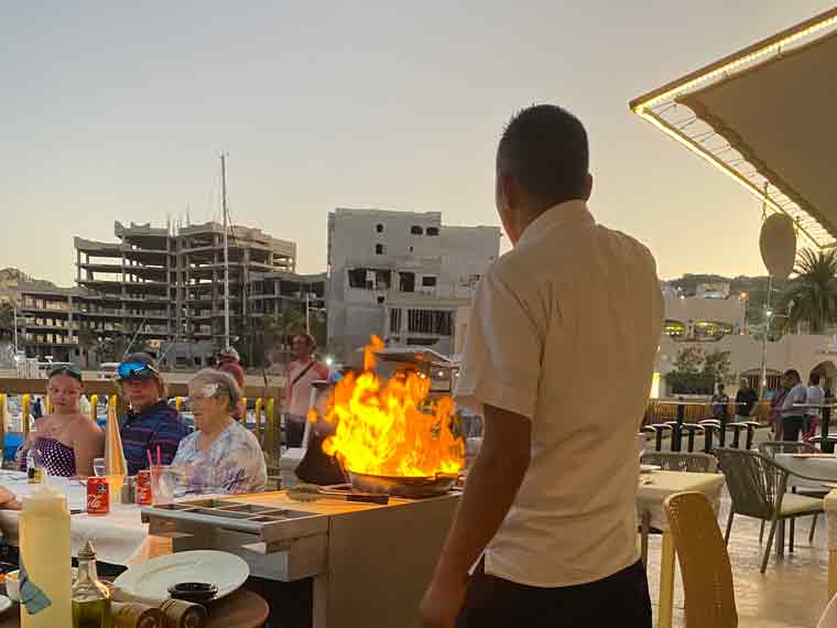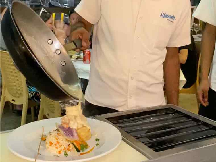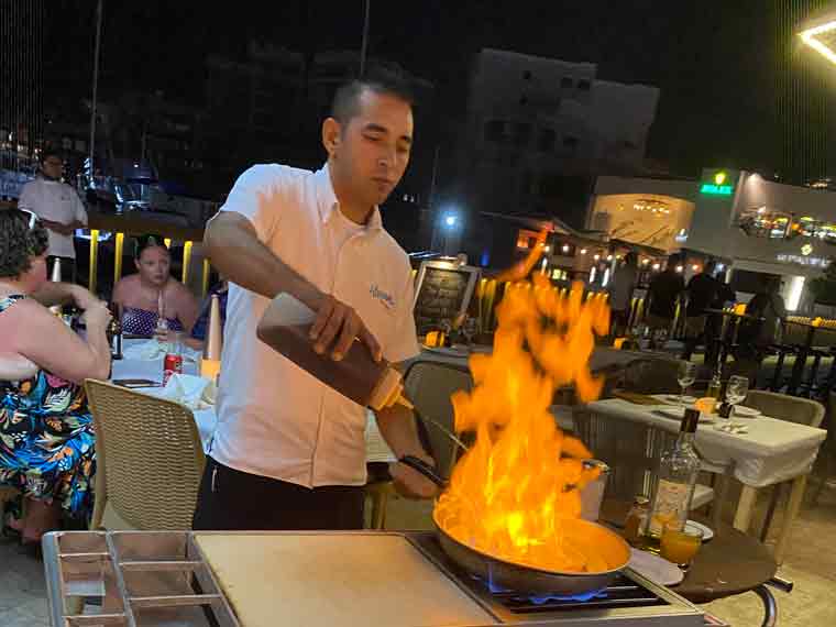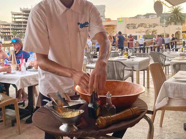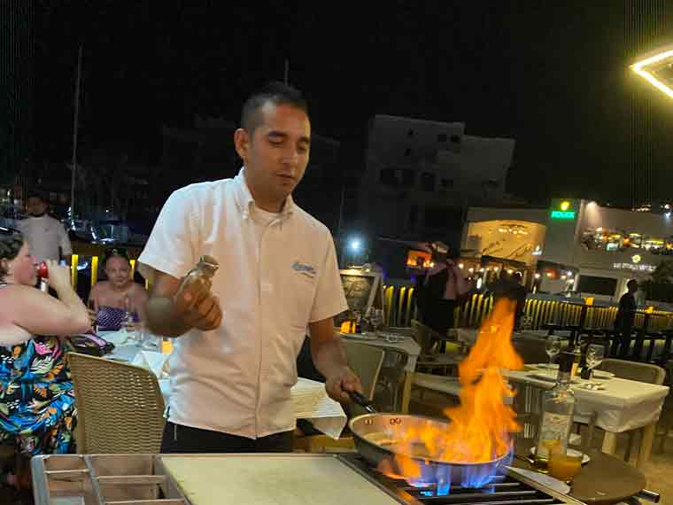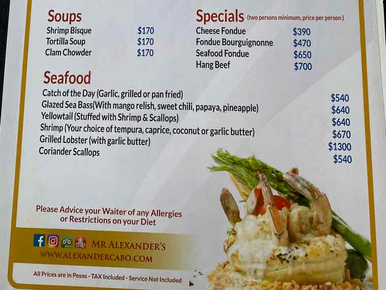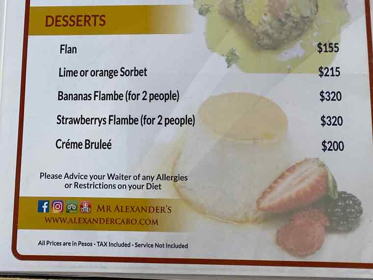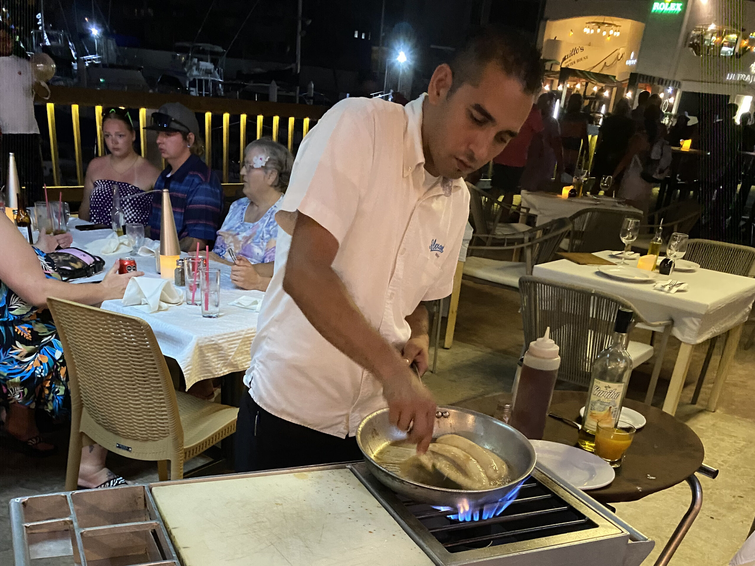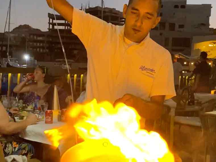 But it turns out that Alex Brulhart, the chef and owner of the restaurant has been in business in Cabo San Lucas for over 10 years. Alex brings Swiss, French and Mexican influences into the foods offered on the menu. Arriving at the marina, you can see that there is a large outdoor dining area, a bar and indoor area up a few stairs and even a private dining room for events. The menu includes a wide range of choices of soups, salads, hot and cold appetizers to start and choices of seafood, steaks, pastas, fondues and even gluten free items as main courses. There is truly something for everyone. Alexander’s also specializes in a number of the items being prepared table side.