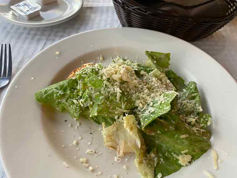 While looking through the menu and making our decisions, Beth enjoyed a Pina Colada (a rare occasion limited to Mama’s on Maui or our anniversary) and I had my standard Chardonnay along with the fresh rolls served to us. We decided to take advantage of some of the table side preparations, starting with the traditional Caesar salad to share. The server combined all of the traditional ingredients in a wooden bowl – egg yolk, garlic, lemon, oil, anchovies, Worcestershire sauce – to make the dressing. I had the fresh parmesan added to my salad (Beth did not). I couldn’t wait to try and even forgot to take a picture until I was half through with it.