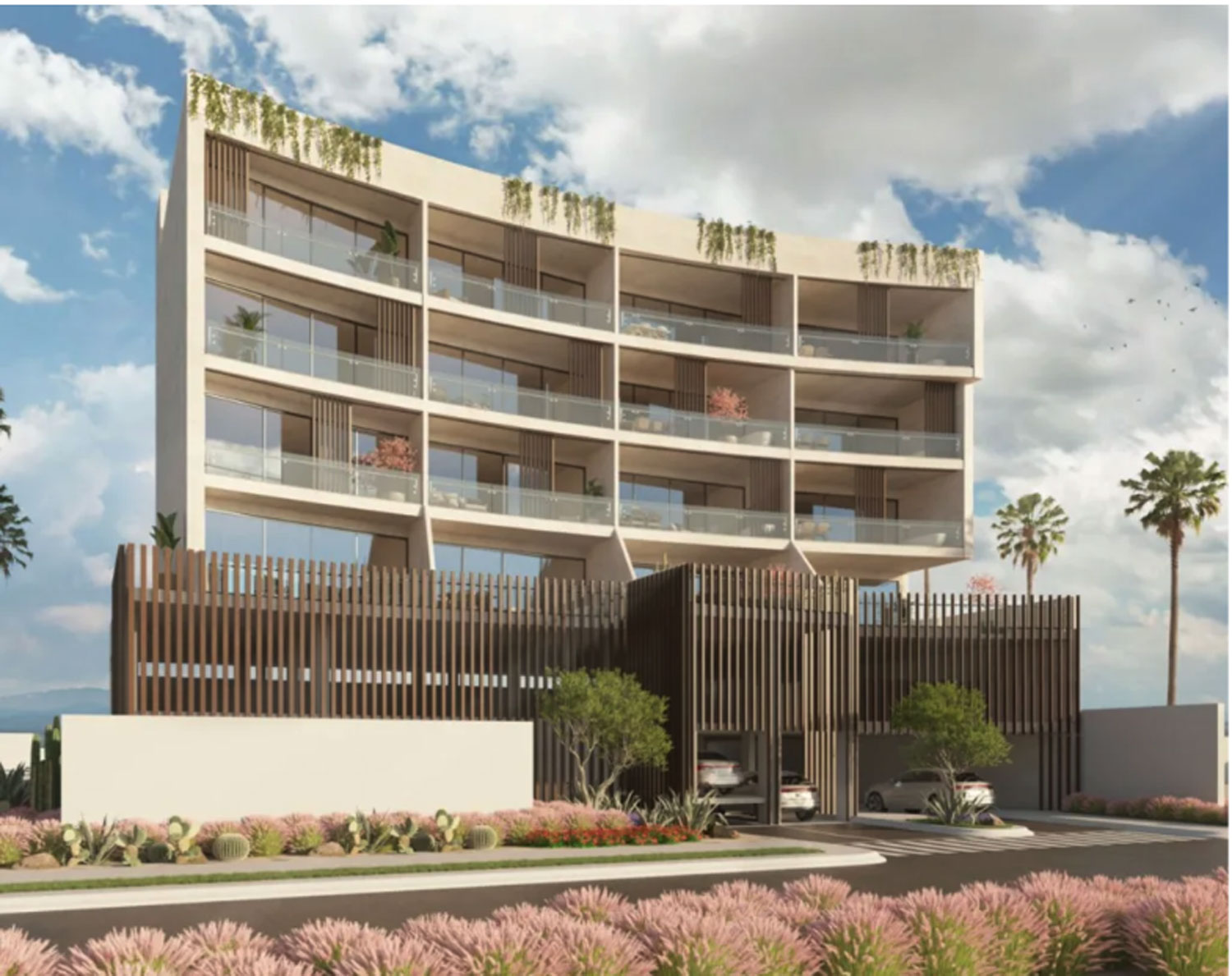 Down from the plazas below La Comer in Bahia de Palmas are three additional projects – two on the beach. Nolah is a 16-unit condominium complex offering two and three-bedroom and three-bath units of ranging from about 900 square feet to approximately 1,300 square feet. With views of the Sea of Cortez, the development is only steps from the beach. The units are for sale for approximately $850,000. There is a rooftop area with a pool and semi-private cabana lounge areas, with a great view of the Sea of Cortez.
