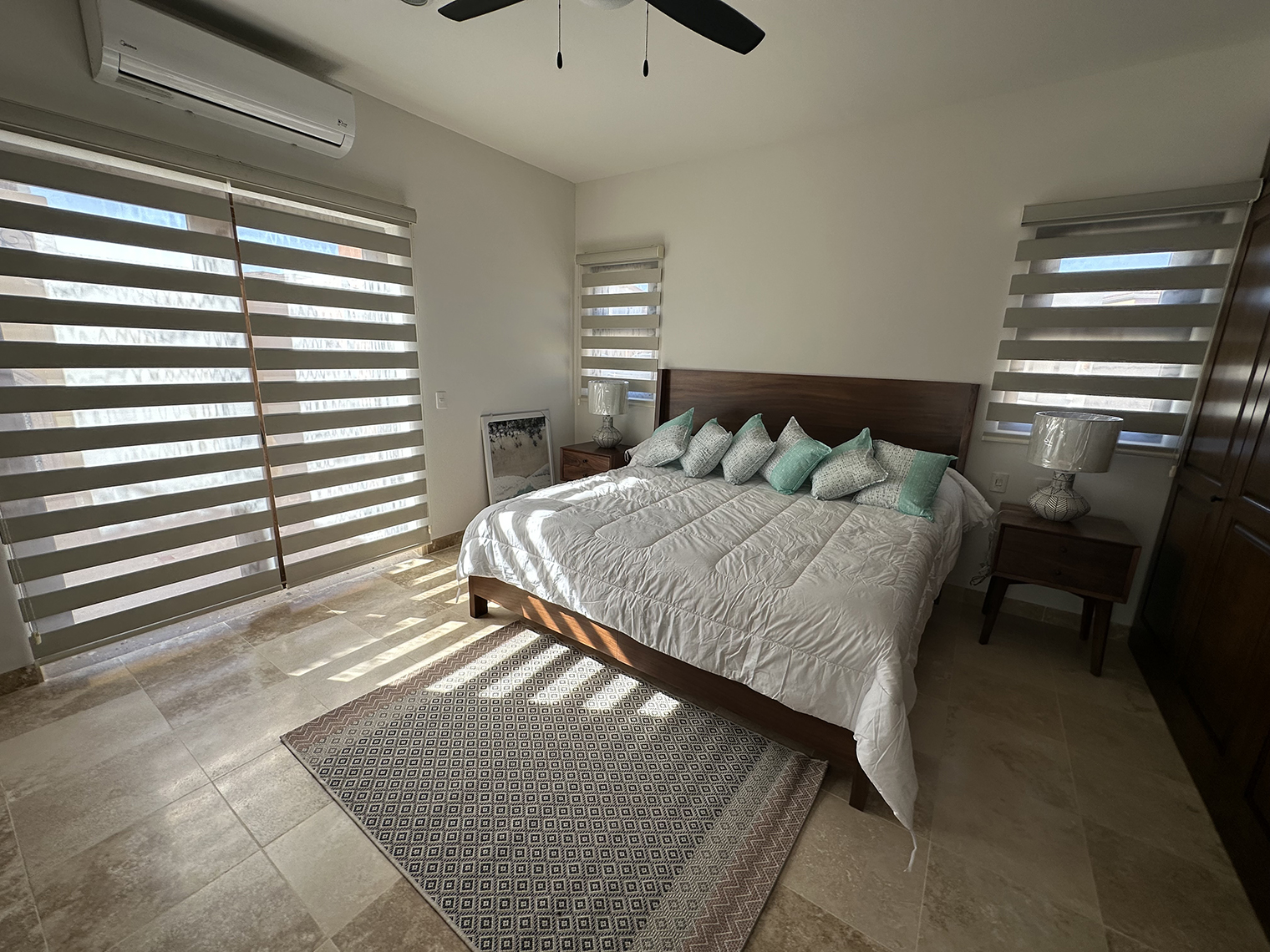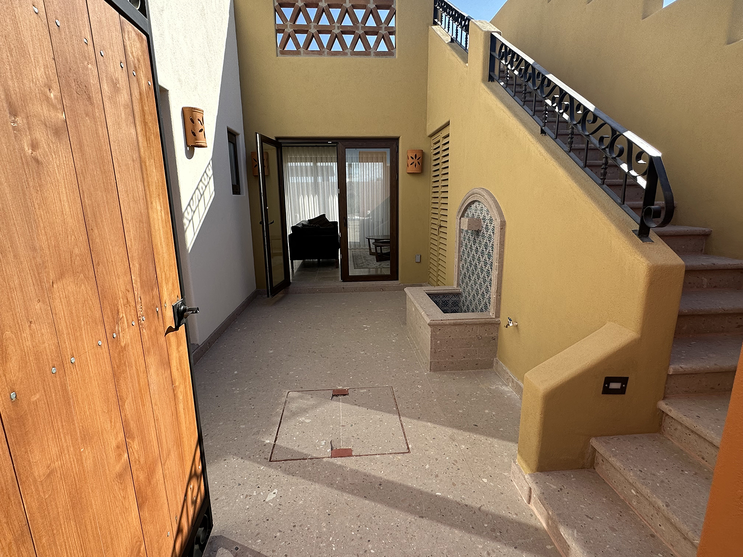 The first floor of the town house has an interior courtyard as you enter with a fountain, tiled with colorful Talavera tiles, with the master bedroom to the right and the living room straight ahead. The combined kitchen, dining and living room is fully equipped with sliding pocket doors that open the wall completely to a large furnished outdoor patio area. The patio also has a full outdoor kitchen with BBQ, sink and refrigerator. There is a gate from the patio that provides closer access to the swimming pool.
