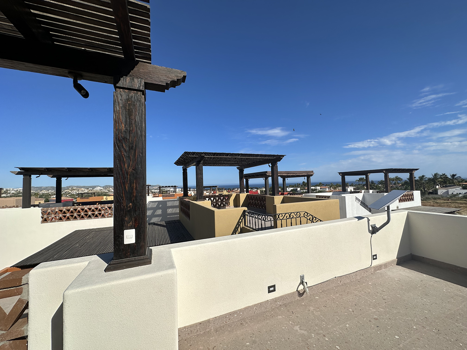 Stairs from the courtyard lead up the second floor with another large outdoor space and a second master suite with a pergola over the entry and a small balcony off the bedroom. Stairs rise from the second floor to the third-floor roof deck covered with a pergola with extensive views.