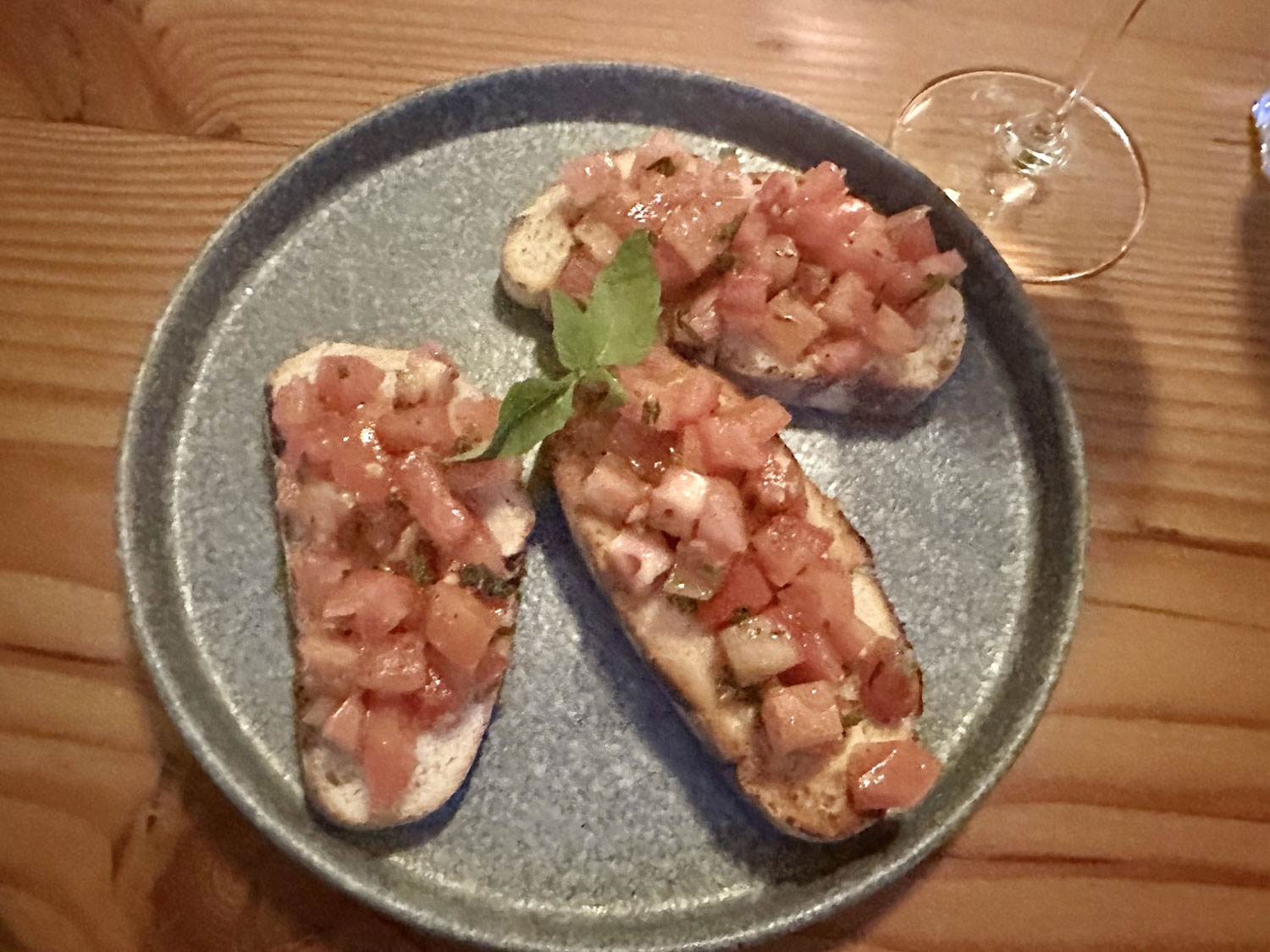 The restaurant has both indoor and outdoor seating or seating at the bar, if you want a cocktail and some appetizers. It is very well designed. Cristiano met us at the door (there is parking right in front in their exclusive zone) and asked where we would like to sit. We chose a table along the back wall in the outdoor section. There is a long banquette with great cushions along the wall. Our server provided us with menus and asked what we would like to drink. Beth asked for limonada mineral and I selected a glass of Chardonnay. The menu provided a full range of Italian choices – appetizers including wood-fired focaccia, salads, risotto, homemade pastas, meat, fish and chicken dishes, and wood-fired pizzas. There were also a few specials shown on a blackboard.