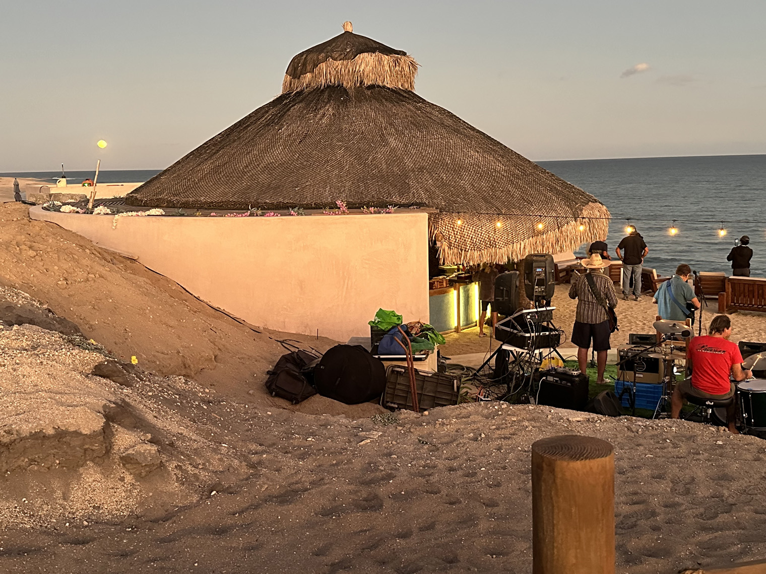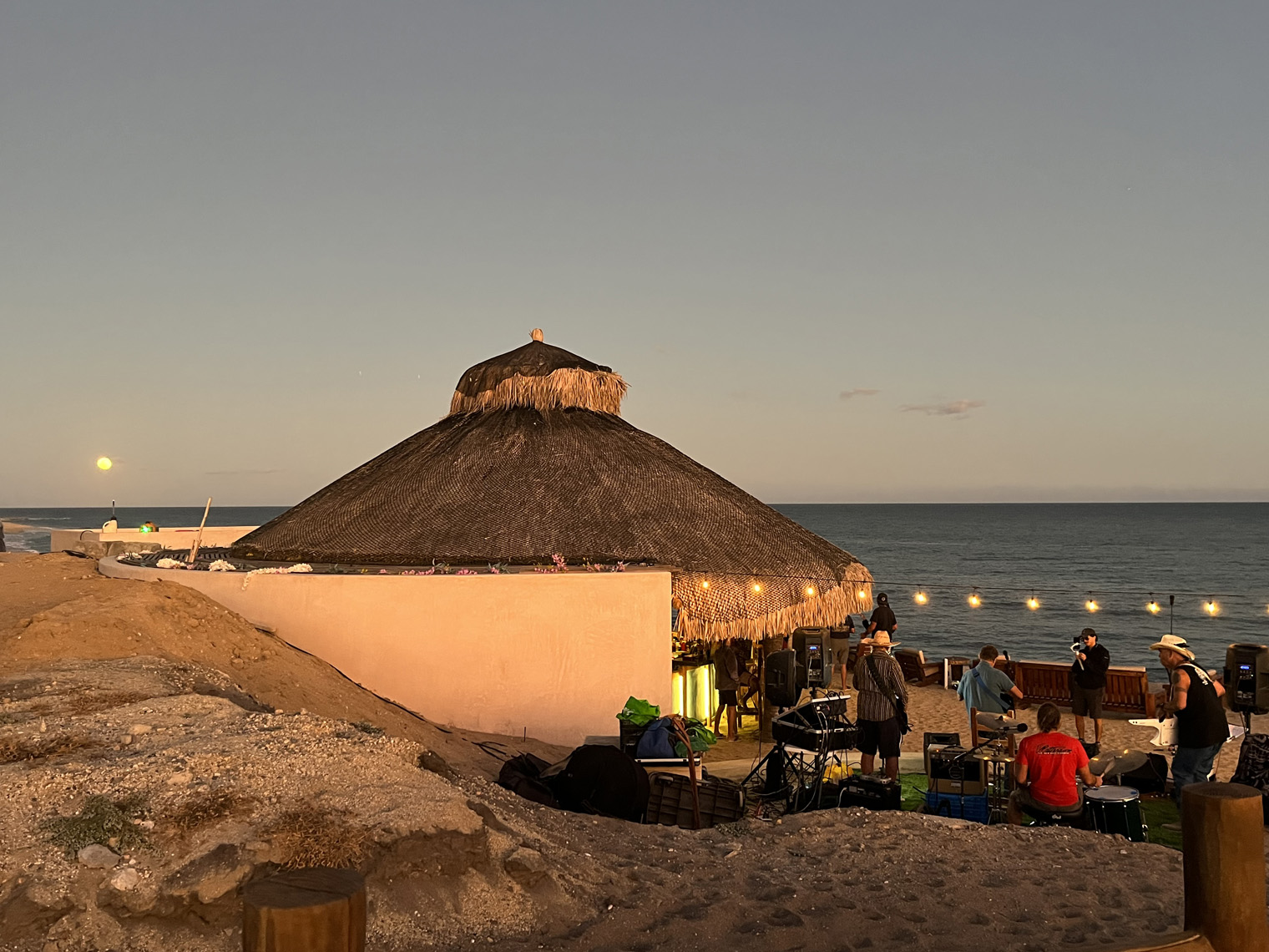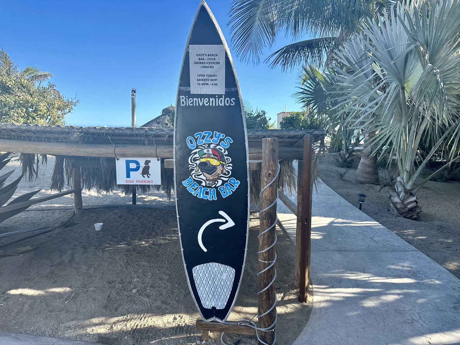 Carrying on the tradition of Zai Sushi, the cocktail menu has drinks named after neighborhoods, dogs and places on the East Cape as well as some well-known cocktails. On the west side of the palapa is a stage for live entertainment. From time to time, Ozzy’s has tacos catered from a local provider. During our visit, the homegrown band from our old neighborhood – The Lost Dogs of Zacatitos – were playing joined by Dan from Extra Large on keyboards. Josh (guitar and vocals), Tim (guitar and vocals) and Chris do a great job with both original tunes and classics.