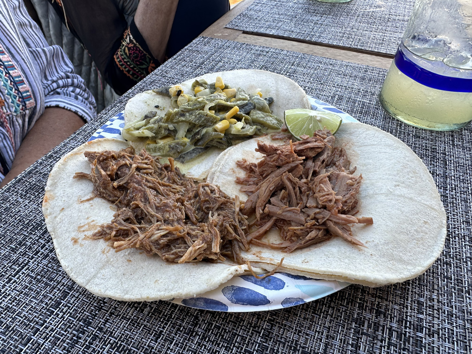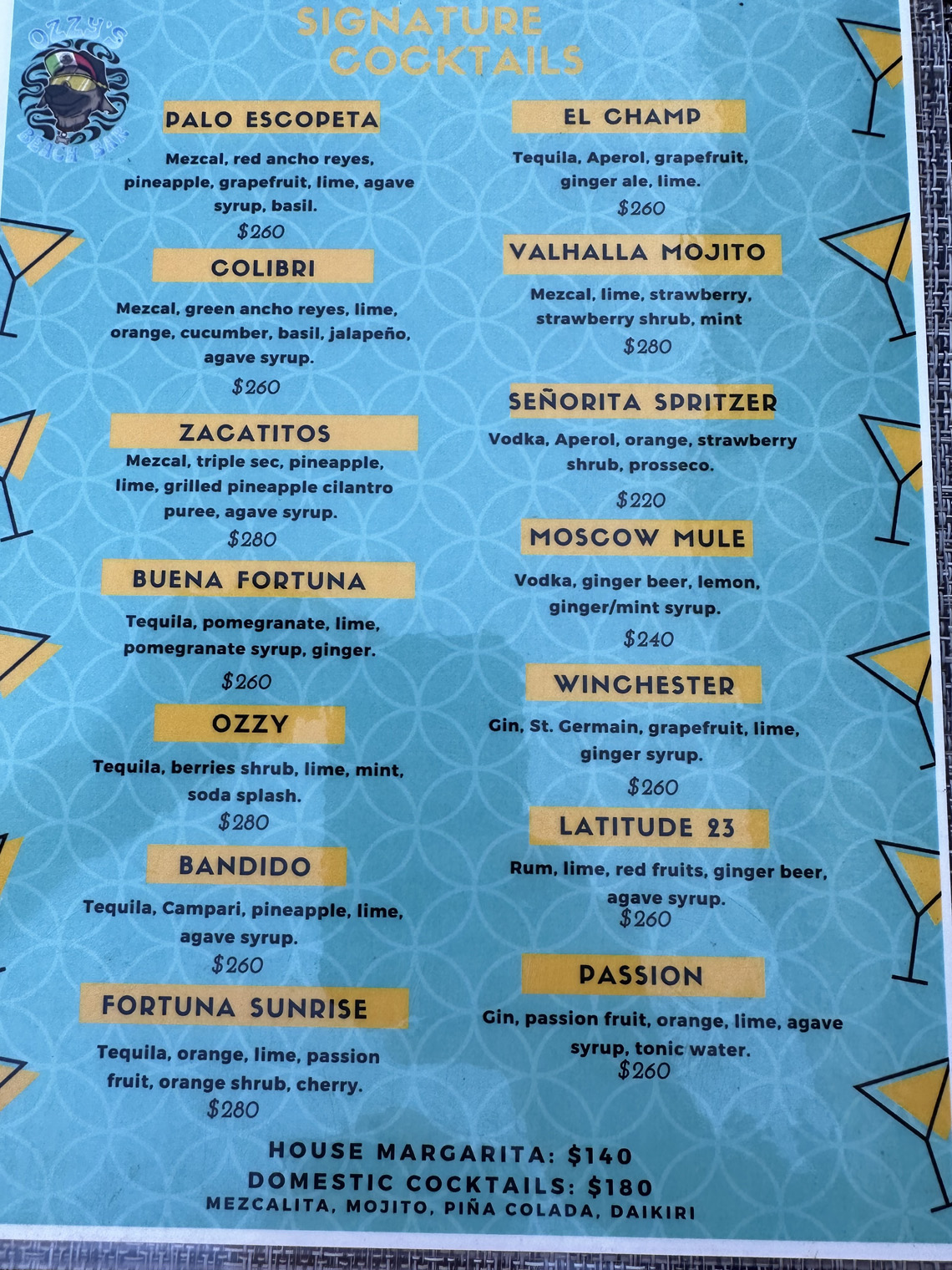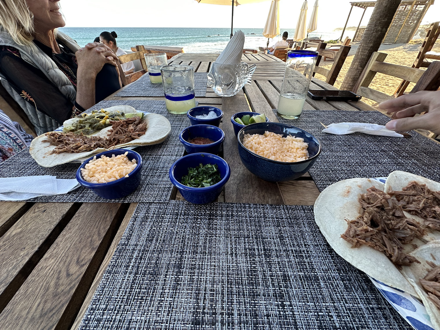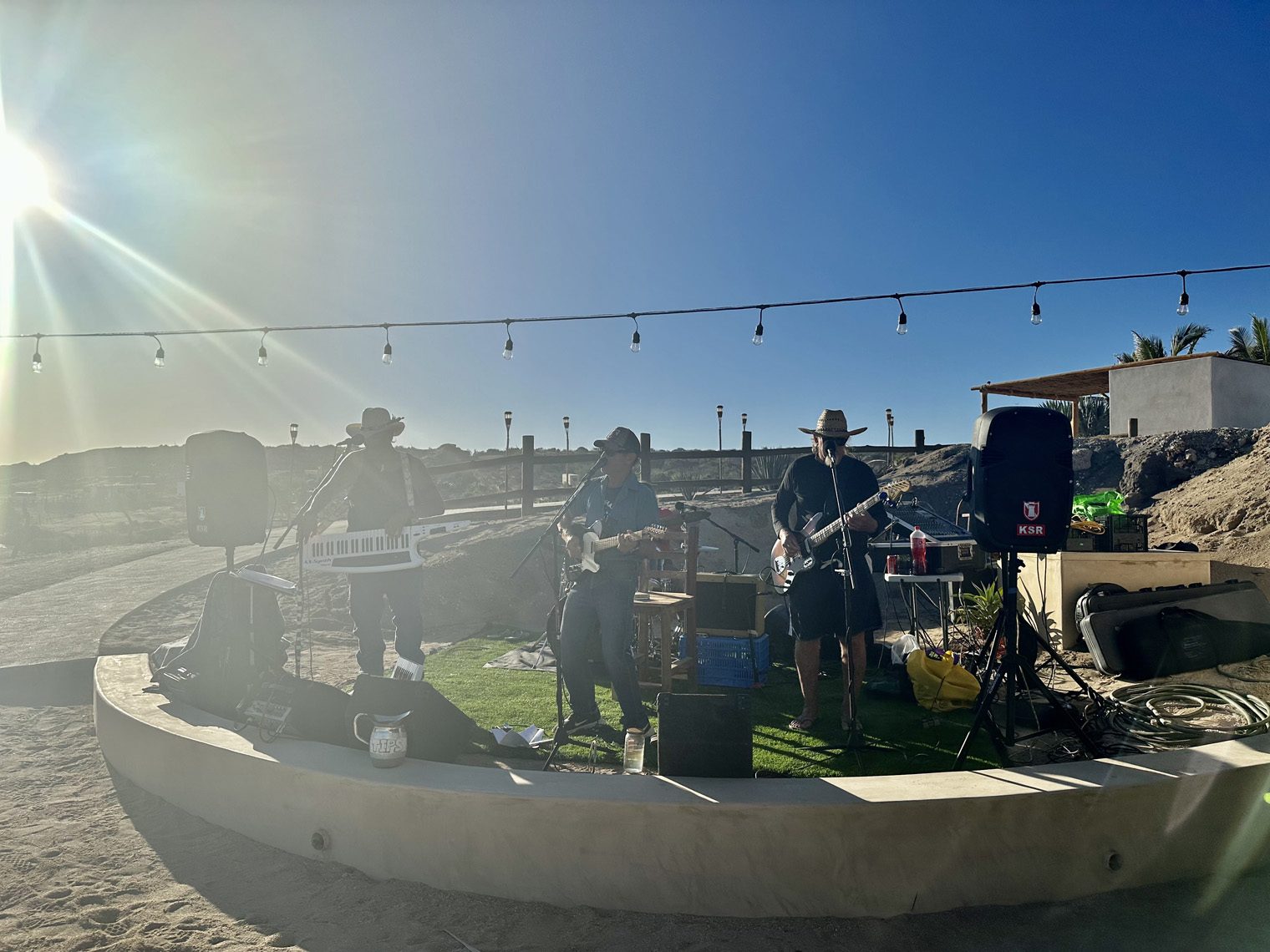 Carrying on the tradition of Zai Sushi, the cocktail menu has drinks named after neighborhoods, dogs and places on the East Cape as well as some well-known cocktails. On the west side of the palapa is a stage for live entertainment. From time to time, Ozzy’s has tacos catered from a local provider. During our visit, the homegrown band from our old neighborhood – The Lost Dogs of Zacatitos – were playing joined by Dan from Extra Large on keyboards. Josh (guitar and vocals), Tim (guitar and vocals) and Chris do a great job with both original tunes and classics.