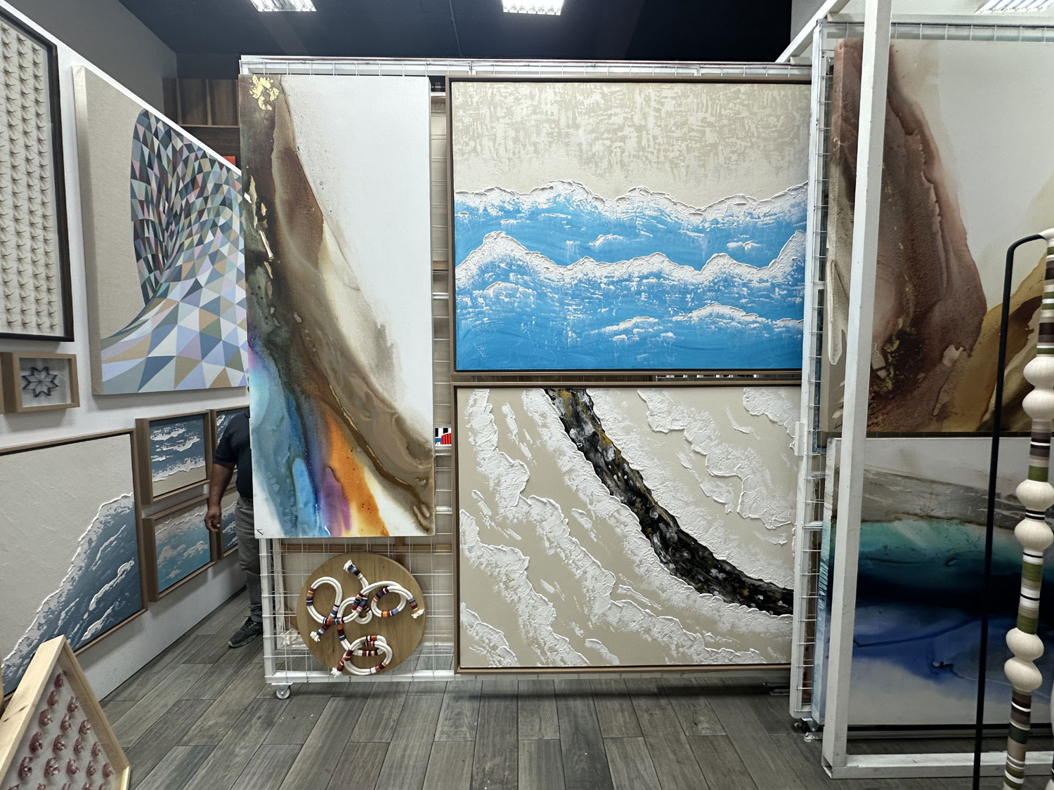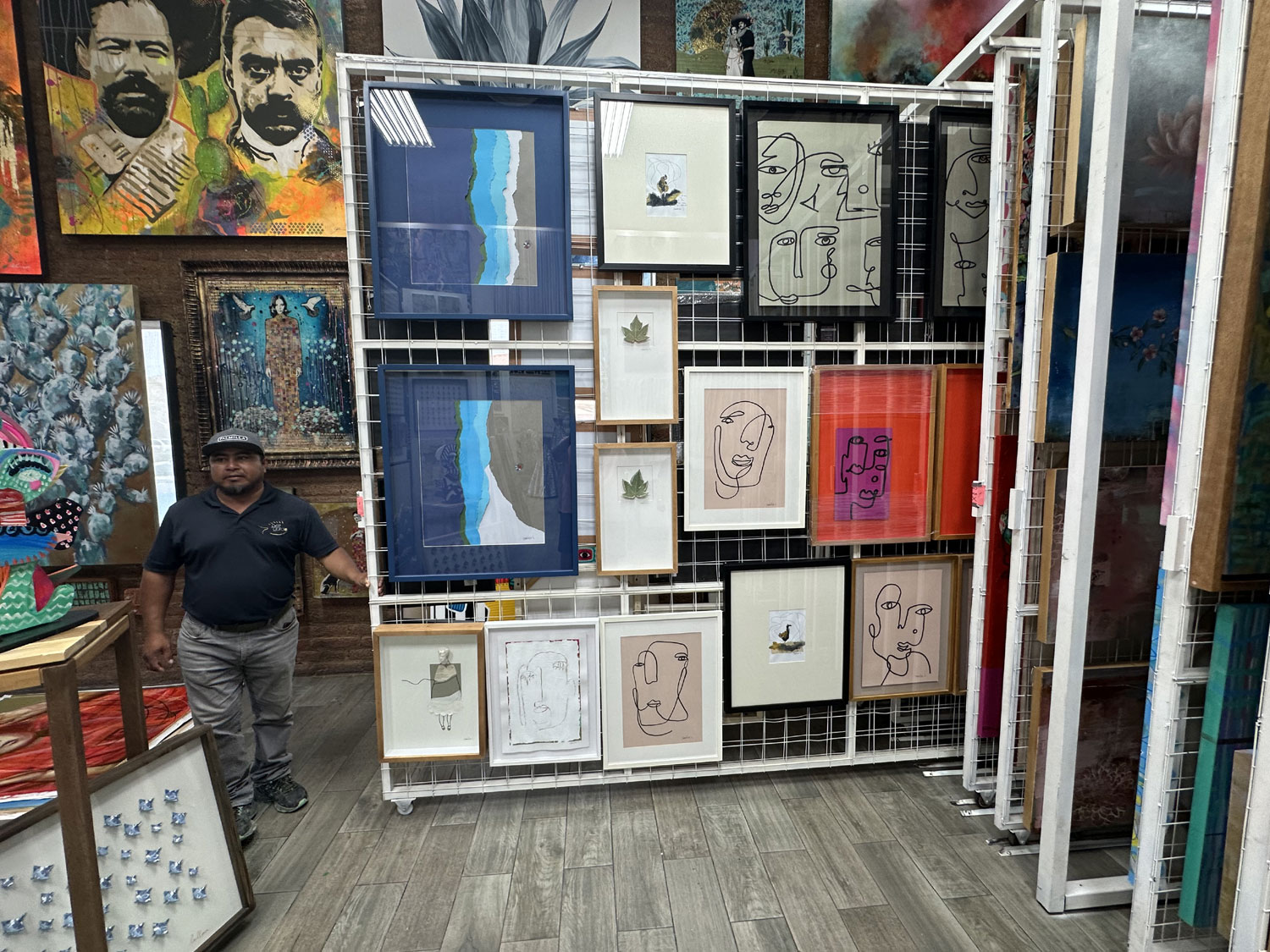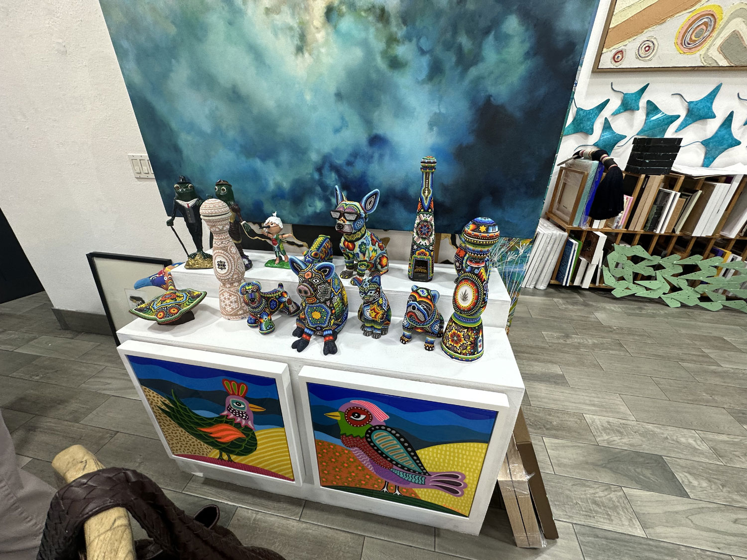 Finding artwork to match the interests of the diverse resident base of Los Cabos is a constant challenge. A stroll through the gallery makes any customer aware of the wide range of option available to them to complement the style and decoration fo their home. Given the diversity of architecture in Los Cabos, it calls for a great diversity in artwork. Pez Gordo Gallery offers bright Mexican style paintings, contemporary and modern works, sculptures, multi-media works, line drawings, fabric artwork, and even Huichol beaded art, ranging from small traditional animals and beaded Claze Azul bottles to two and three-foot-high Huichol sculptures. If you don’t see exactly what you want on the walls, or sitting on the floor or display pieces there are about 10 pull-out racks with artwork on each side. The artwork also ranges in size to adorn the smallest or the largest space in your home.