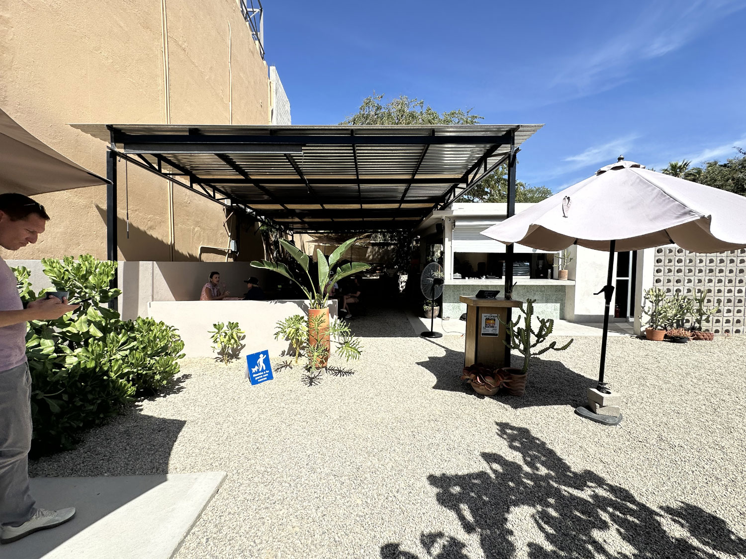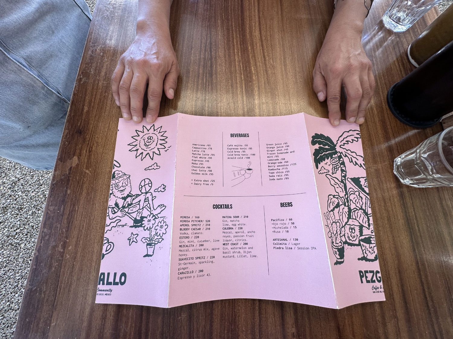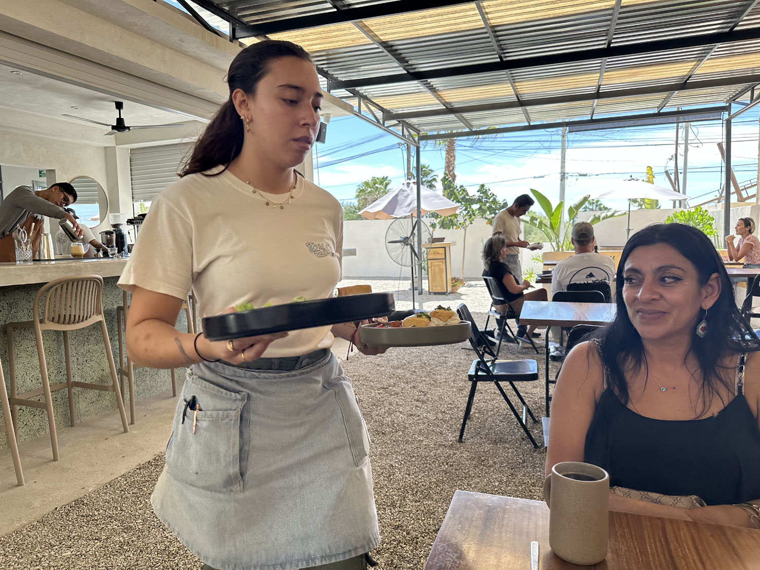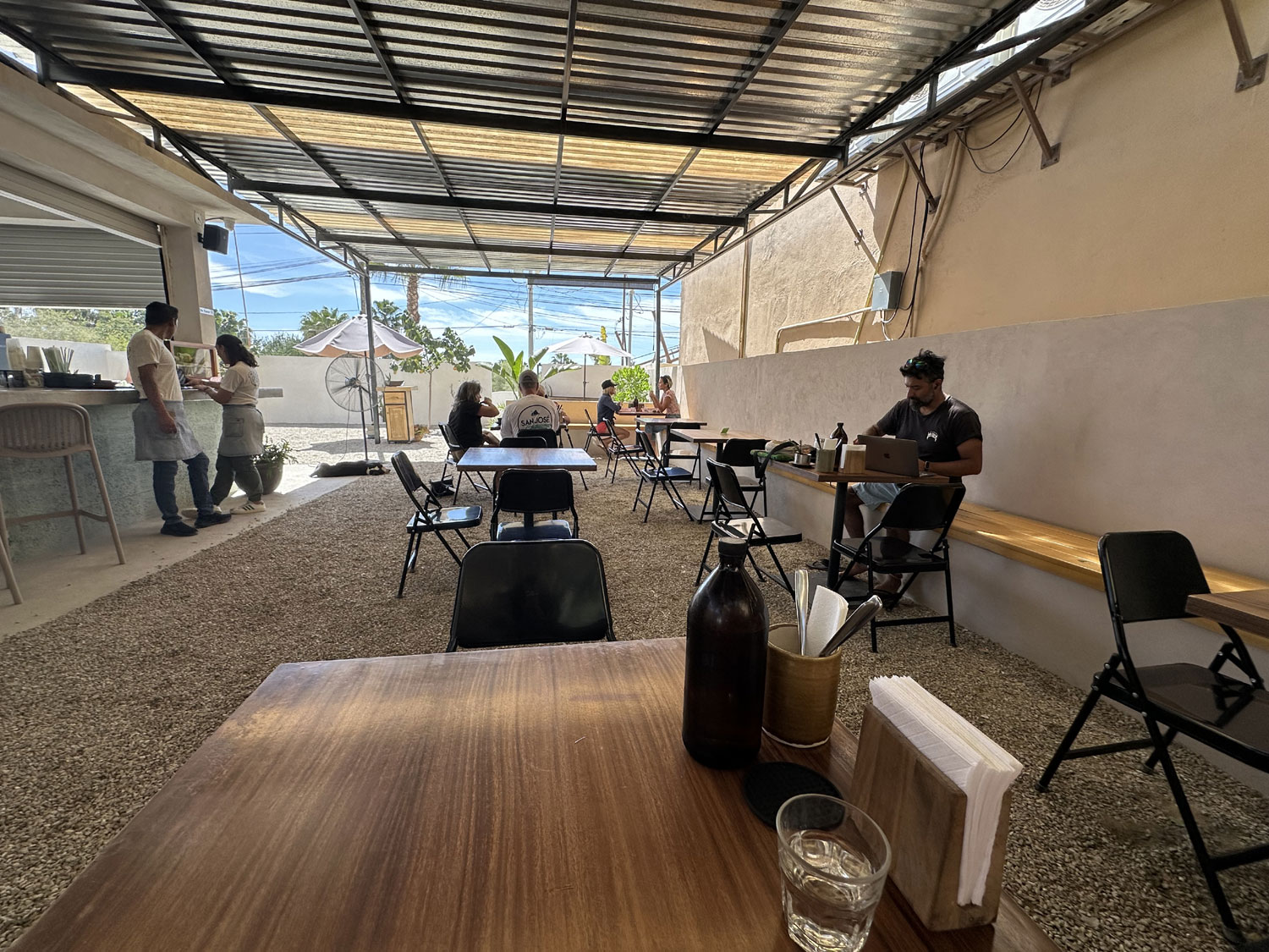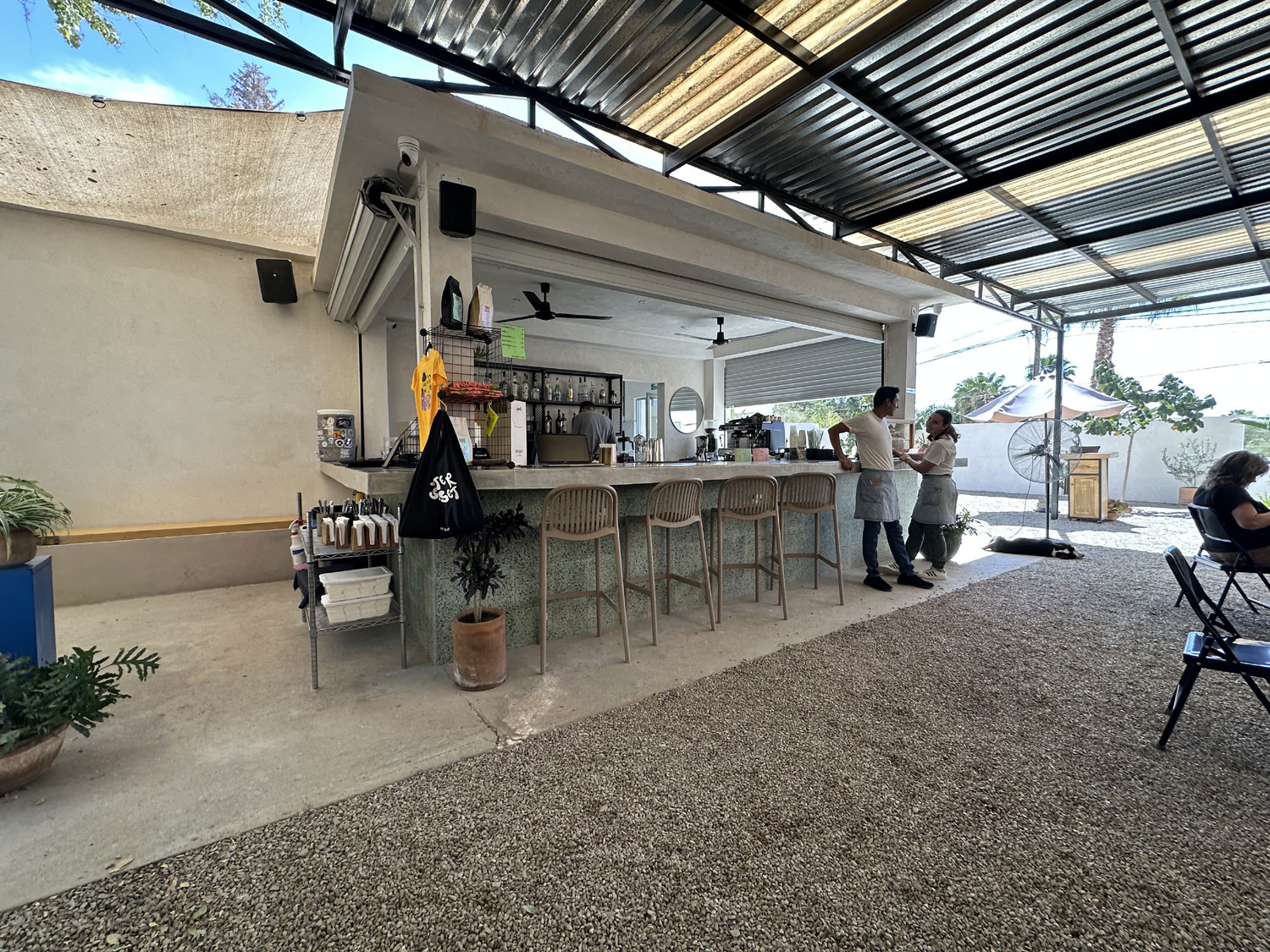 Located near the Pemex station in La Choya, Pezgallo is a great restaurant for breakfast. Pezgallo is not new to San Jose del Cabo, it opened about five years ago in La Playita and later moved to Plaza Mijares in San Jose del Cabo, and now is back on the other side of the arroyo. Walking up the ramp that leads to the entrance to Pezgallo, you see an outdoor restaurant with a gravel floor. The main dining area is covered with a corrugated metal roof. An upper dining area has fabric covers to protect from the sun. The seating includes built-in concrete benches with wood top around the outside and comfortable tables and chairs. There is a large bar with a kitchen behind. Gustavo, the owner greets many of his guests, and the restaurant was quite busy at 10:00 am in the middle of the week.