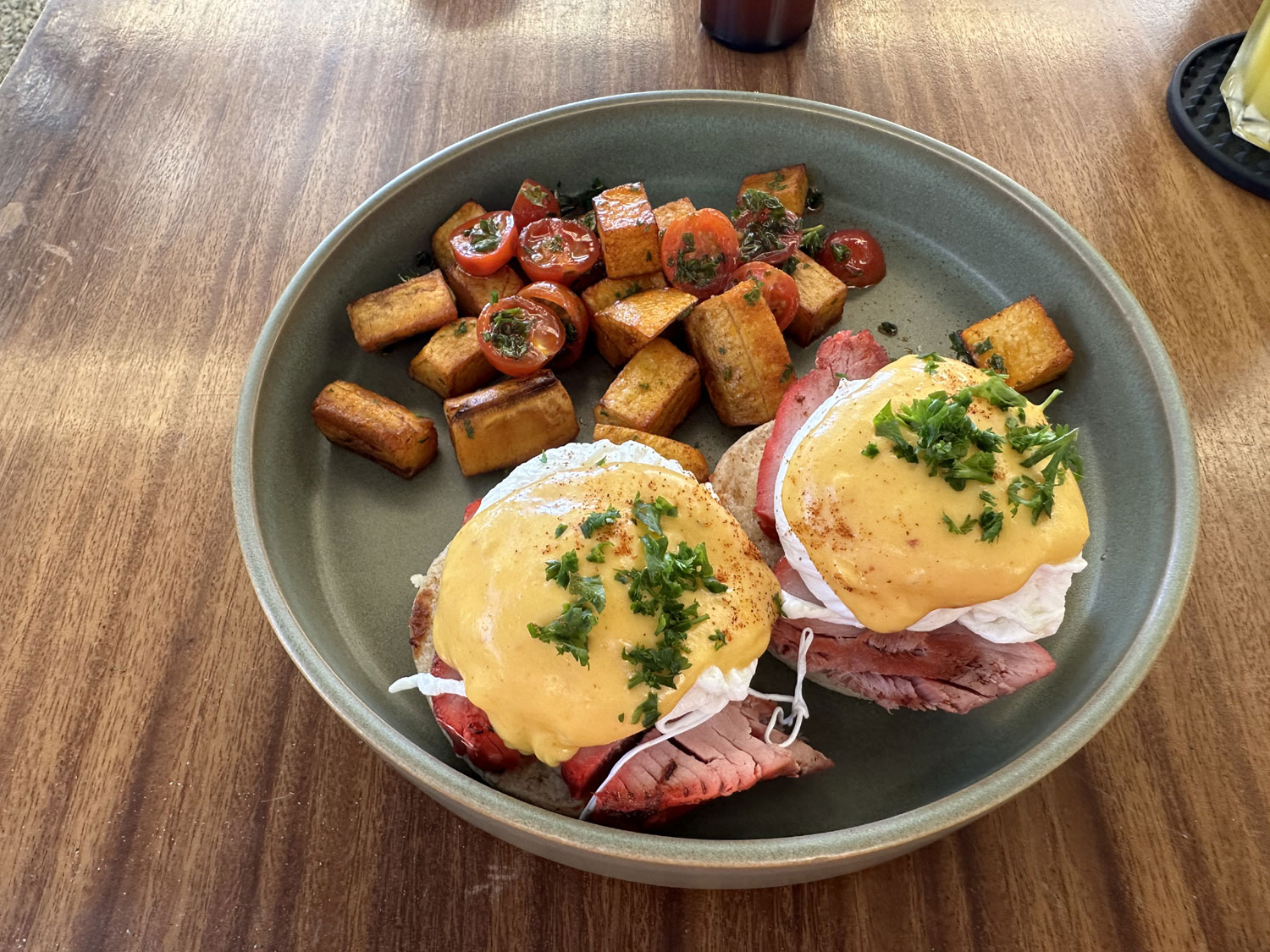 Our server was great and I knew her from another place where she works at night. I ordered an orange juice and the Tuna Benedict. Rosy selected the Huevos Ranchero. The Huevos Ranchero were served on a corn tortilla with beans, fresh bread, salsa, cheese, cilantro, and onions. Rosy said they were excellent. The Tuna Benedict included two poached eggs with hollandaise sauce on English muffins with thick pieces of smoked tuna. There were served with potatoes and tomatoes – excellent.