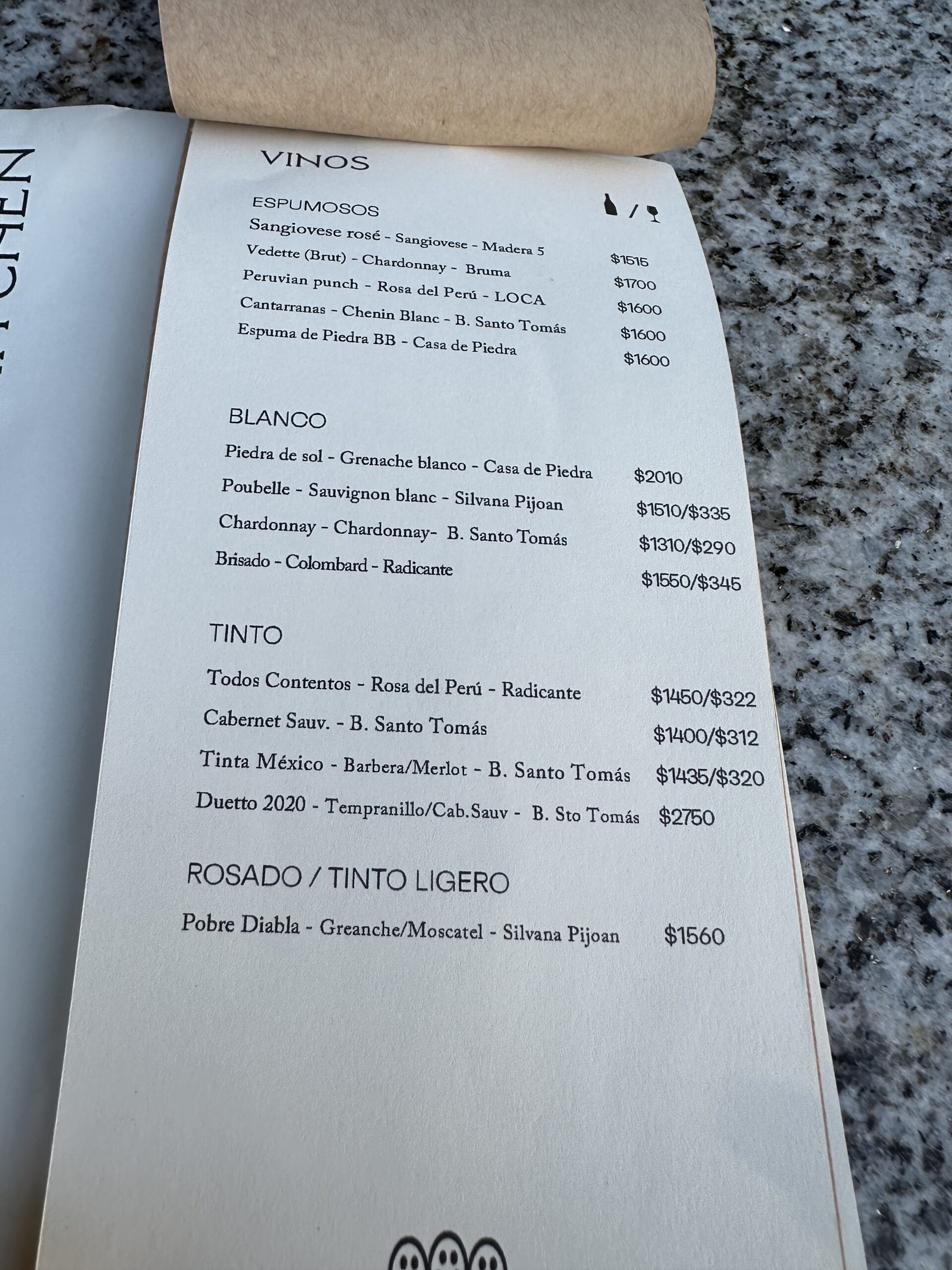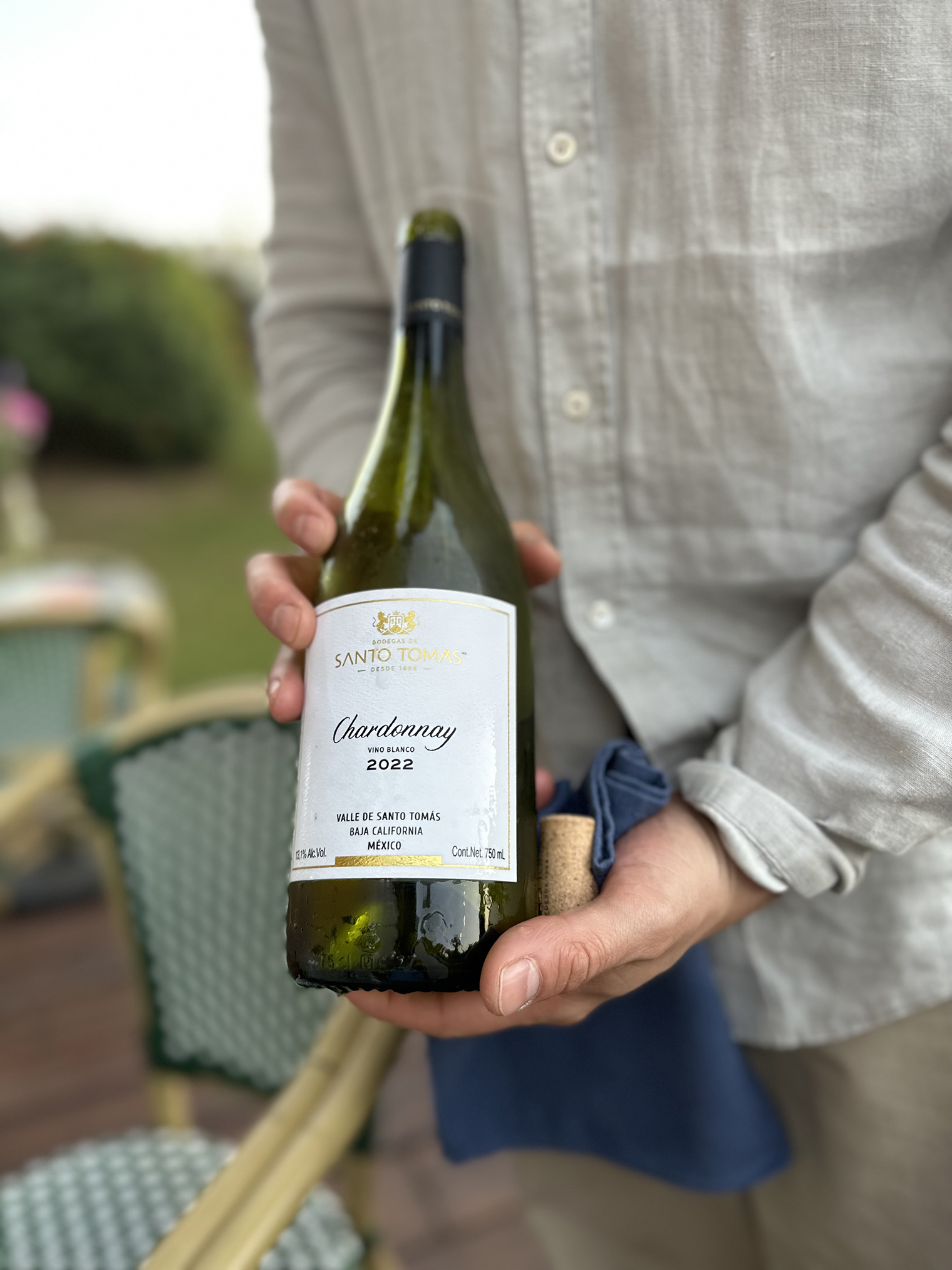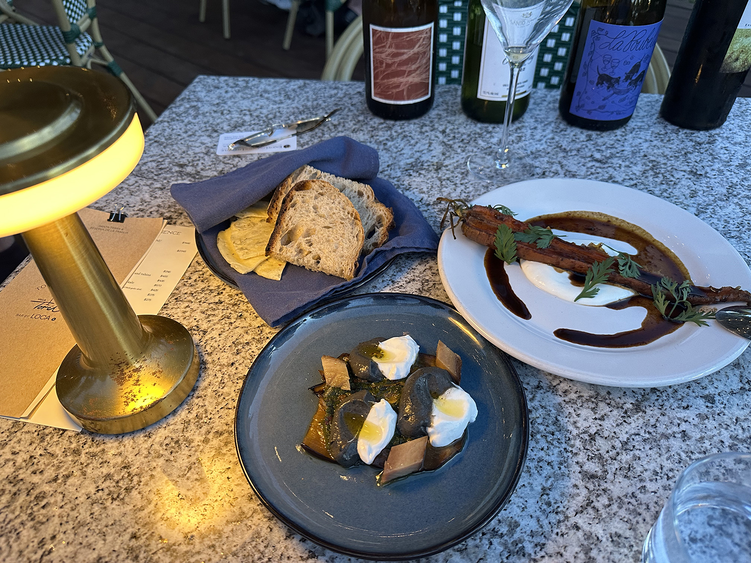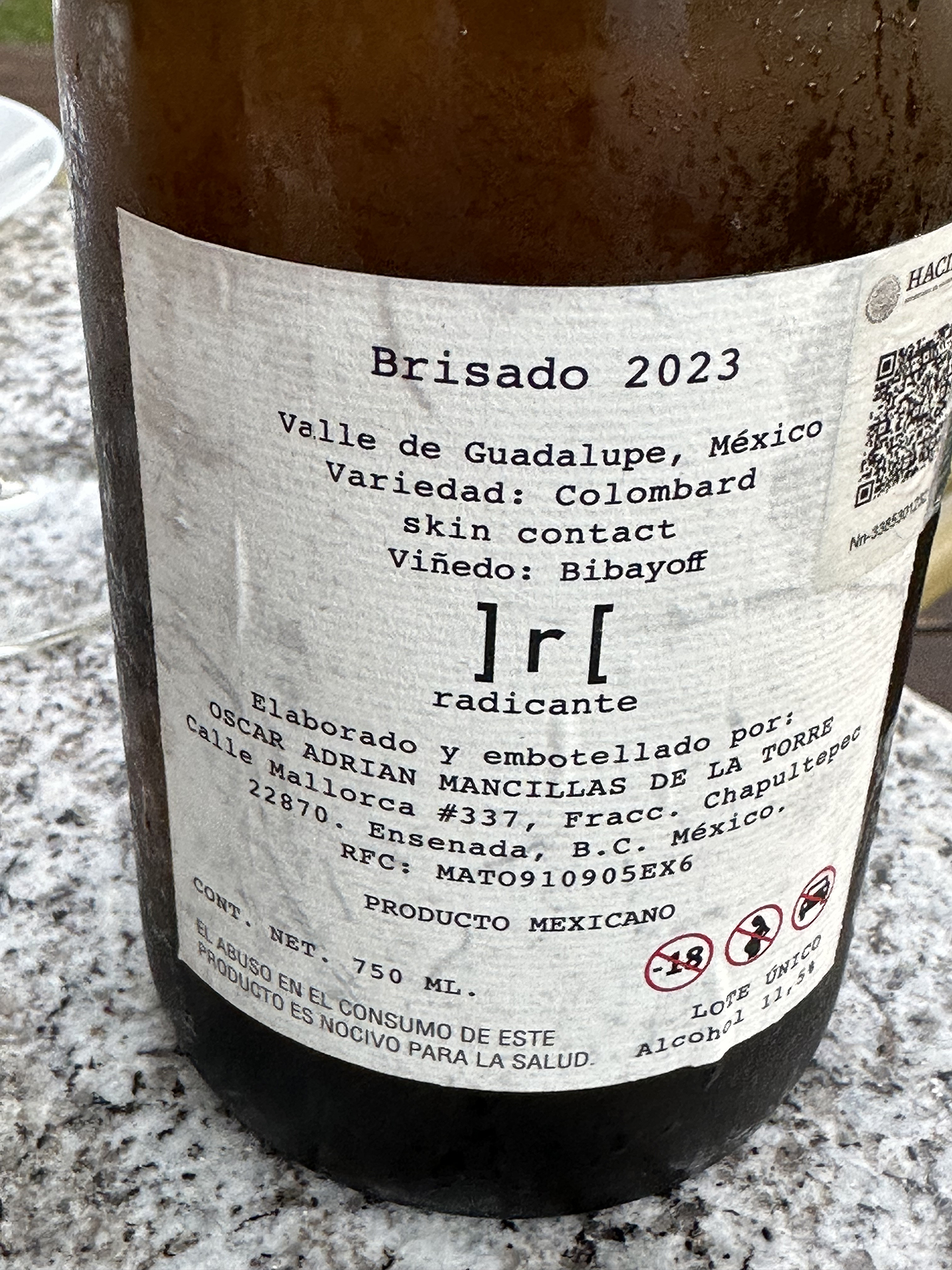 Before the next tasting items came out, Martin explained how Chef Alfredo loves to serve several items tapa style to the table, whether at the restaurant or at home for people to share. So the next selections included the bluefin tuna tartar, which had be aged for five days on a base of rhubarb, tahini, onions and a middle eastern dip called labneh made with a yoghurt base. The tuna was served with large tortilla style chips. The combination of flavors was truly astounding. I could have easily devoured a very large plate of this. It was paired with pickled mussels and sourdough bread. At this point, Martin started to introduce me to white wines from the Valle de Guadalupe. The four wines – La Poubelle Sauvignon Blanc 2022, Brisado Columbard 2023, Santo Tomas Chardonnay 2022 and a Pierda de Sol Grenache 2022 – each with its own flavor.