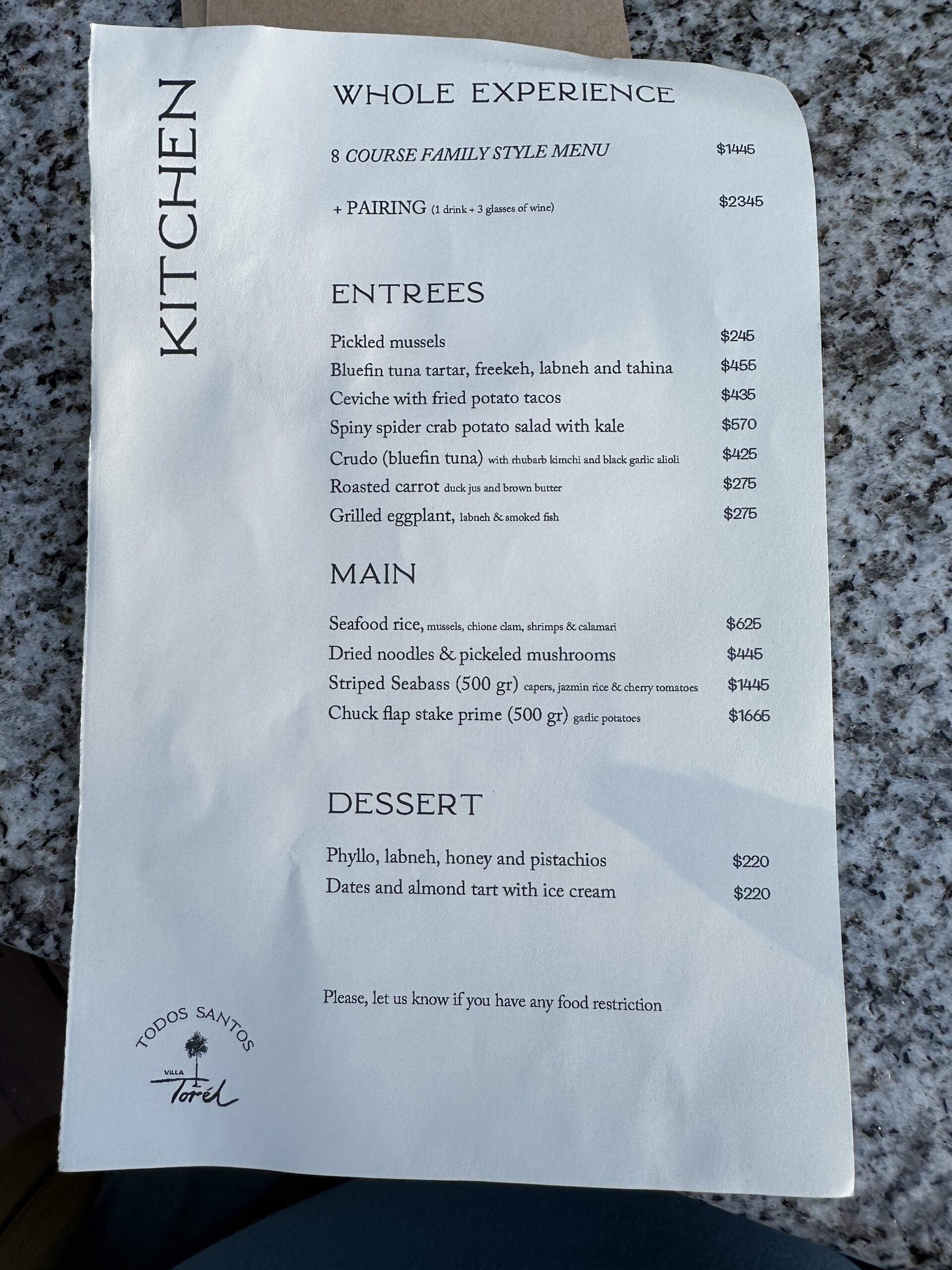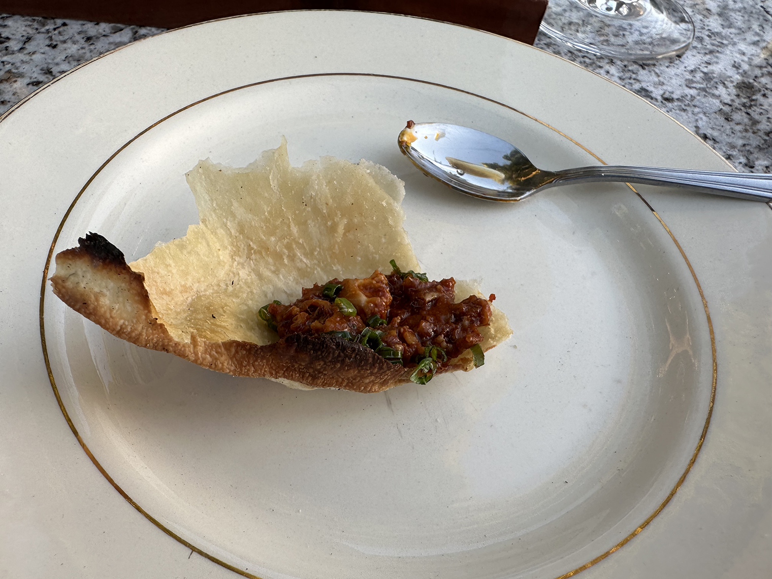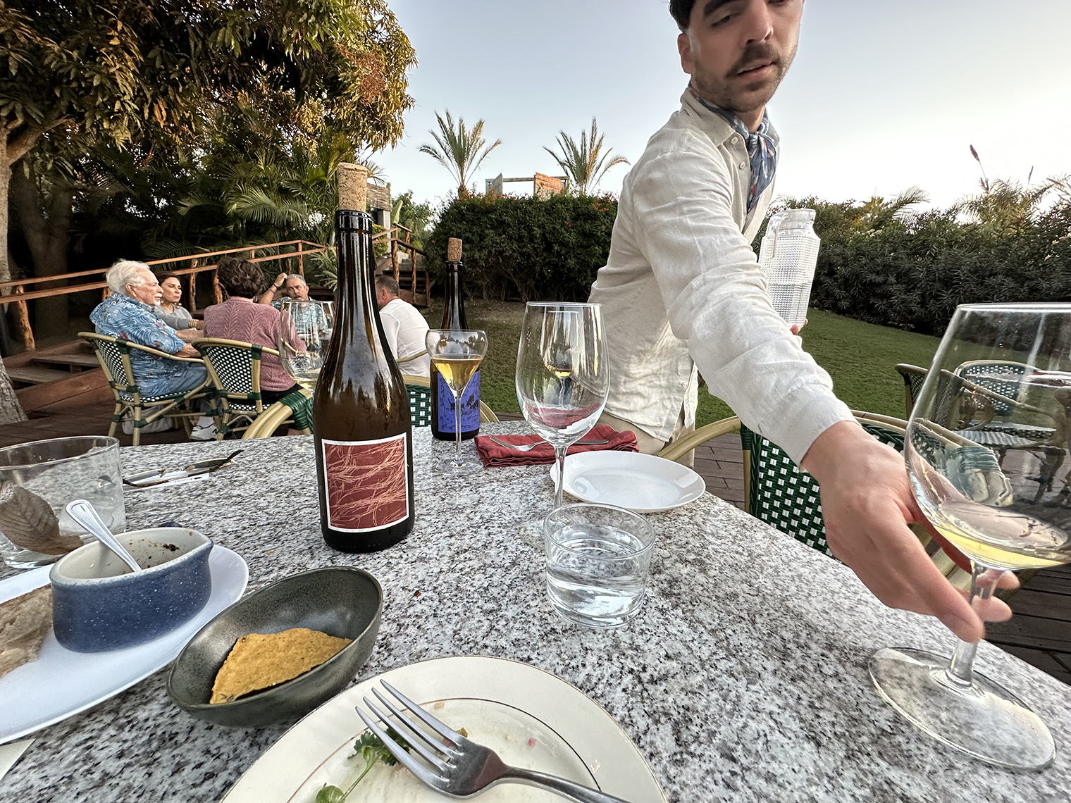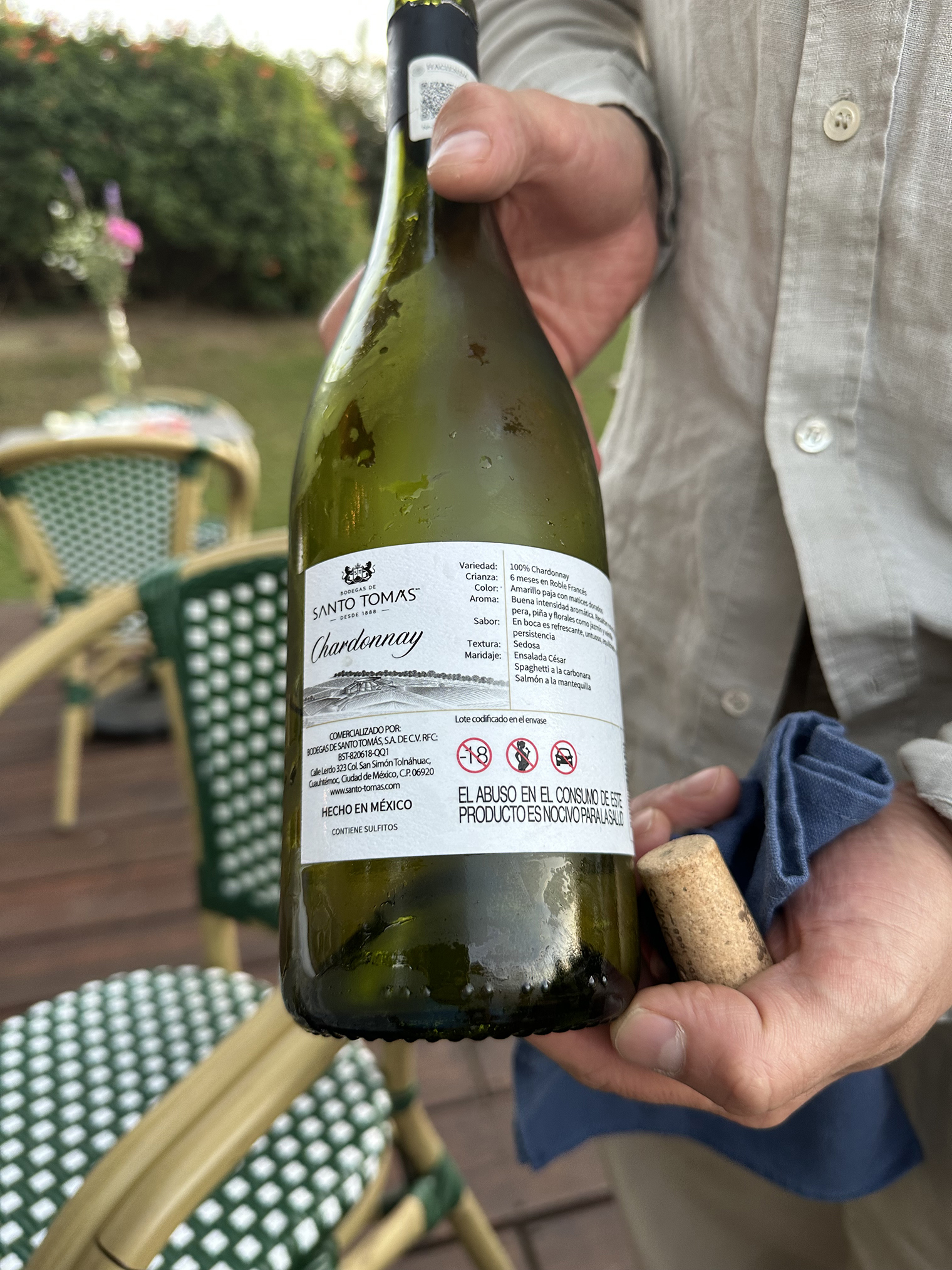 Before the next tasting items came out, Martin explained how Chef Alfredo loves to serve several items tapa style to the table, whether at the restaurant or at home for people to share. So the next selections included the bluefin tuna tartar, which had be aged for five days on a base of rhubarb, tahini, onions and a middle eastern dip called labneh made with a yoghurt base. The tuna was served with large tortilla style chips. The combination of flavors was truly astounding. I could have easily devoured a very large plate of this. It was paired with pickled mussels and sourdough bread. At this point, Martin started to introduce me to white wines from the Valle de Guadalupe. The four wines – La Poubelle Sauvignon Blanc 2022, Brisado Columbard 2023, Santo Tomas Chardonnay 2022 and a Pierda de Sol Grenache 2022 – each with its own flavor.