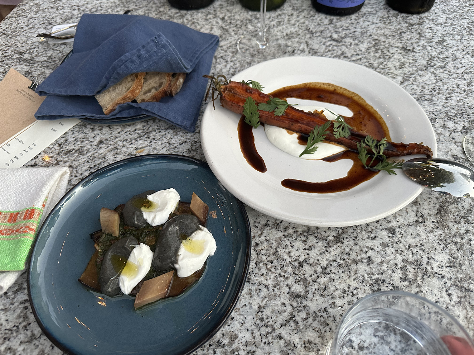 The next two small appetizer dishes to be served were half of a large roasted carrot with duck juice and brown butter and grilled eggplant again with labneh and small pieces of fish. The carrot was offered with more sourdough bread and the eggplant with small triangles of pita and both had dabs of an interesting heavy cream. Chef Alfredo was pairing items to provide a contrast of different flavors on the table at the same time.